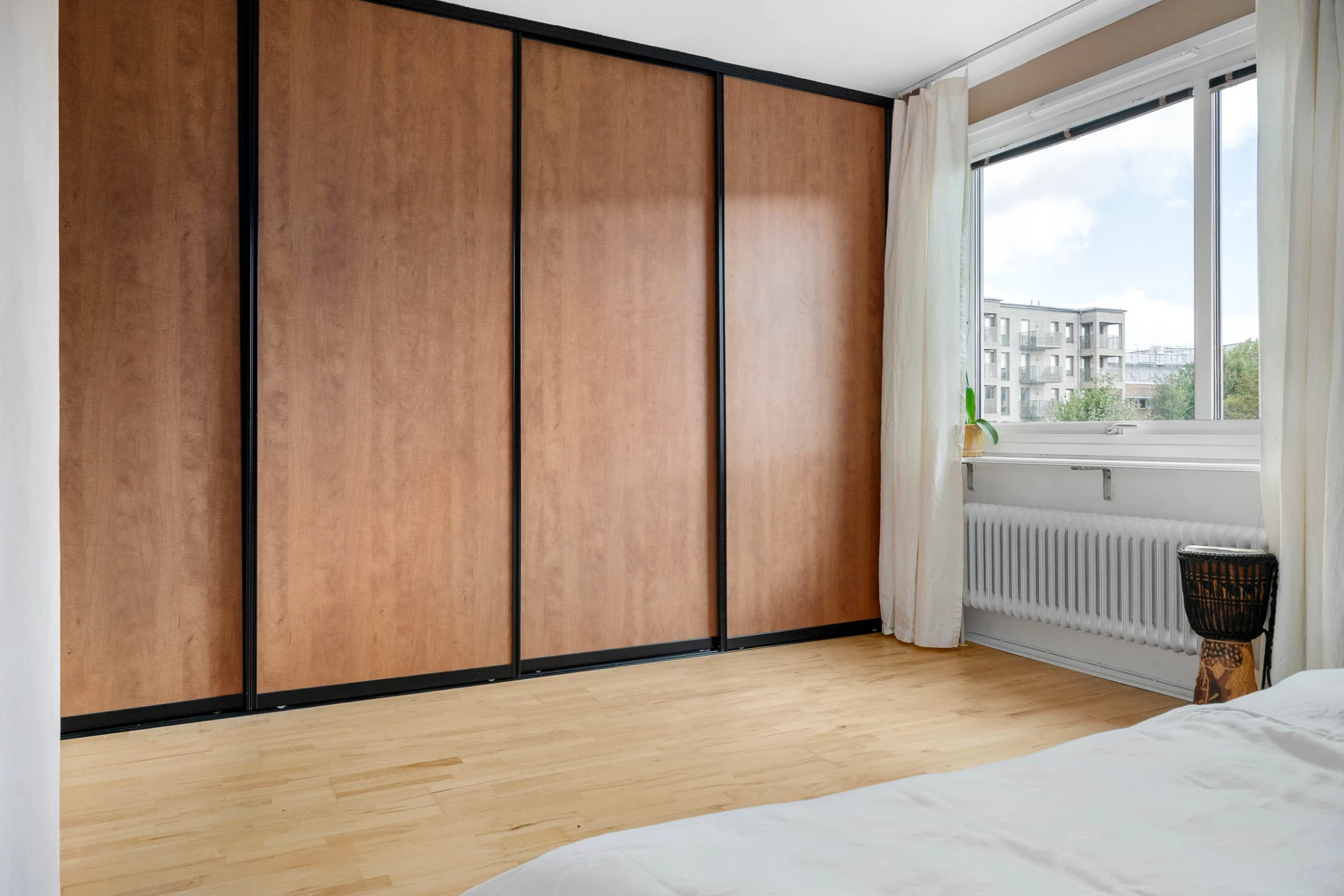 Lägenhetens stora sovrum med inbyggda garderober. Ljus ekparkett och ljusa väggar, fönster som vetter ut mot öst med fönsterbräde i marmorerad sten.
