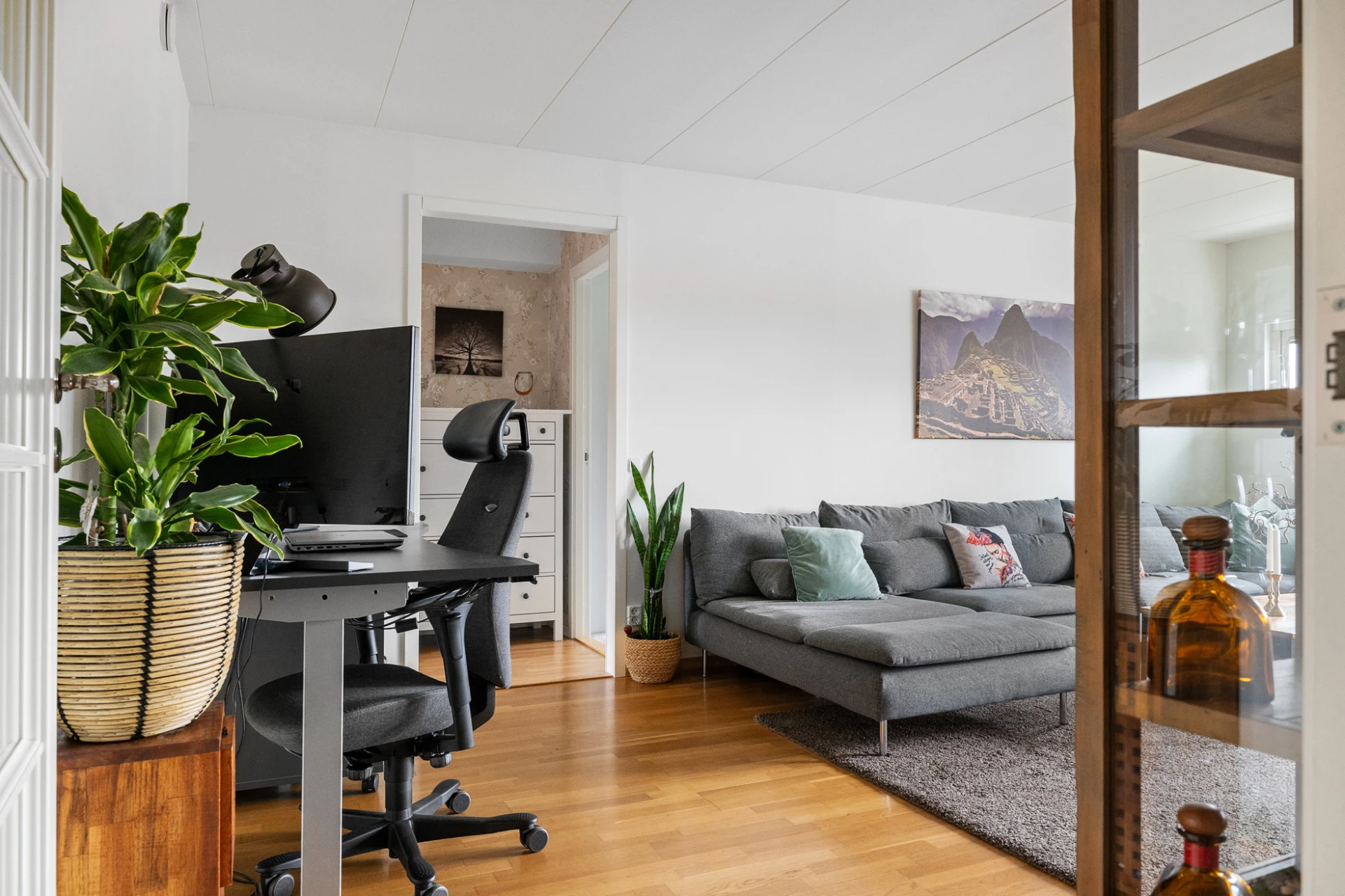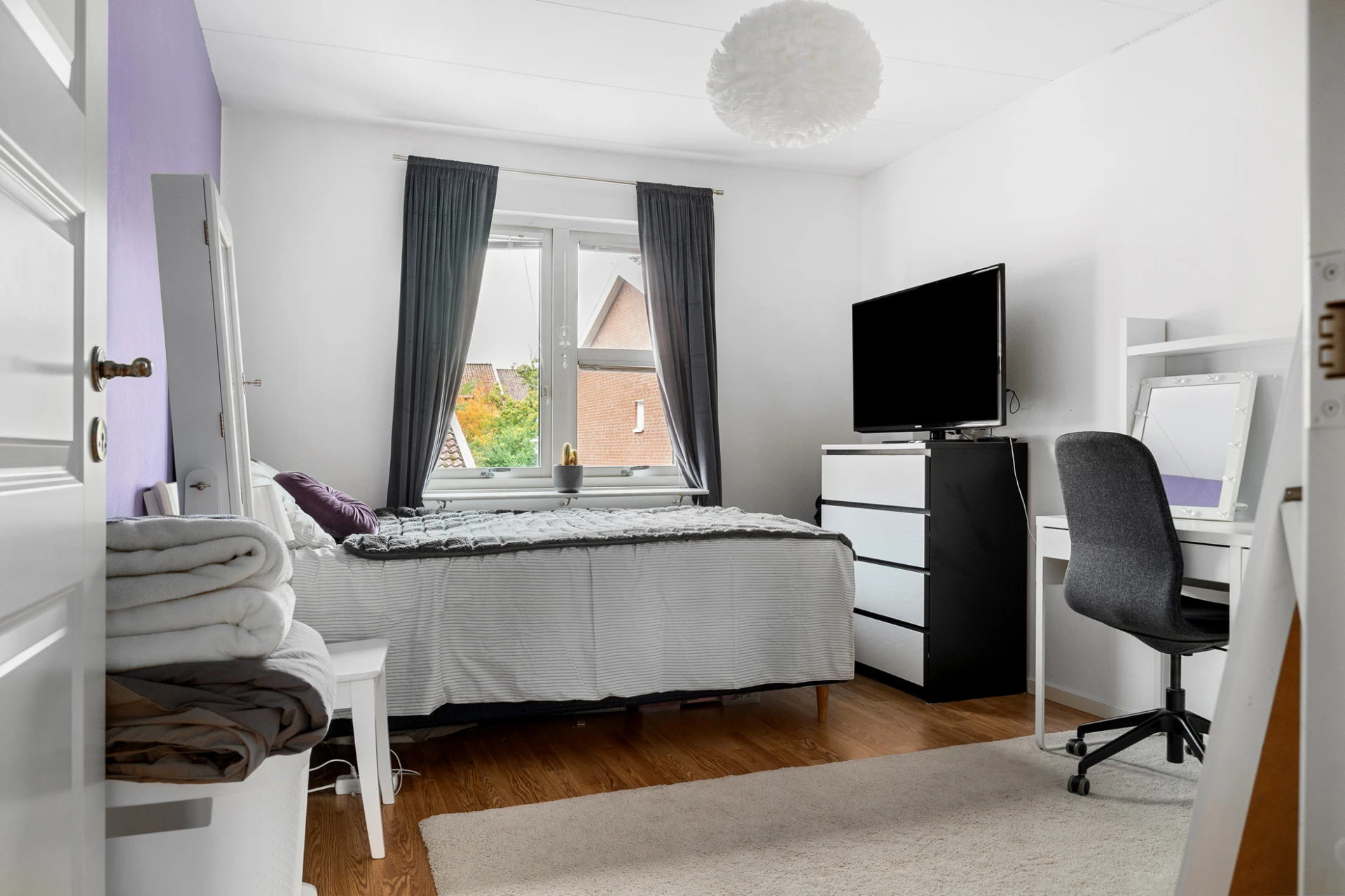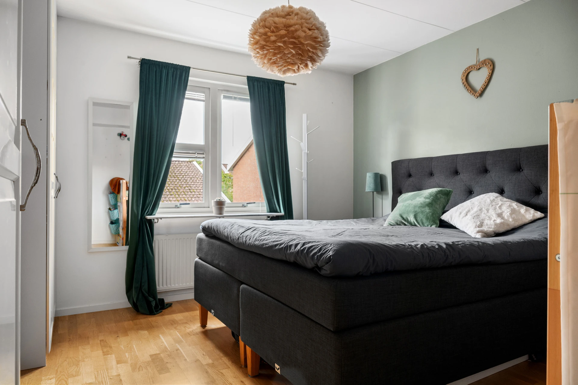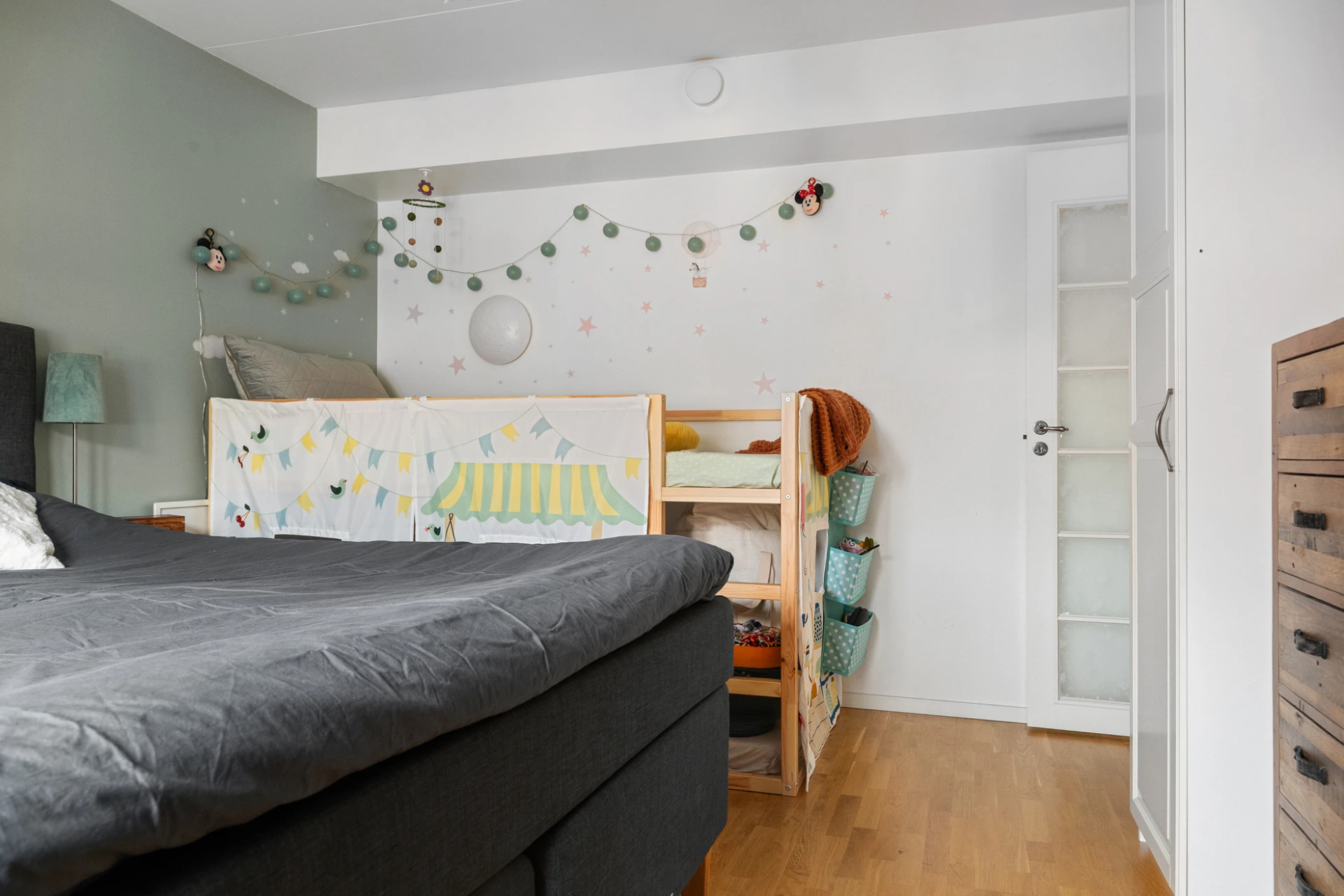 Parkettgolv och vita väggar samt mintgrön fondvägg. Förvaring i garderob.