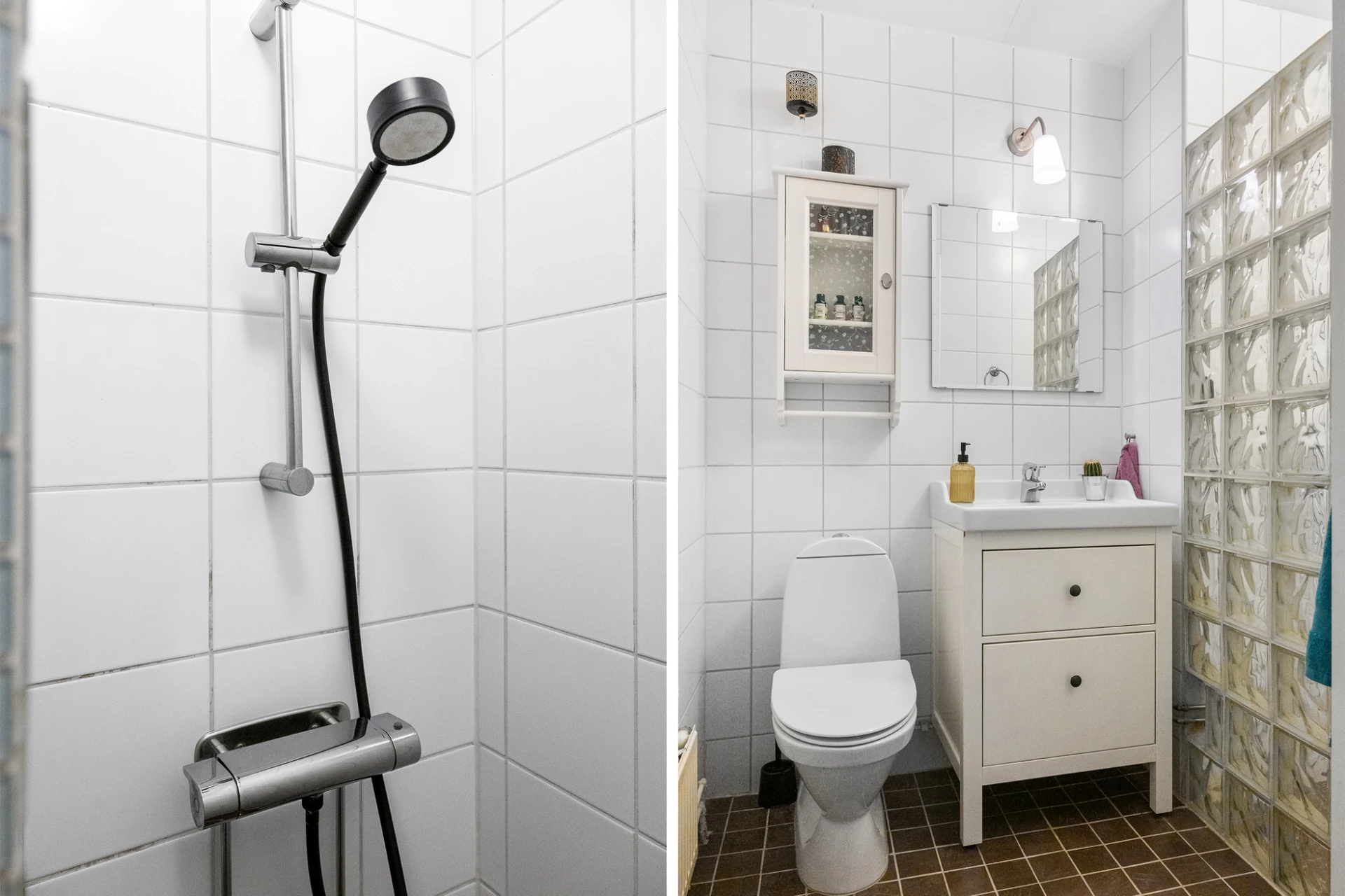 Brunt klinker och vitt kakel. Badrummet är inrett med WC, handfat med kommod, spegel och dusch samt vägghängt förvaringsskåp.
