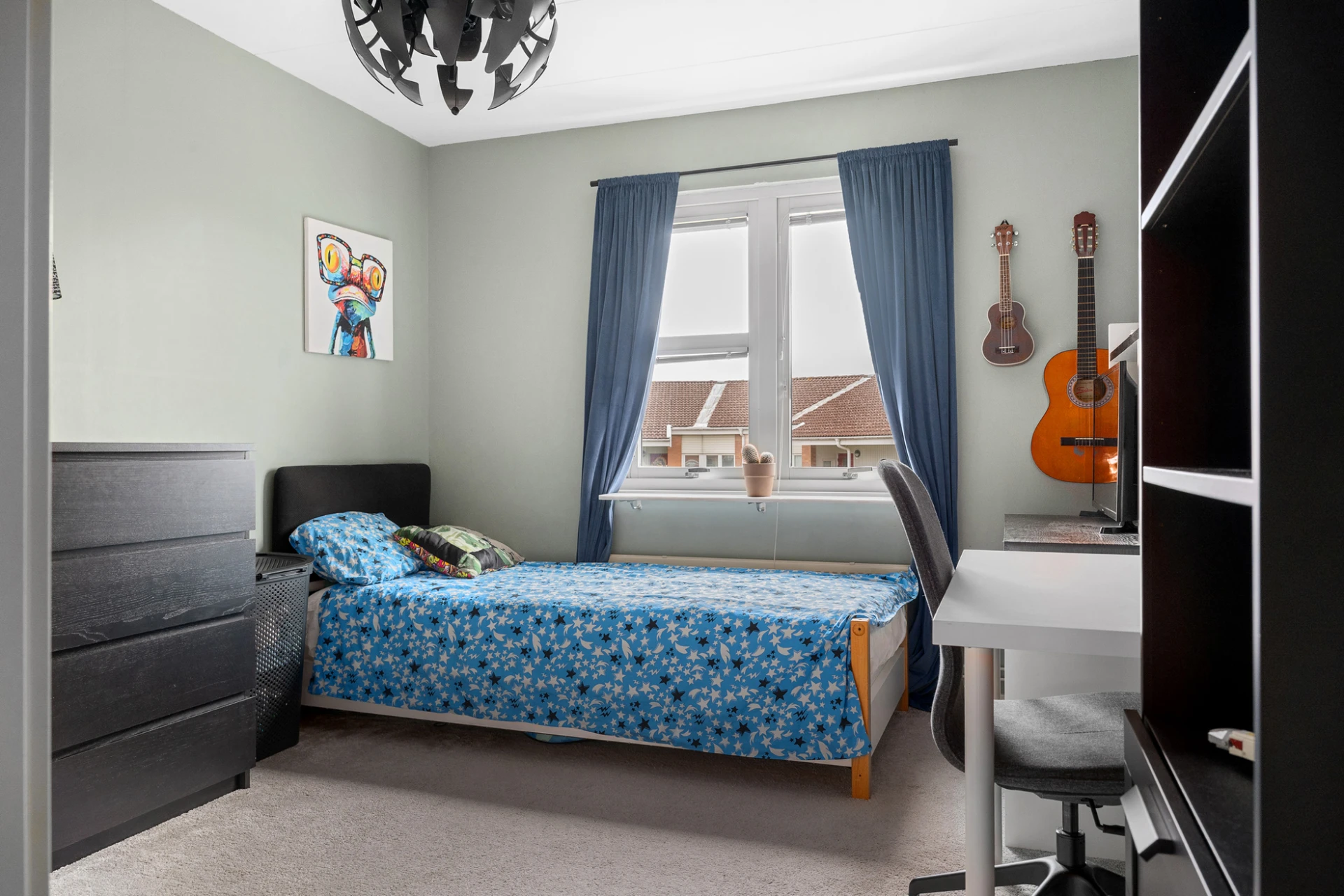Grå heltäckningsmatta och mintgröna väggar.