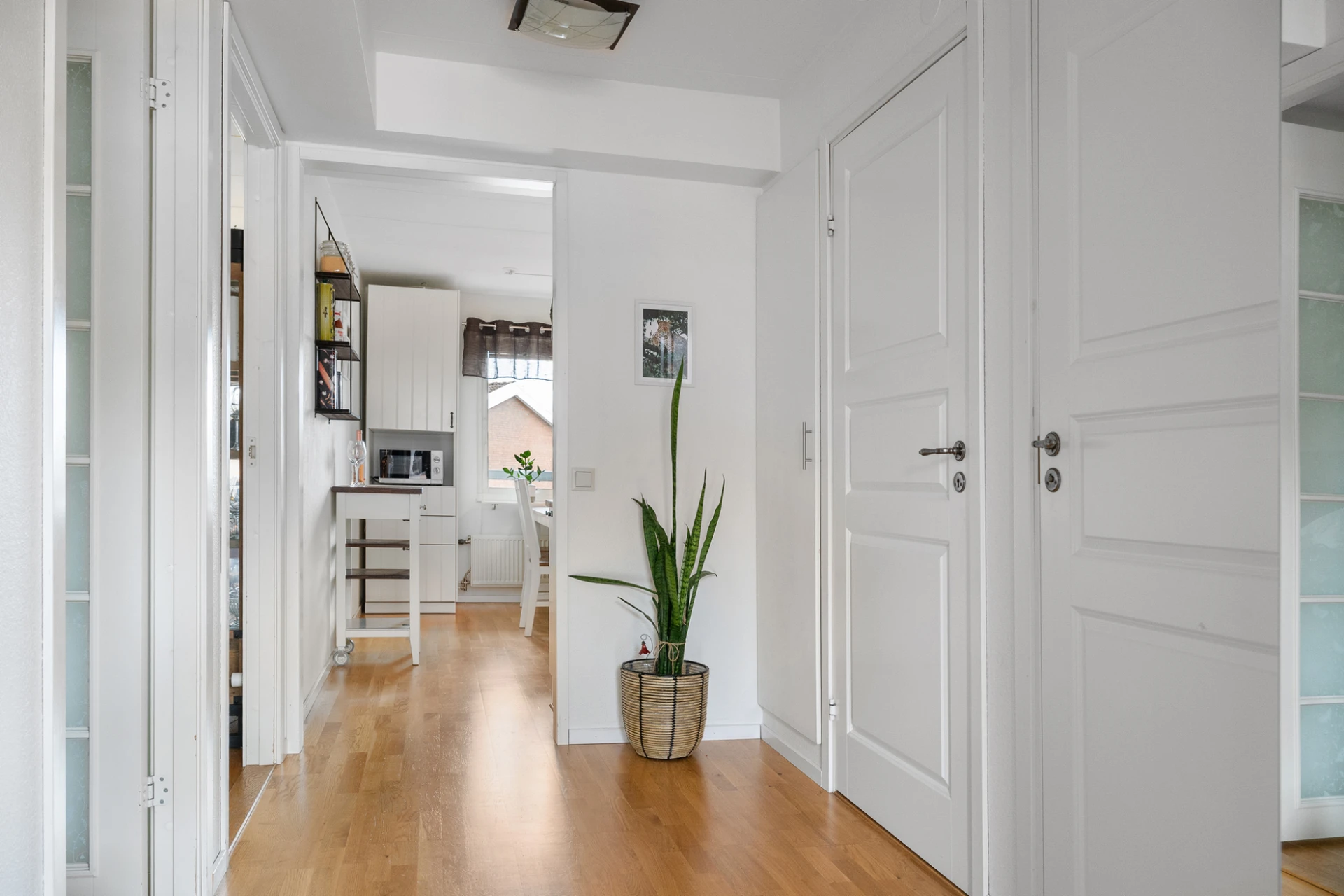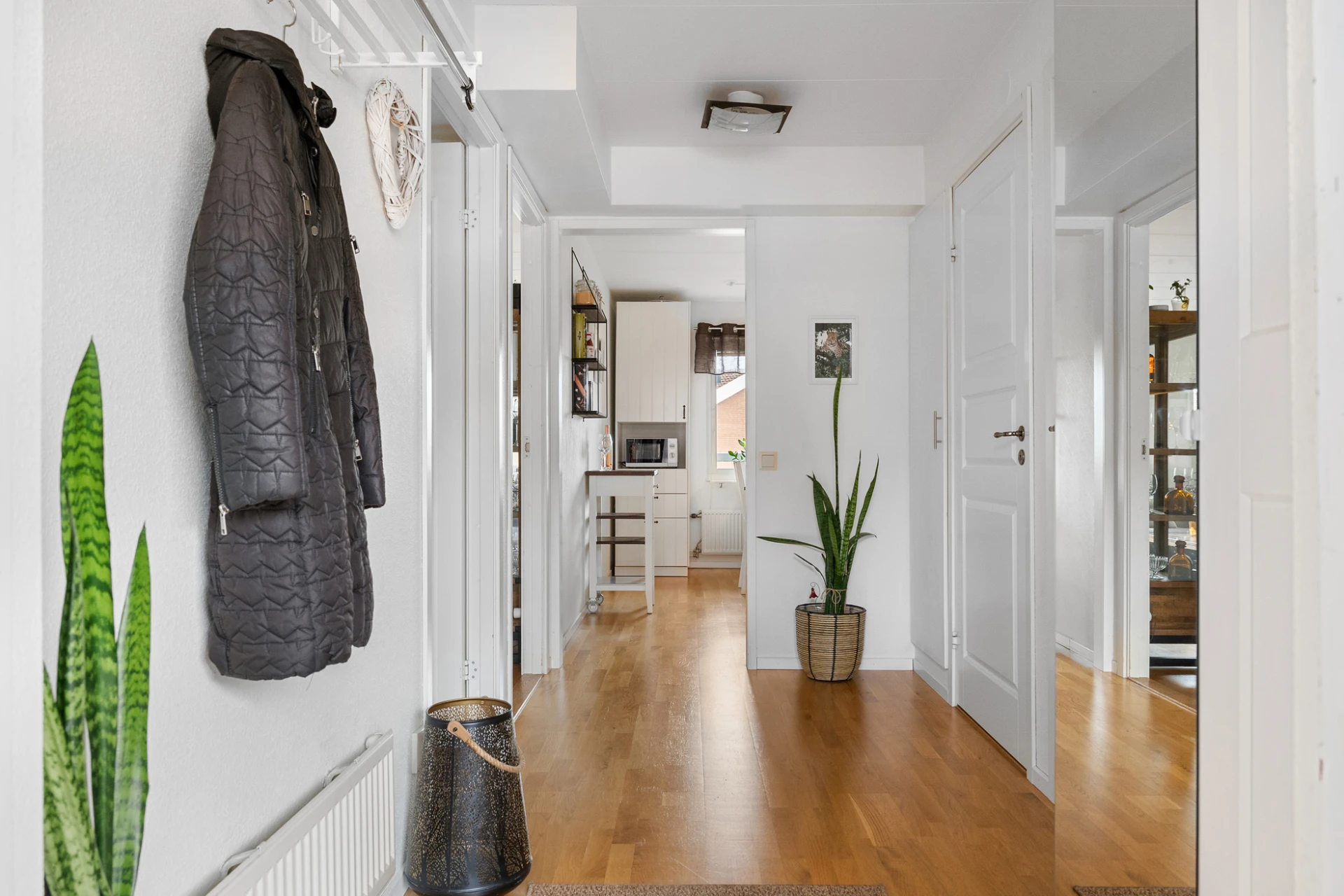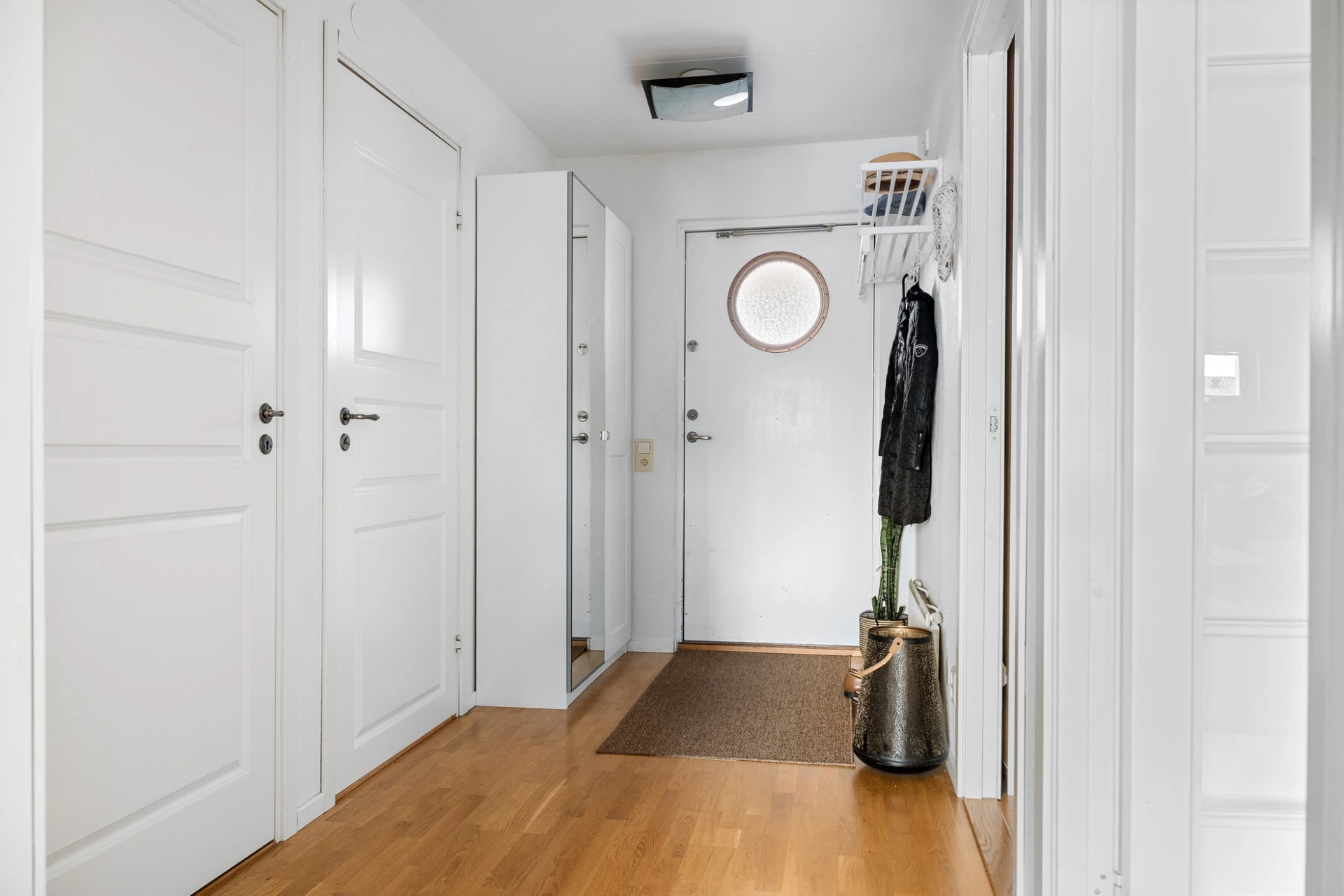 Parkettgolv och vita väggar. Plats för avhängning och förvaring i garderob.