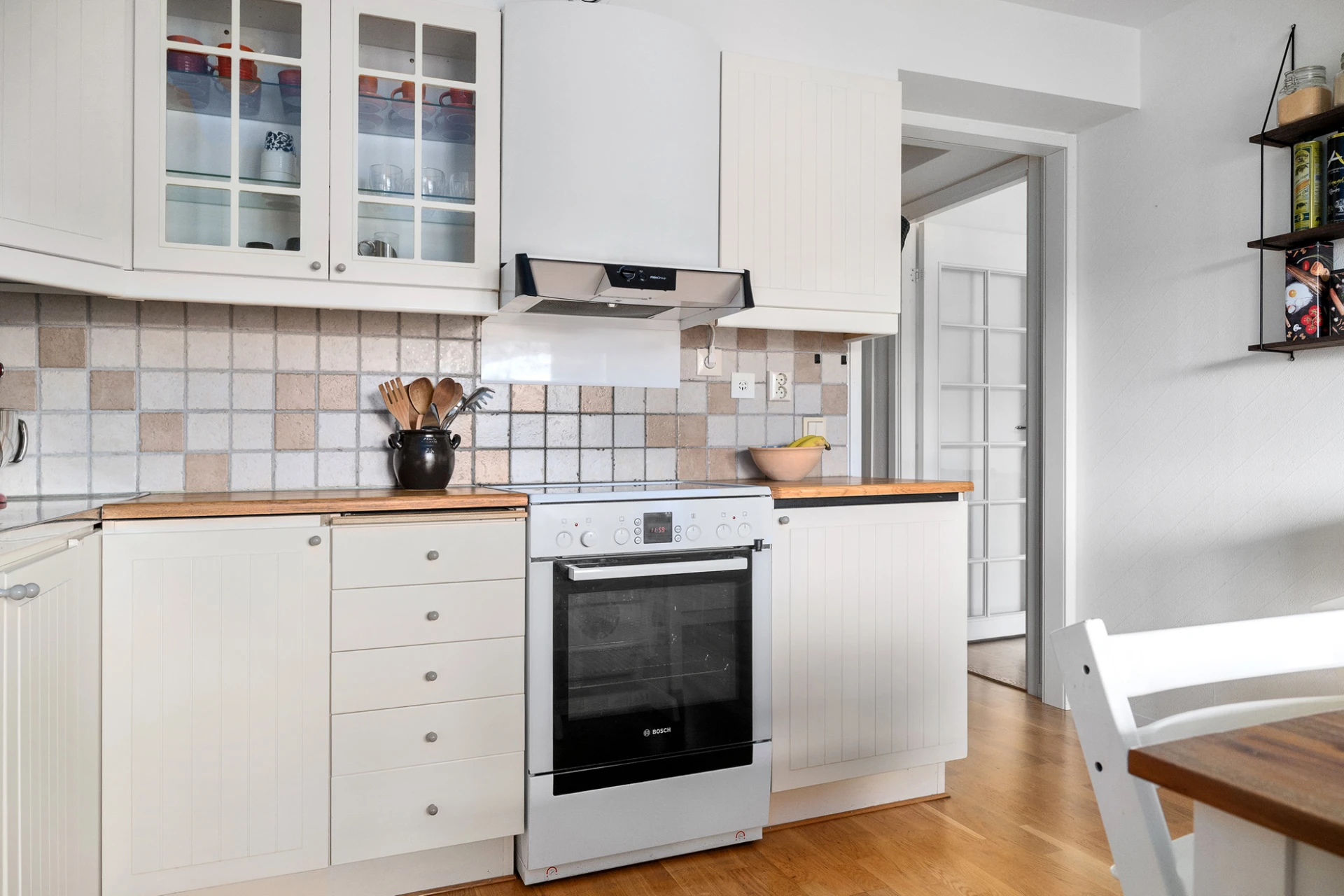Parkettgolv och vita väggar. Vit köksinredning och beige kakel ovan bänkskiva i trä och rostfritt. Köket är utrustat med kyl, frys, spis, fläkt och diskmaskin.