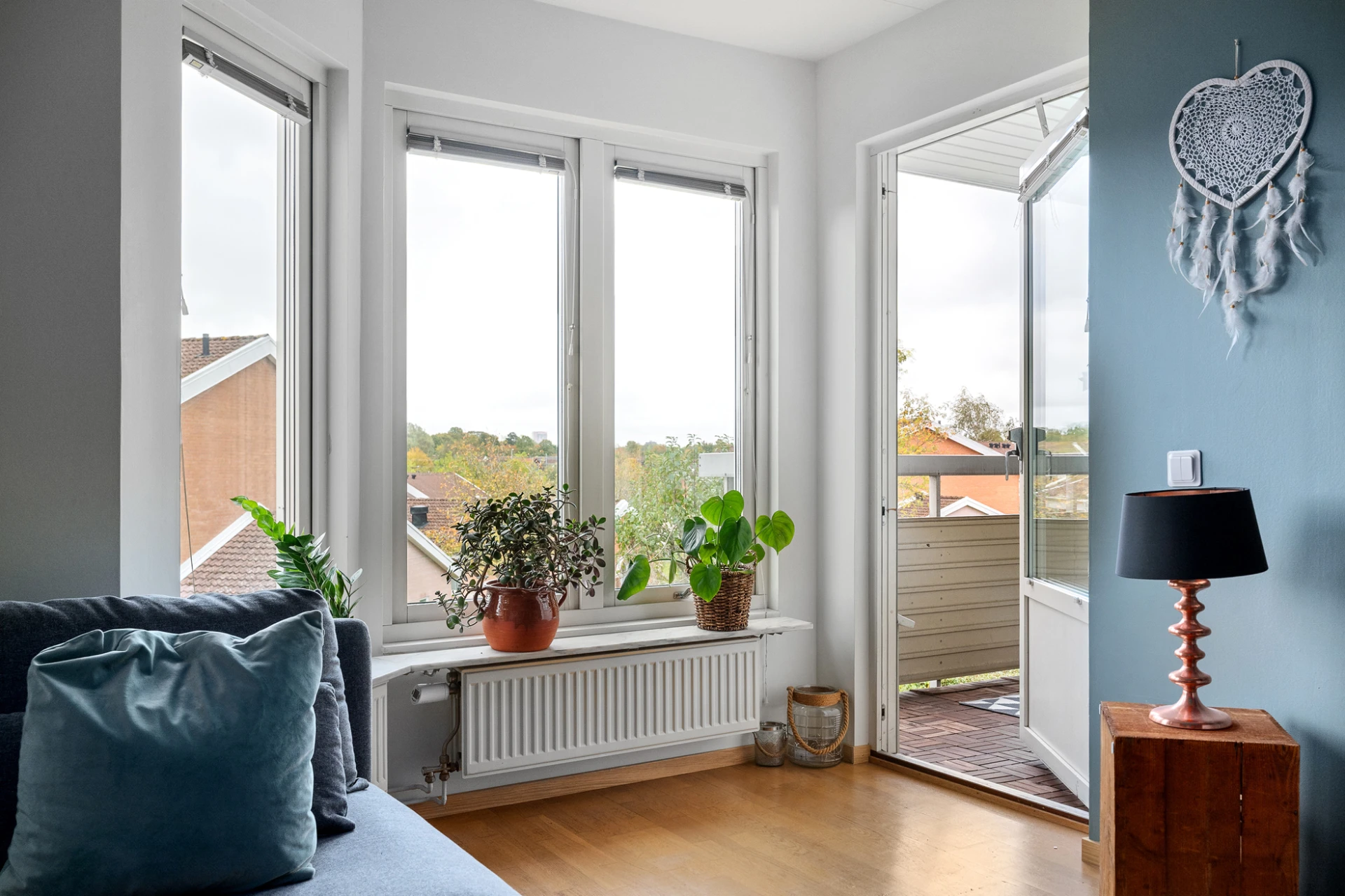 Parkettgolv och vita väggar samt blågrön fondvägg. Utgång till balkong.