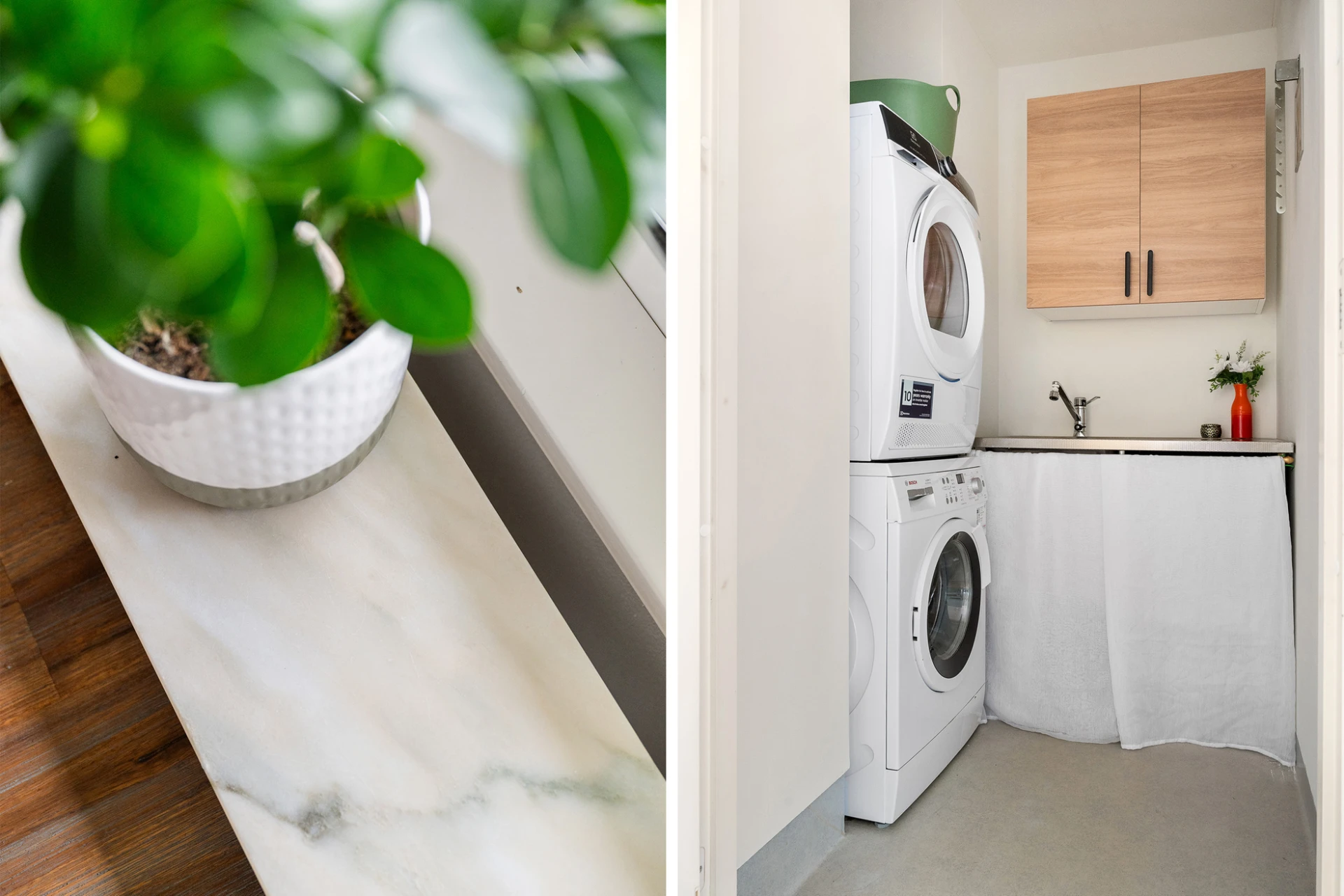 Ljus plastmatta och ljusa väggar. Är inrett med vägghängda förvaringsskåp, tvättställ, tvättmaskin och torktumlare.