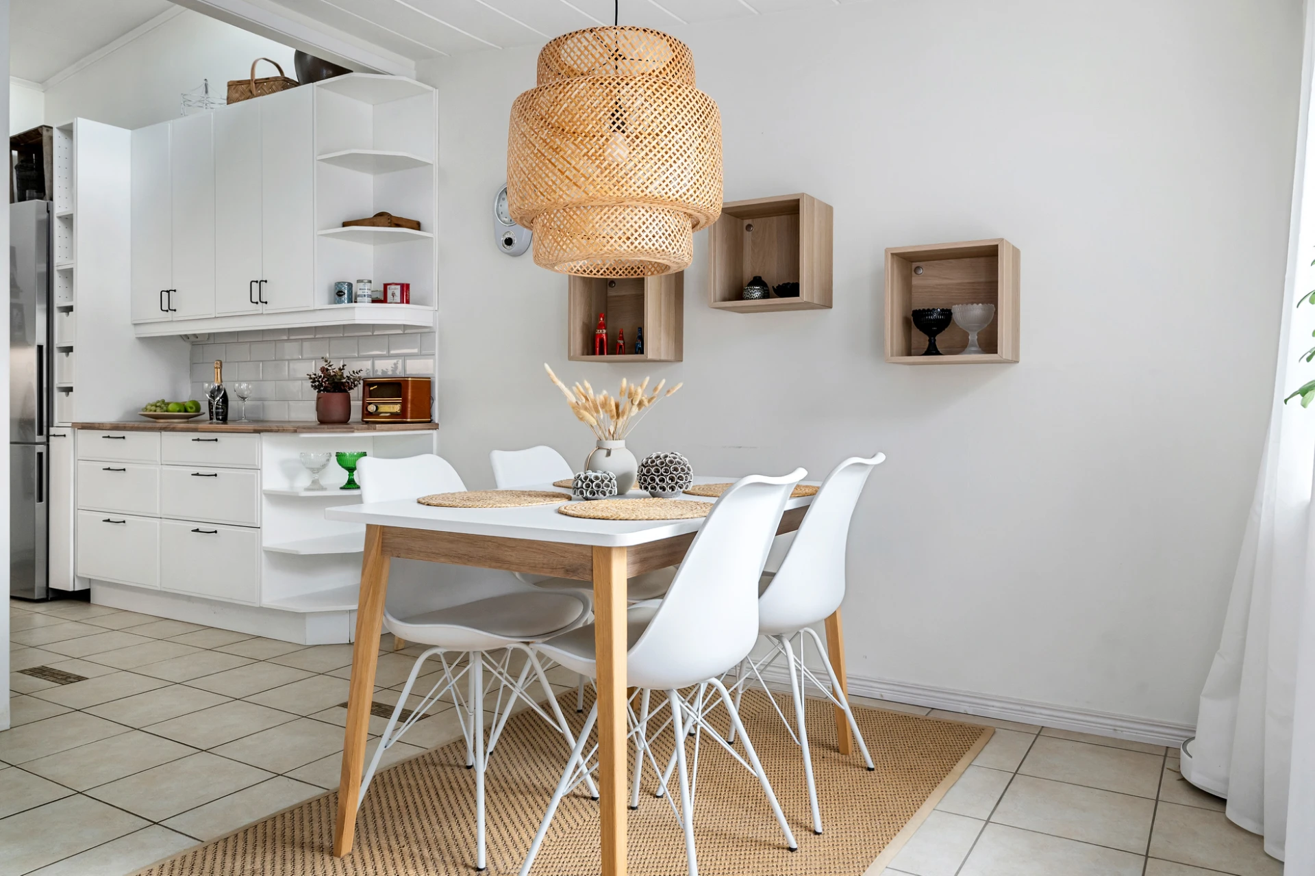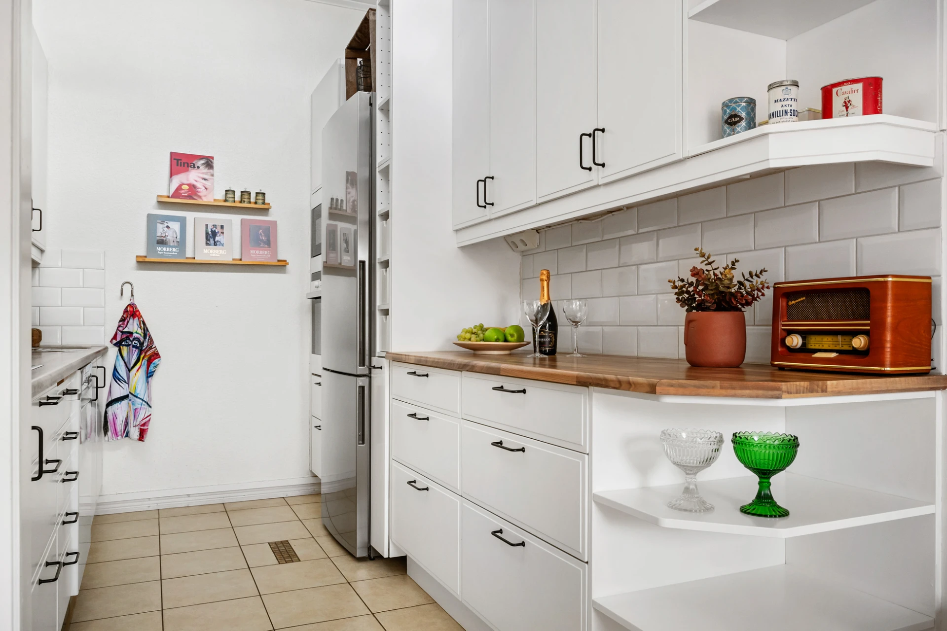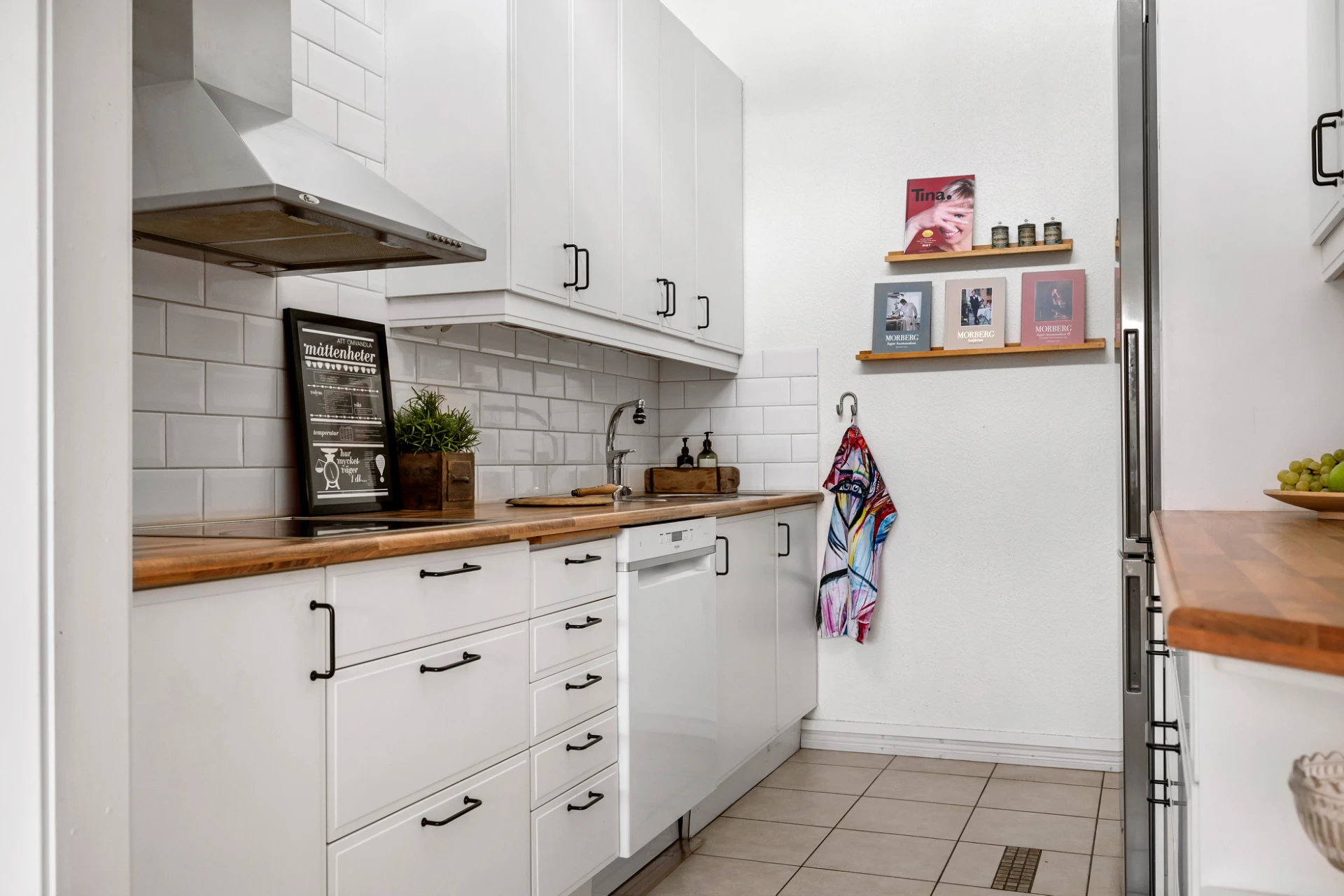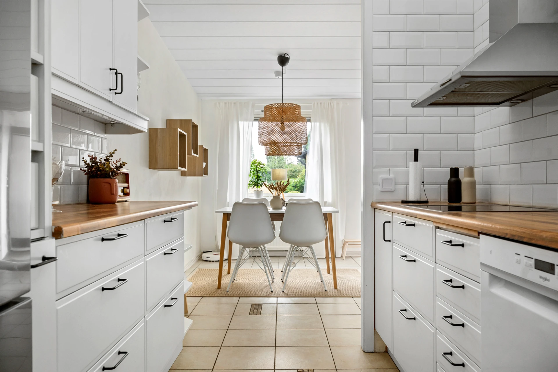Stilrent kök med vita luckor, vitt kakel och bänkskiva i valnötsmönstrad laminat. Köket har fräschats upp av nuvarande ägare och är utrustat med diskmaskin (2025), kyl/frys (ca 2023) samt spishäll, inbyggnadsugn, fläkt och inbyggnadsmicro. Invid fönstret med utsikt över framsidan finns utrymme för matplats.