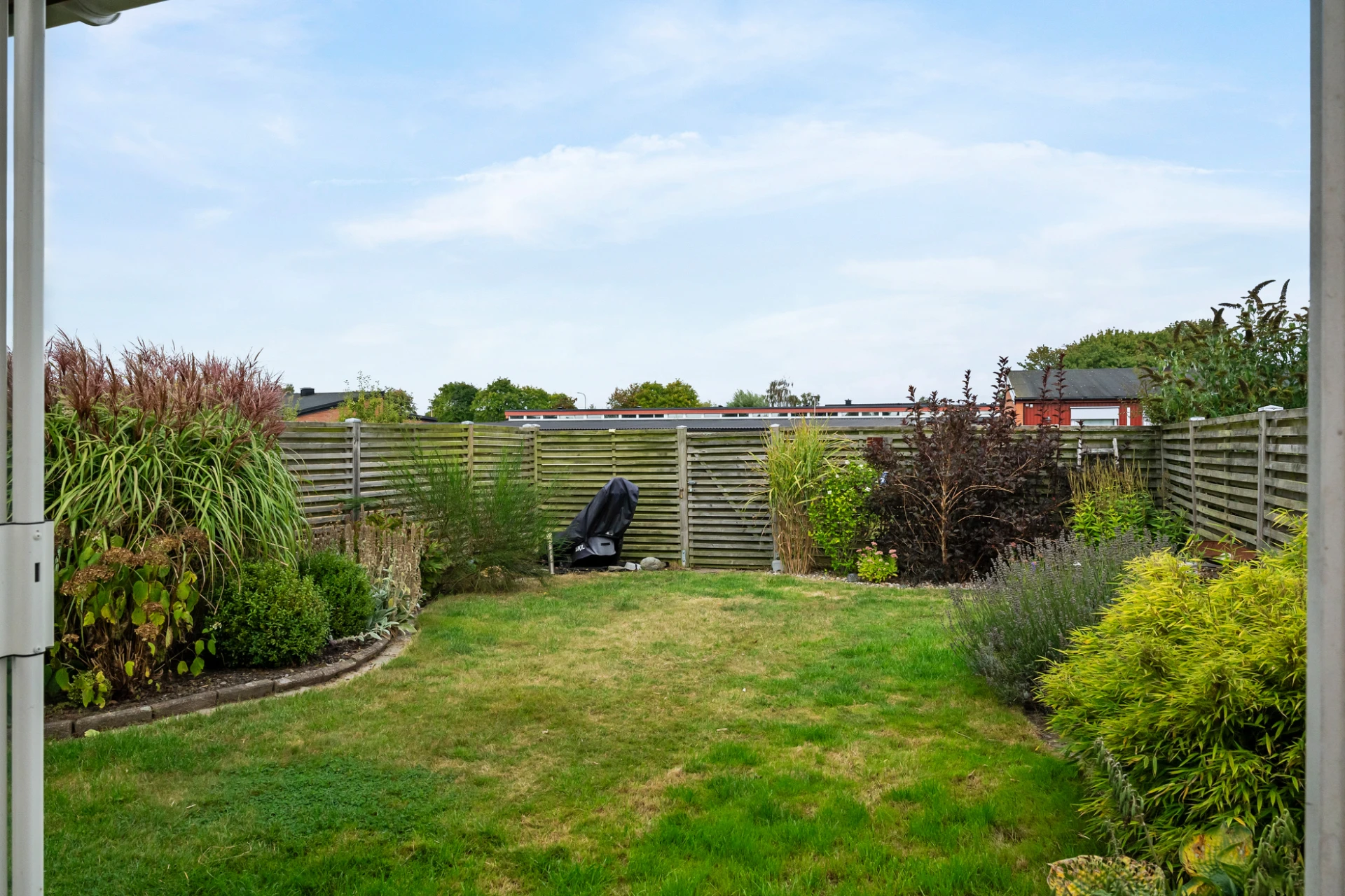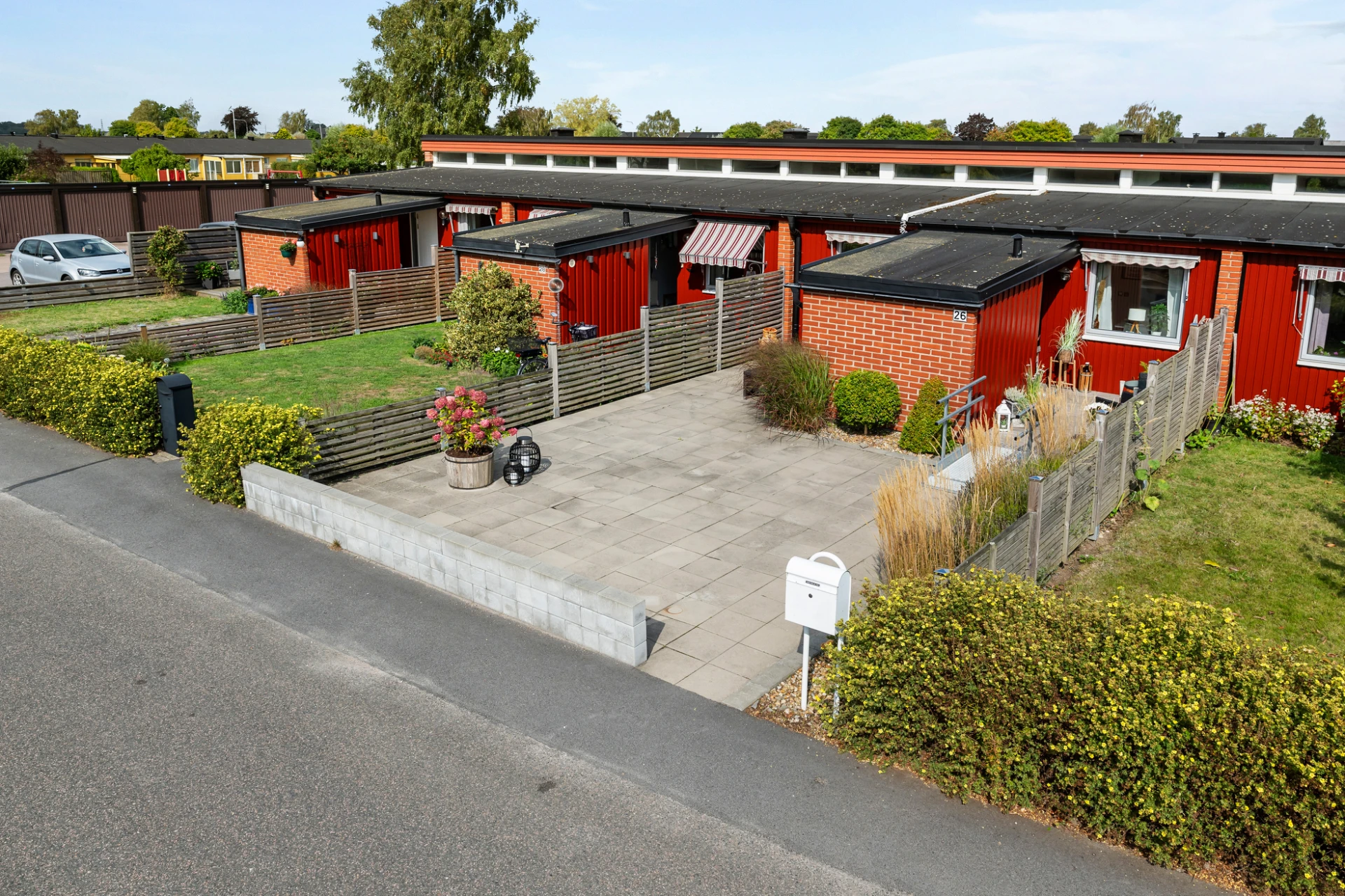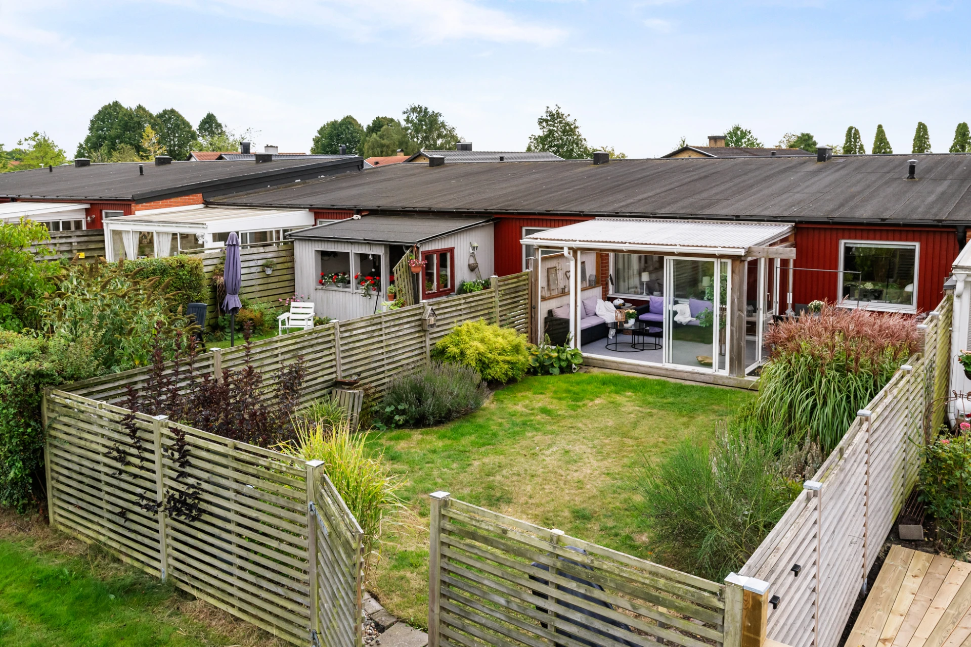 På entrésidan möts du av en stenlagd uteplats – perfekt för morgonkaffet – samt ett separat förråd i anslutning till den skyddade, överbyggda entrén. På baksidan väntar en insynsskyddad trädgård omsluten av vackra och lättskötta planteringar. Det mysiga uterummet förlänger kvällarna. Genom en liten grind nås den gemensamma gröningen.