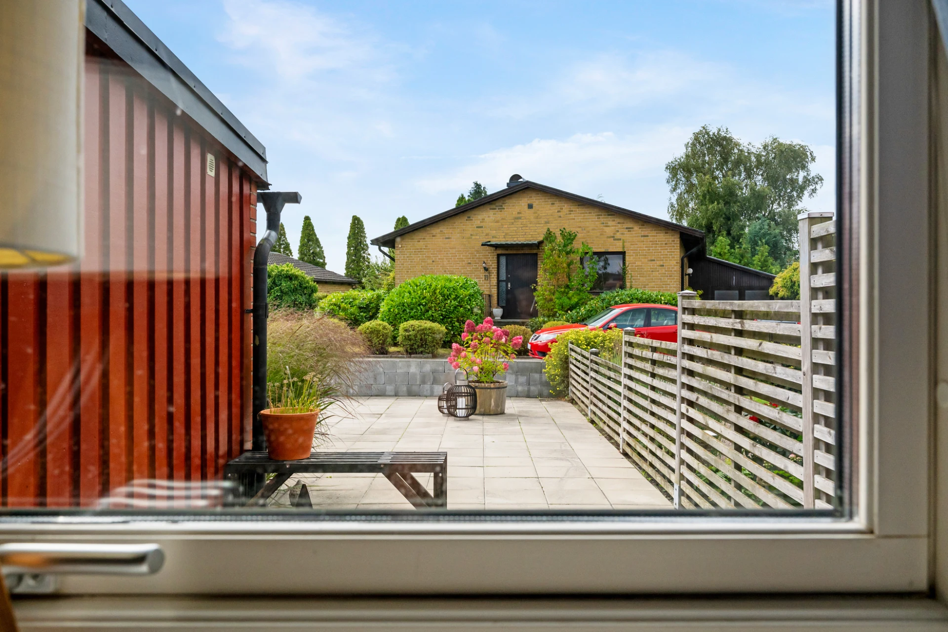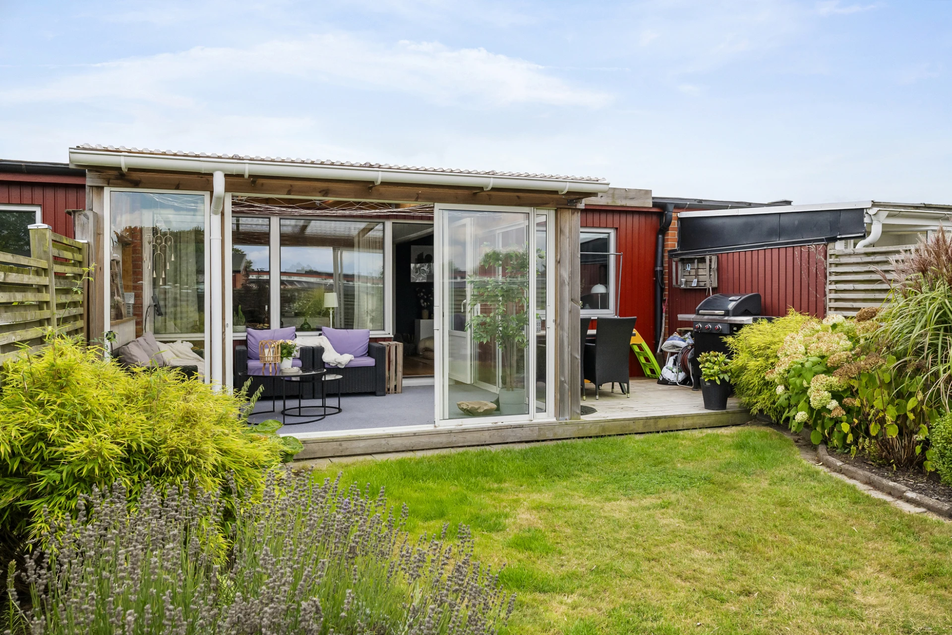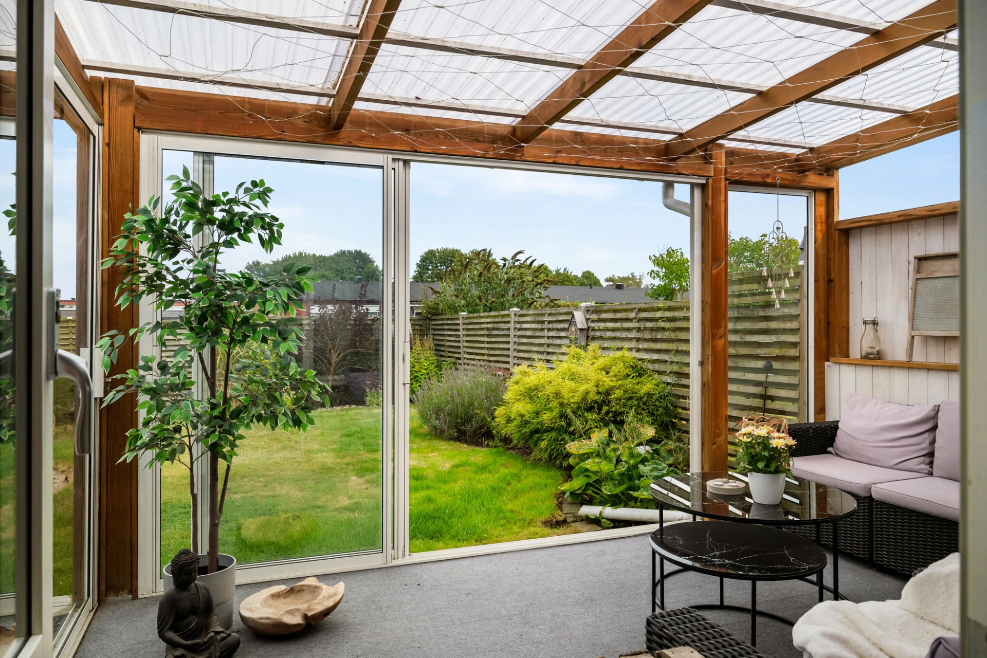 På entrésidan möts du av en stenlagd uteplats – perfekt för morgonkaffet – samt ett separat förråd i anslutning till den skyddade, överbyggda entrén. På baksidan väntar en insynsskyddad trädgård omsluten av vackra och lättskötta planteringar. Det mysiga uterummet förlänger kvällarna. Genom en liten grind nås den gemensamma gröningen.