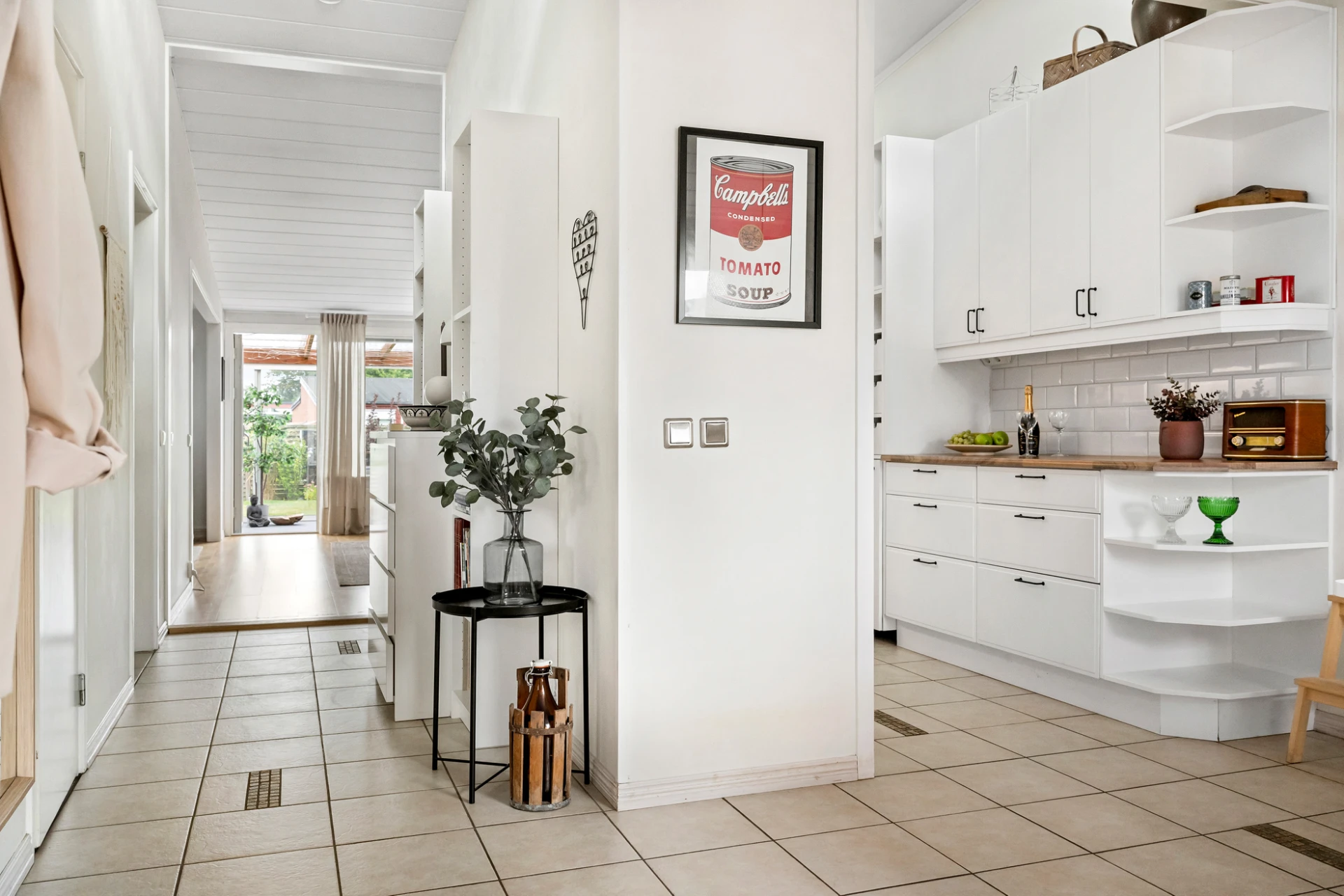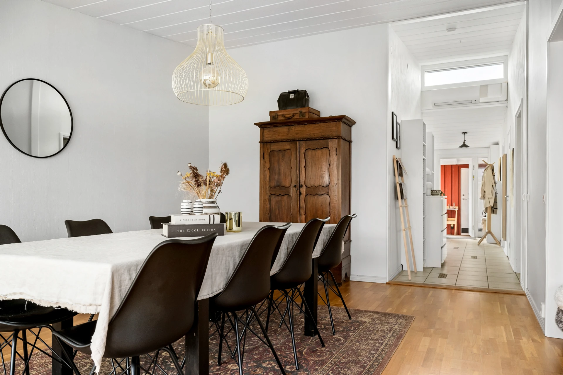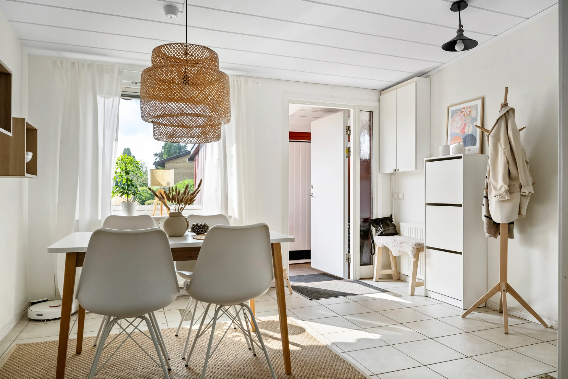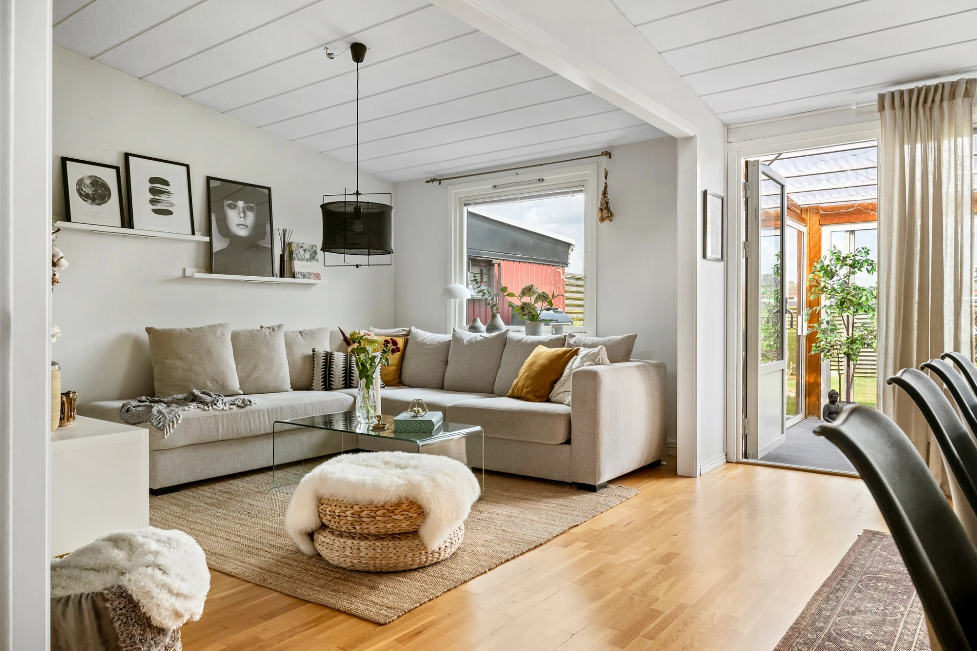 Invändigt erbjuder bostaden en praktisk planlösning med goda förvaringsmöjligheter, vilket gör det enkelt att hålla ordning. Det rymliga vardagsrummet har en härlig atmosfär och köket är stilrent renoverat.