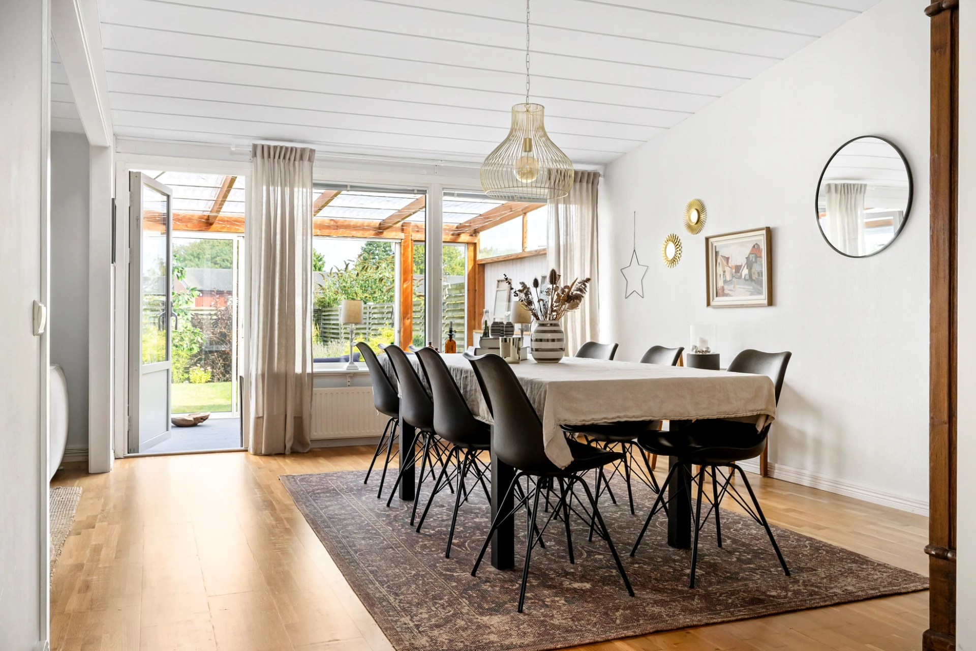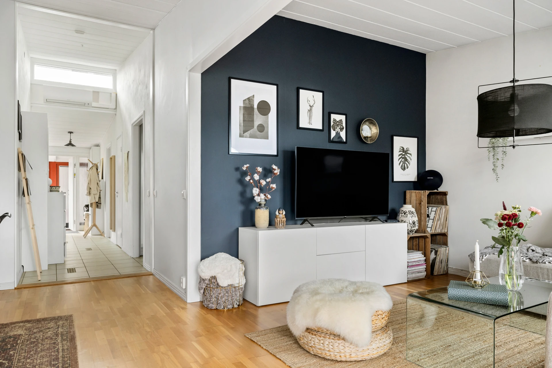 Parkettgolv och ljusa väggar samt en mörkgrå fondvägg. Utgång till uterum och trädgård. Härlig rymd och takhöjd.
