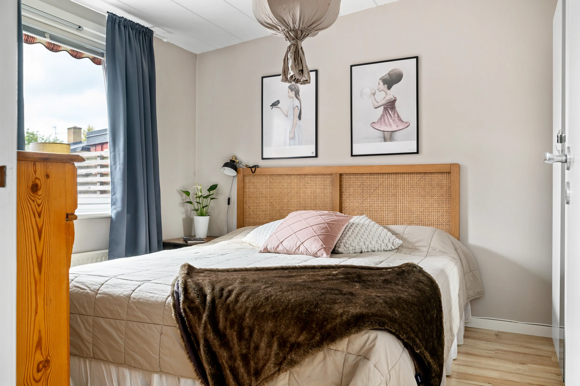 Rymligt sovrum med laminatgolv, ljusa väggar och markis invid fönster mot framsidan.