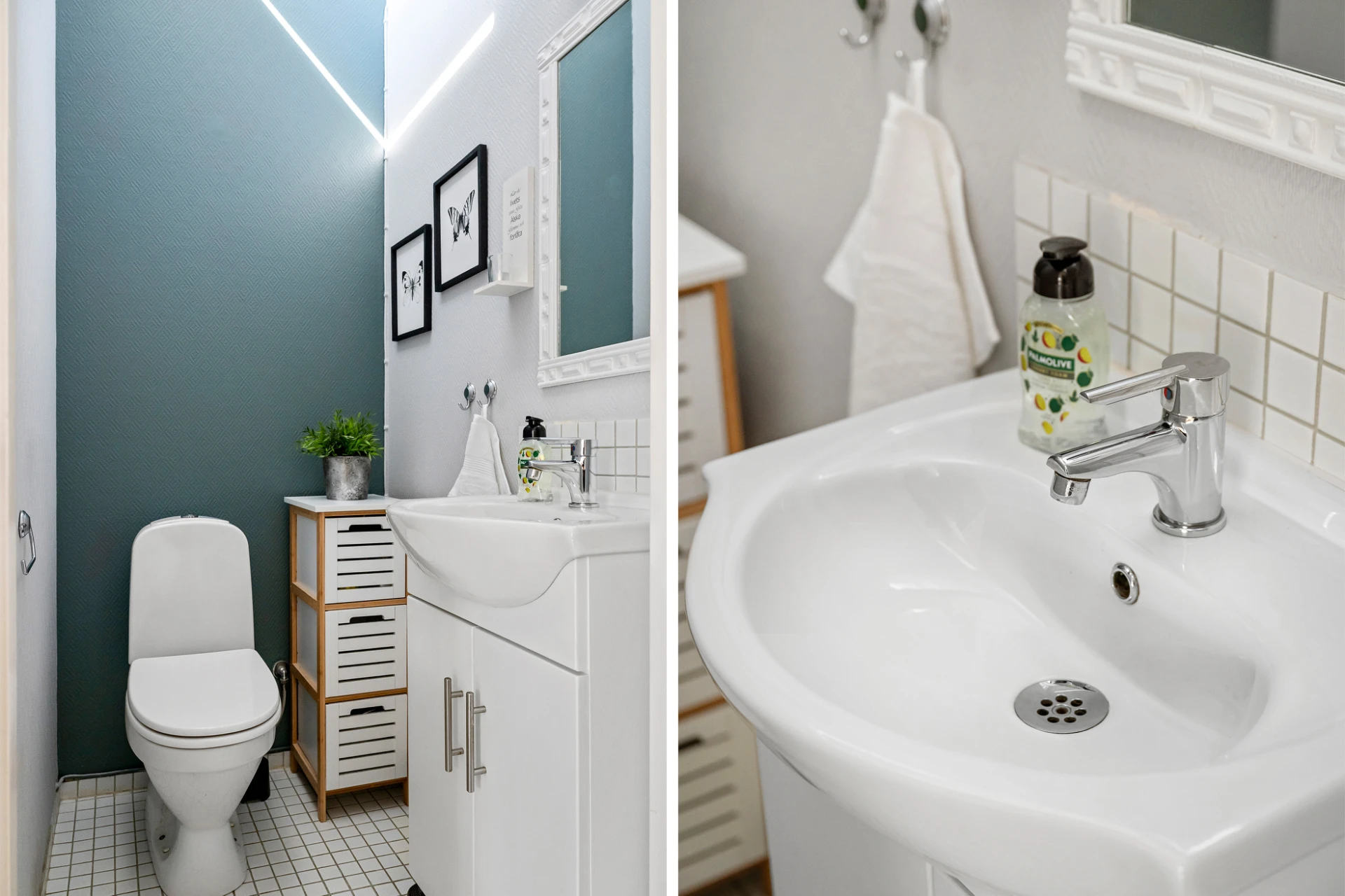 Vitt klinkergolv, målade väggar i grått. Wc, handfat med kommod.