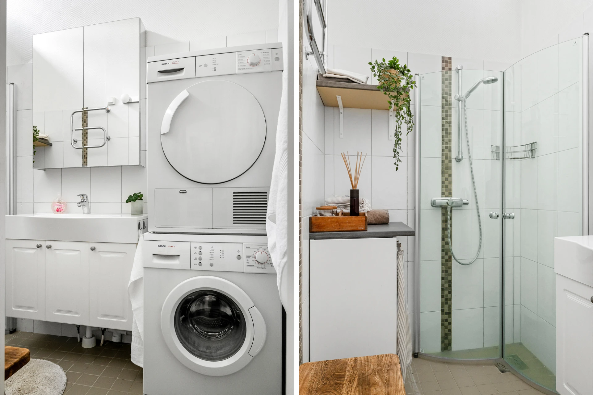 Helkaklat med grått klinkergolv (golvvärme, el), mosaikbård och vitt klinker. Utrustat med handfat med kommod, spegelskåp, dusch, handdukstork (el) ett förvaringsskåp och tvättmaskin samt torktumlare.