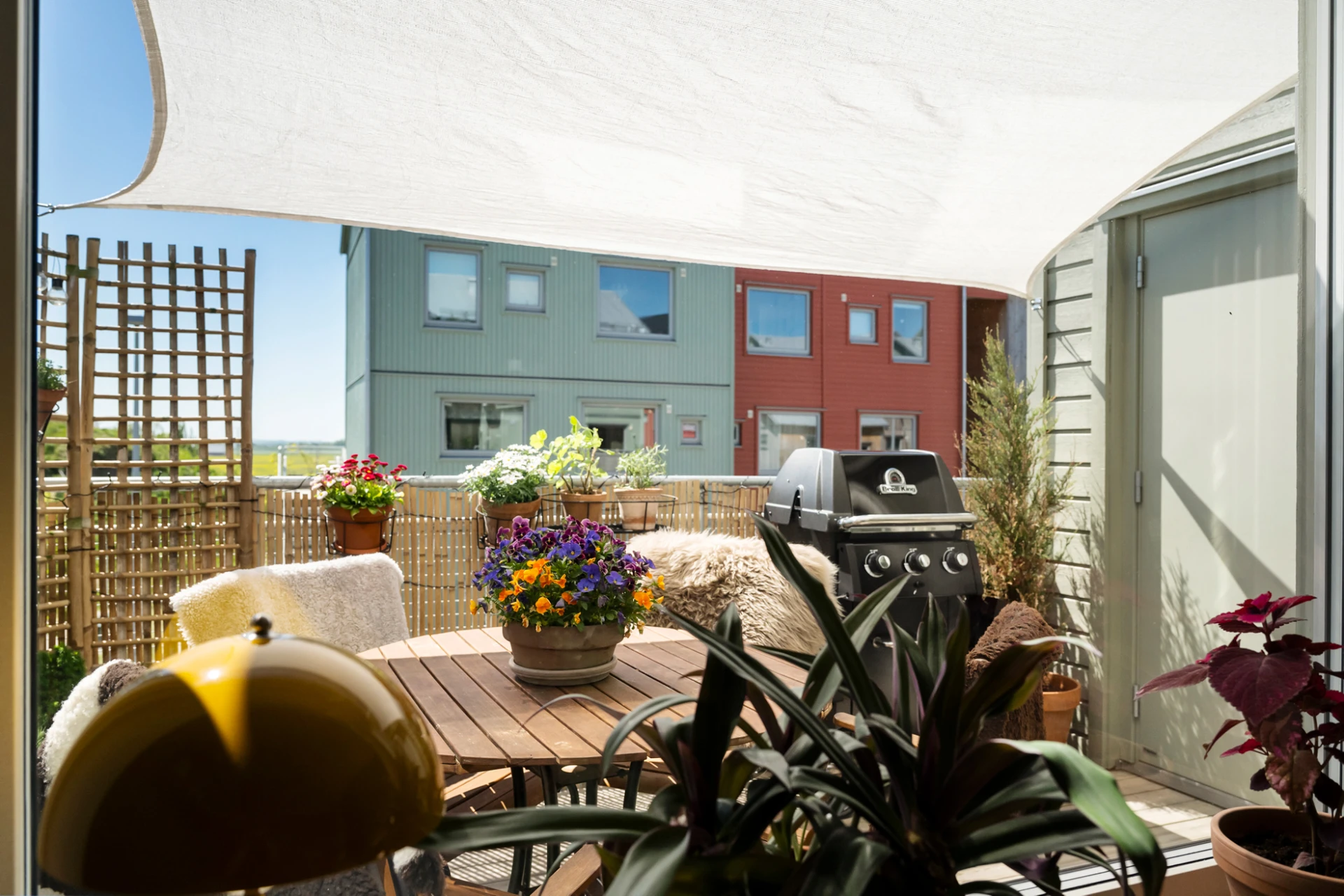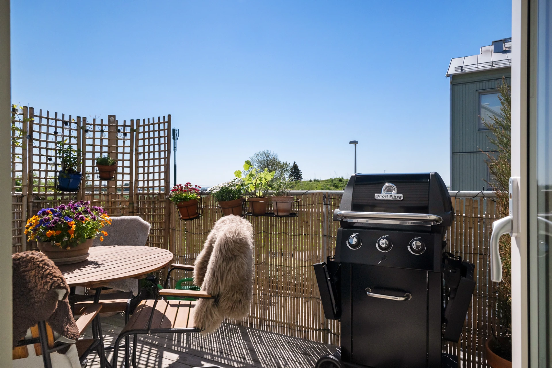 Den generösa balkongen vetter mot sydväst, vilket ger sol stora delar av förmiddagen och framåt kvällen, perfekt för avkoppling eller en middag i kvällssolen. Eftersom det inte finns några grannar ovanför råder här en lugn och ostörd atmosfär.