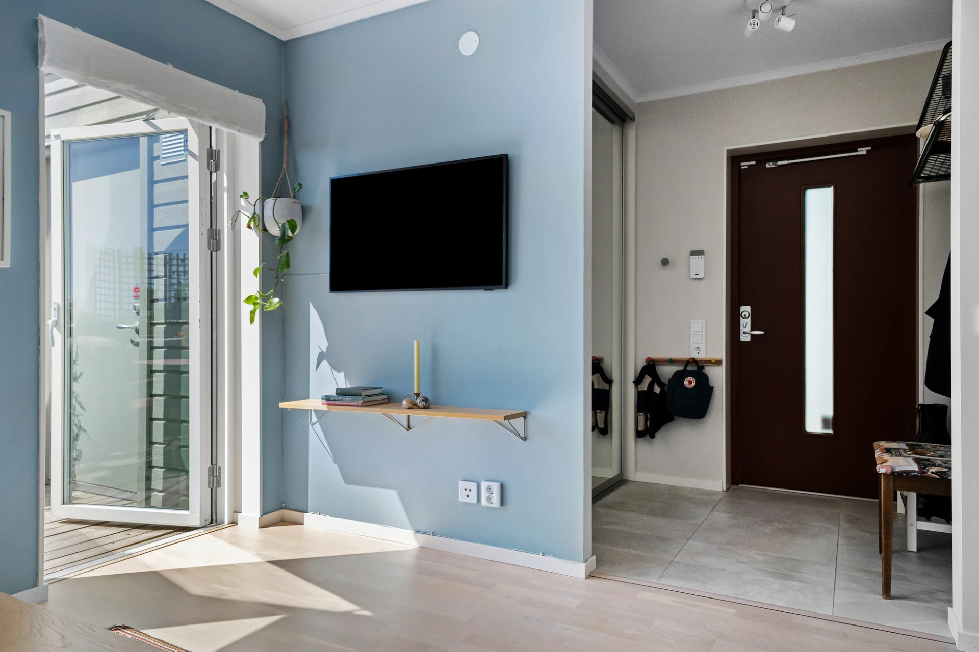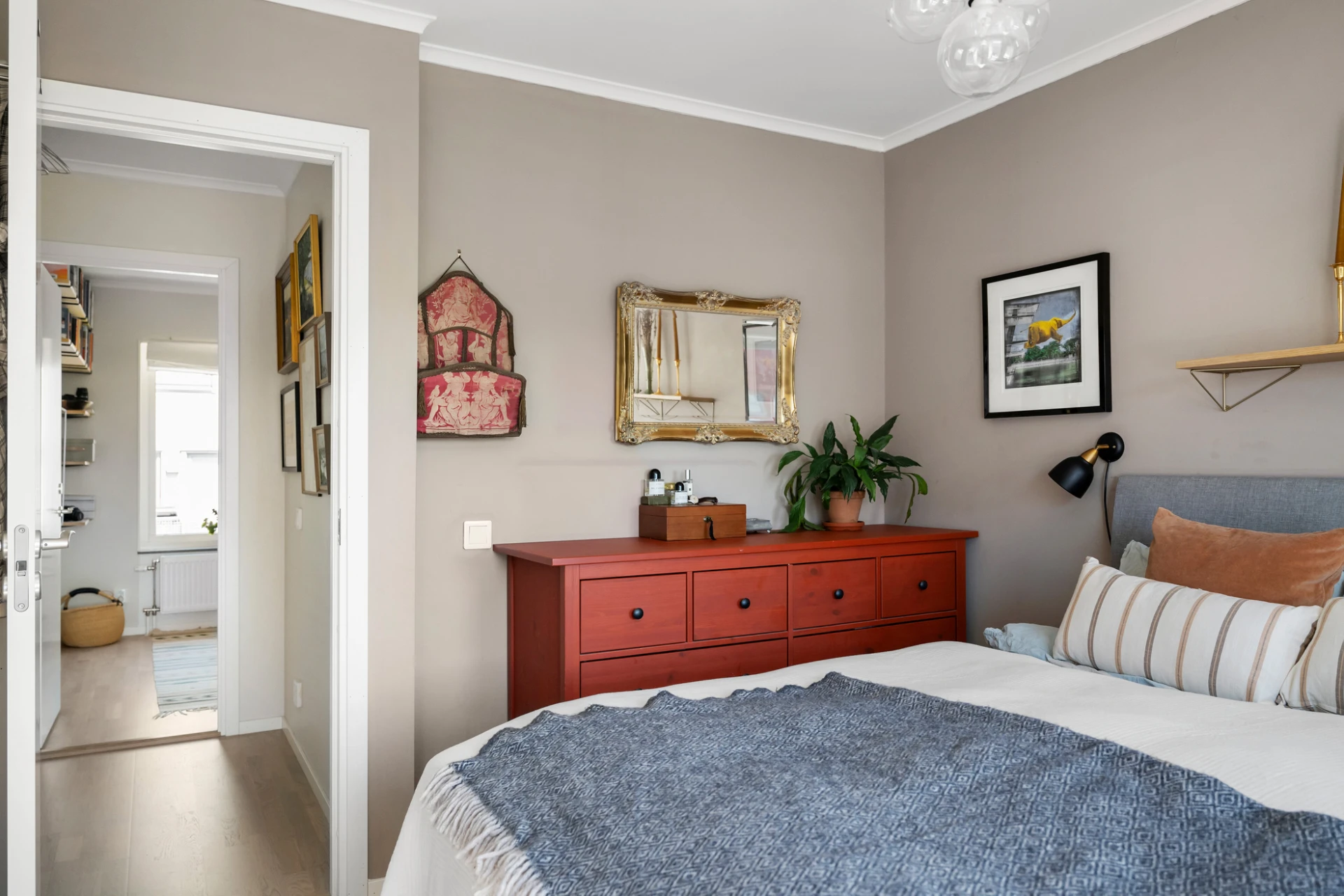 Ekgolv och målade väggar. Utgång till balkongen i sydväst.