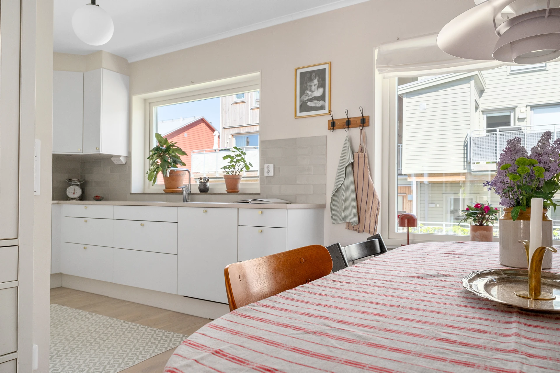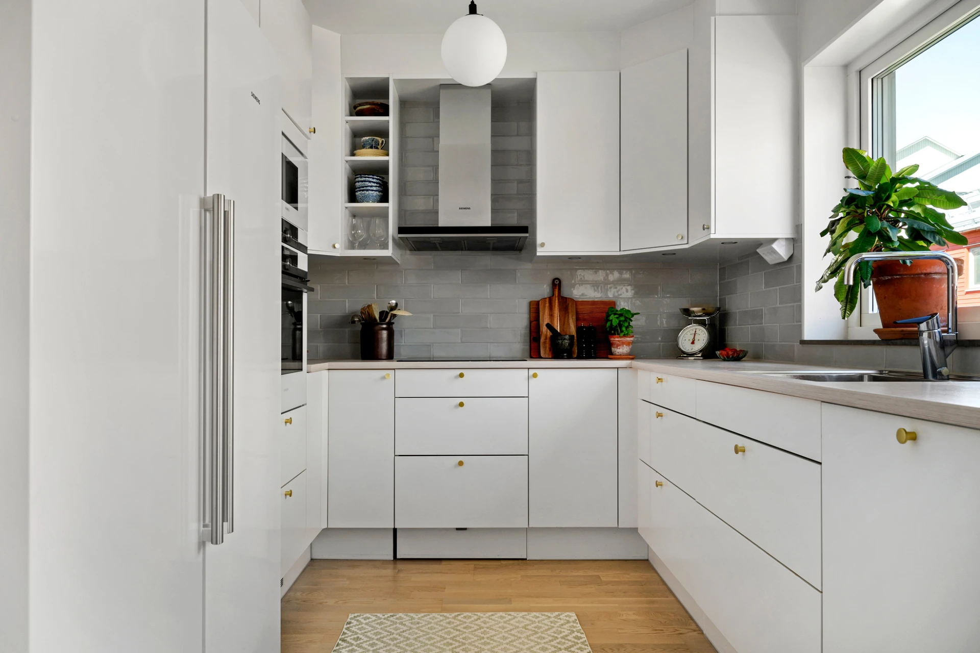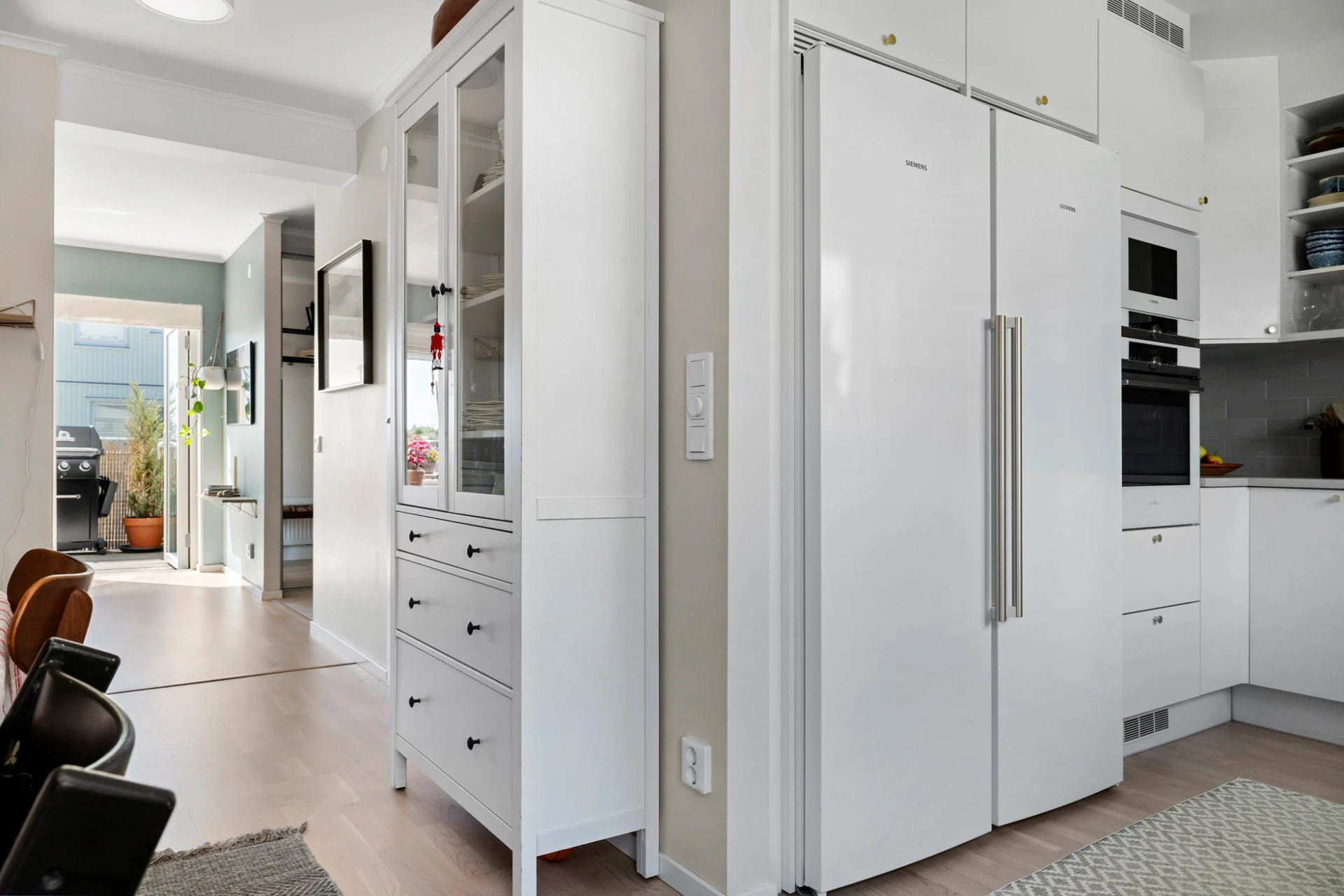 Ekholm och målade väggar. Vit köksinredning från HTH och grått kakel ovan ljus bänkskiva i laminat. Köket är inrett med hel kyl, hel frys, induktionshäll, fläkt, inbyggd varmluftsugn, inbyggd mikrovågsugn och integrerad diskmaskin. Samtliga vitvaror från Siemens.
