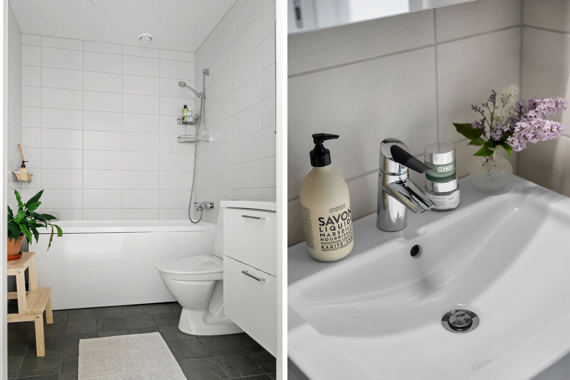 Det eleganta köket från HTH är utrustat med kvalitativa vitvaror från Siemens, en plats där funktion möter design. Två helkaklade badrum och egna tvättmöjligheter underlättar vardagen ytterligare.