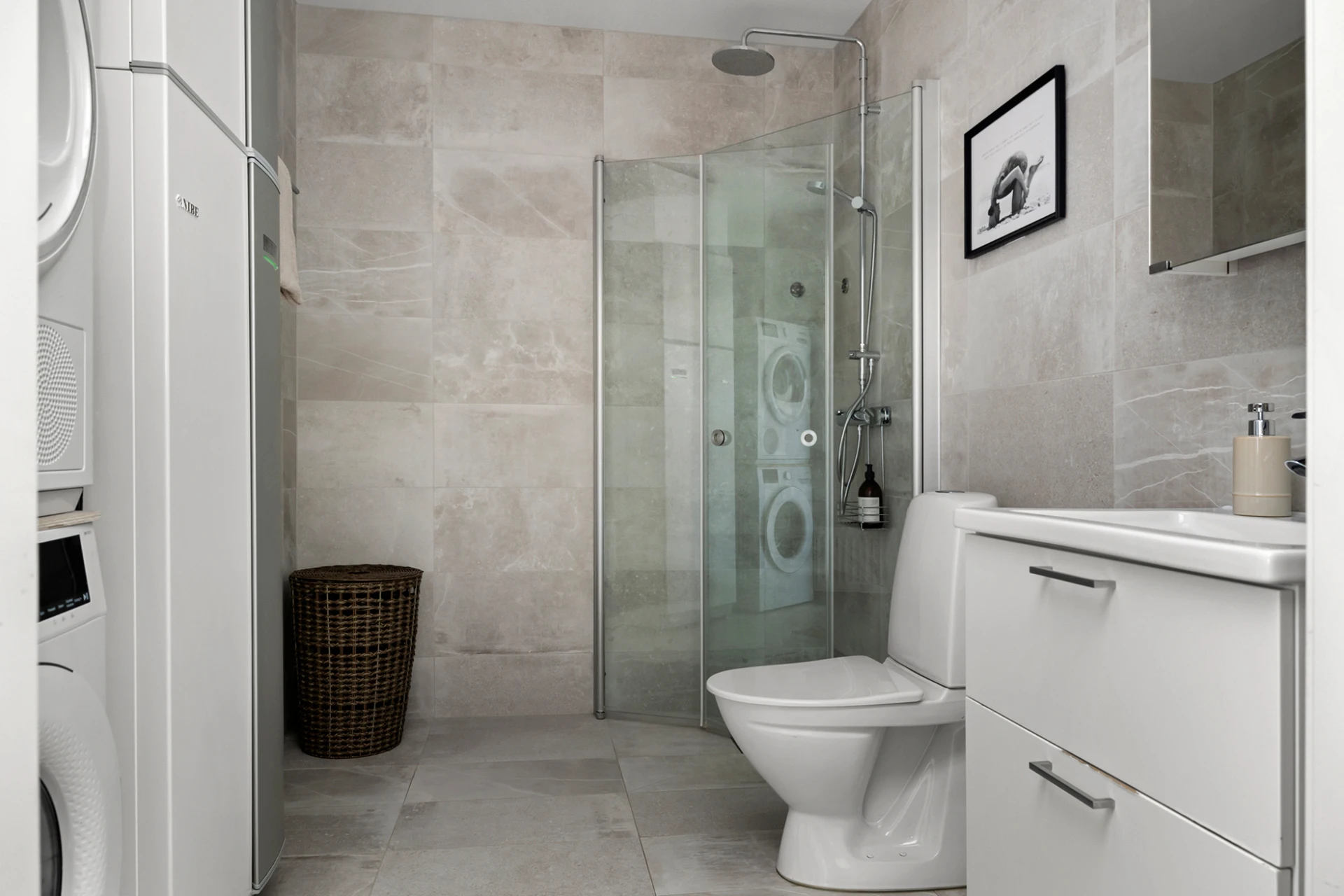 Marmorerad klinker och kakel i gråbeige ton. Badrummet är inrett med WC, handfat med kommod, spegelskåp, takdusch med vikbara duschväggar, tvättmaskin (2025) och torktumlare.