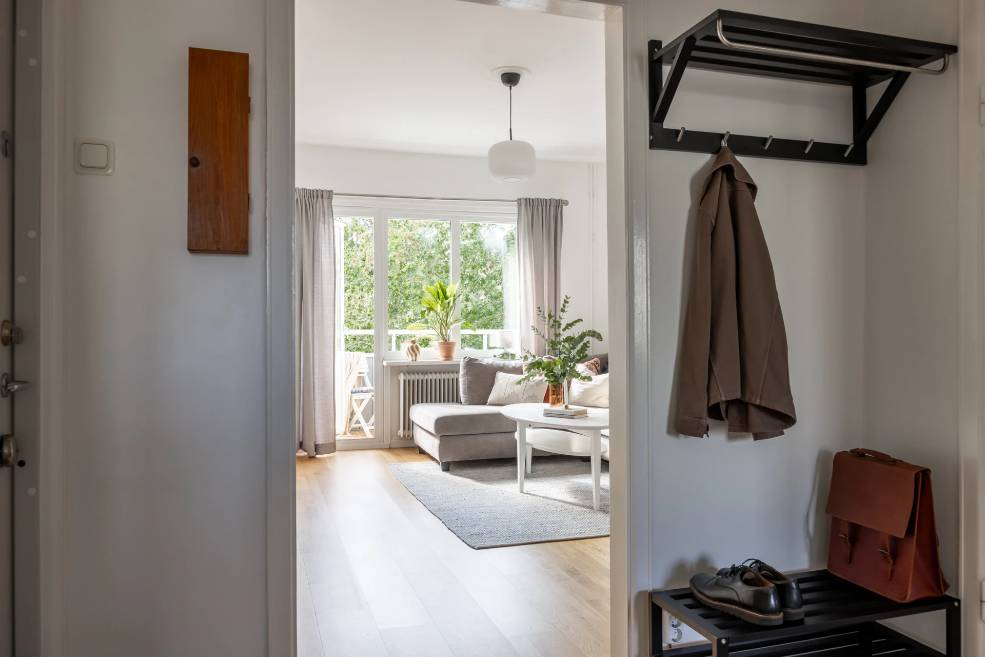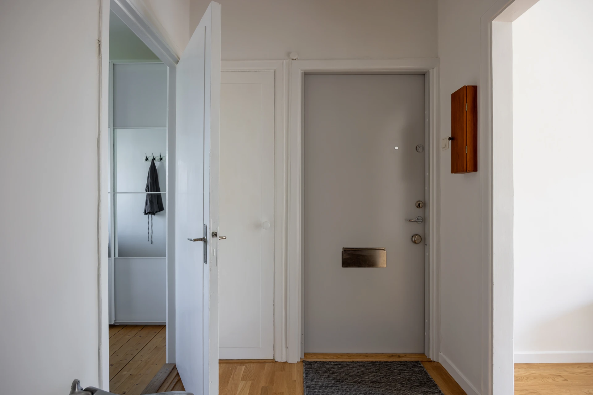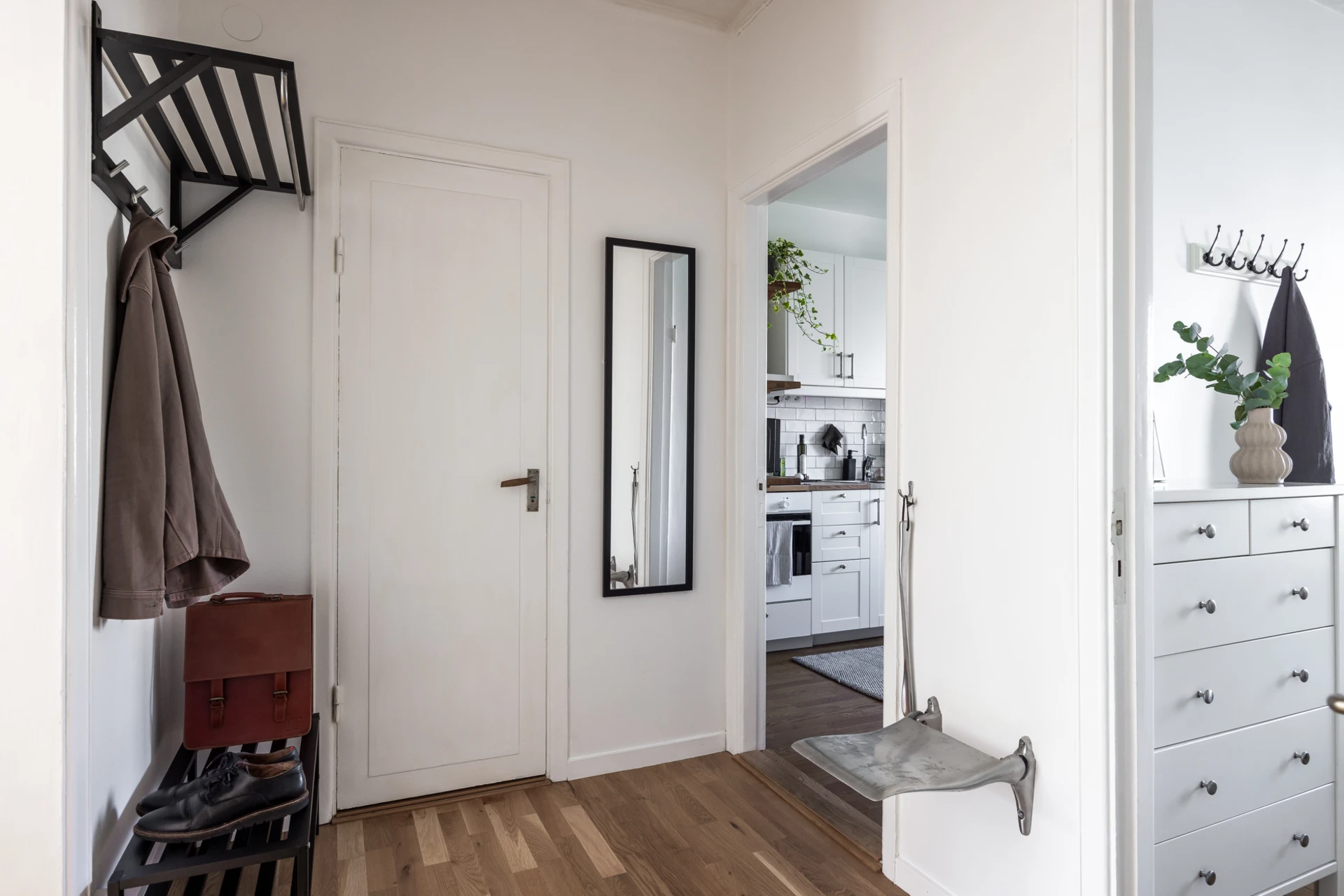 Parkettgolv och vita väggar. Här finns plats för avhängning och förvaring sker i en garderob. Bostaden är utrustad med en säkerhetsdörr.