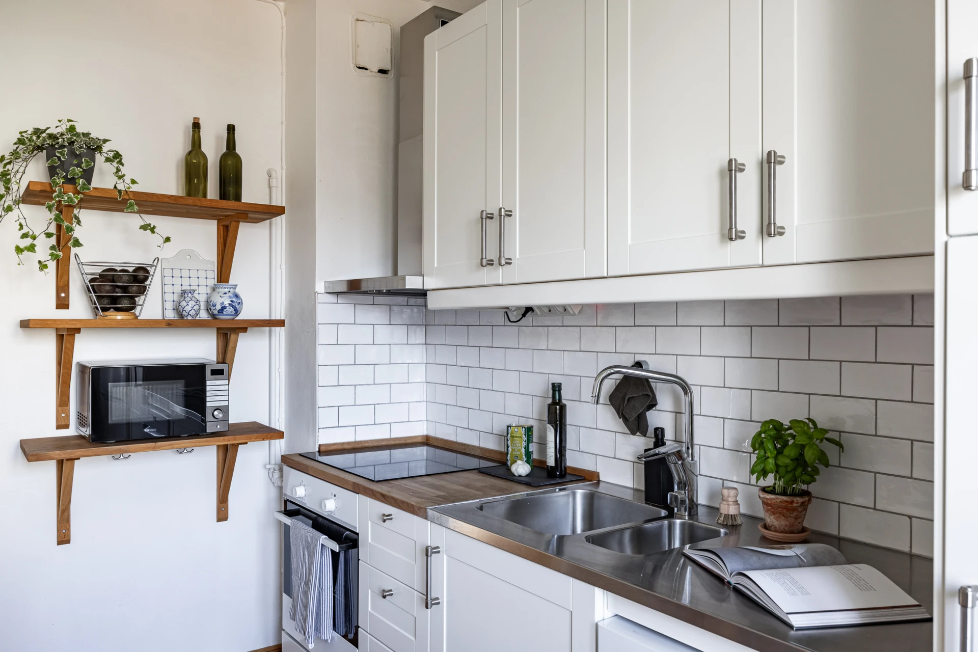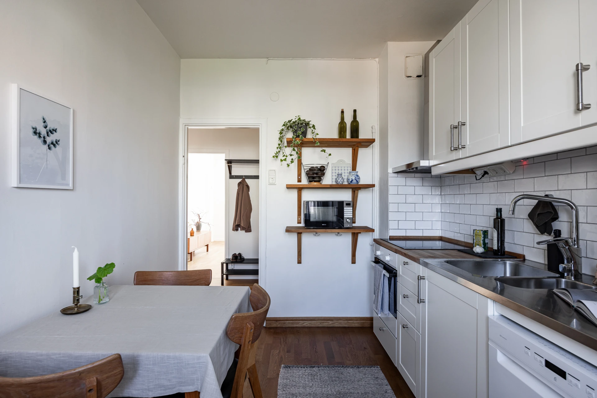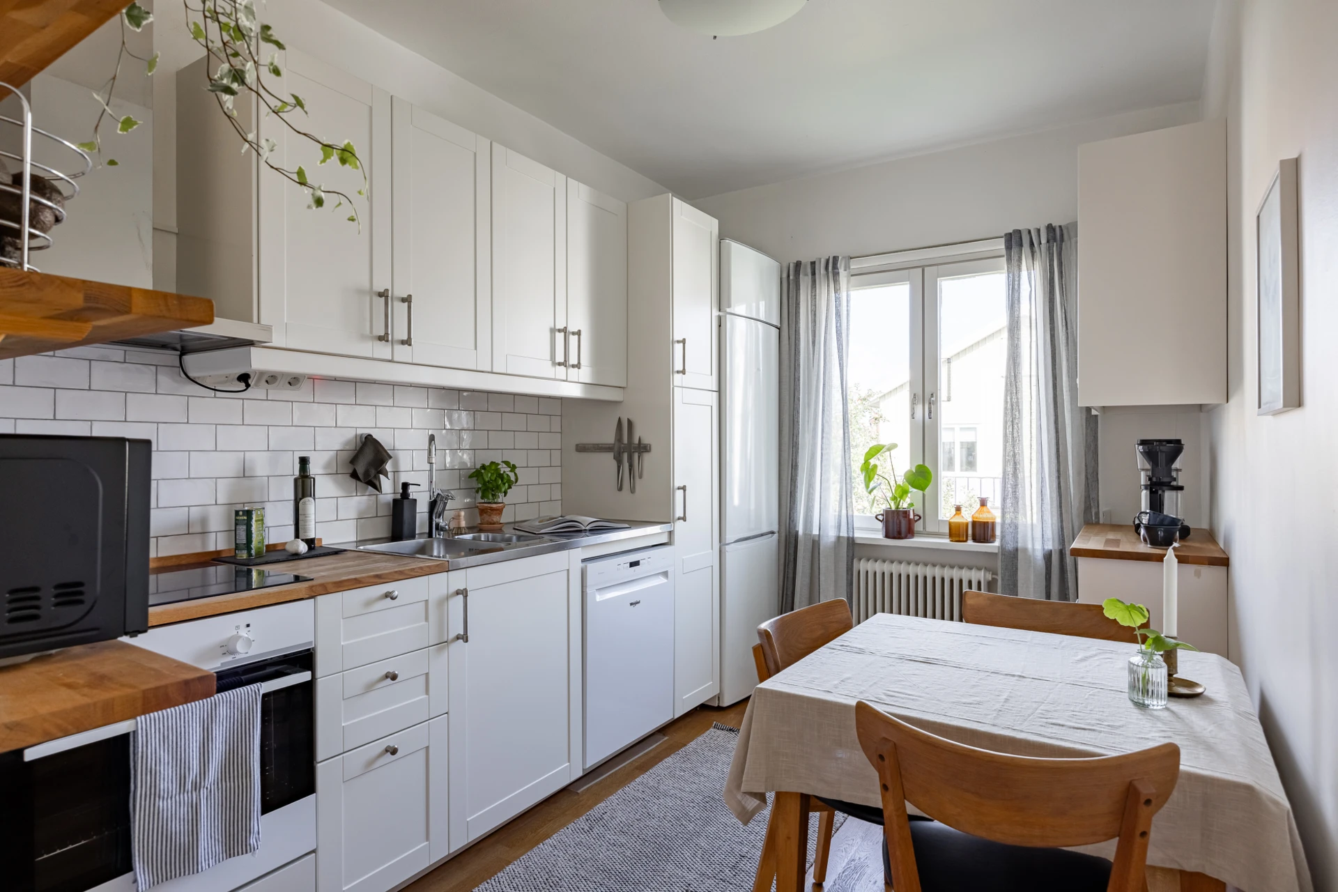 Parkettgolv och vita väggar. Köksinredning i ljust målat trä och ovanför arbetsbänken sitter vitt kakel. Köket är utrustat med kombinerad kyl/frys, induktionshäll, ugn, fläkt och diskmaskin. Matplats för cirka tre personer.
