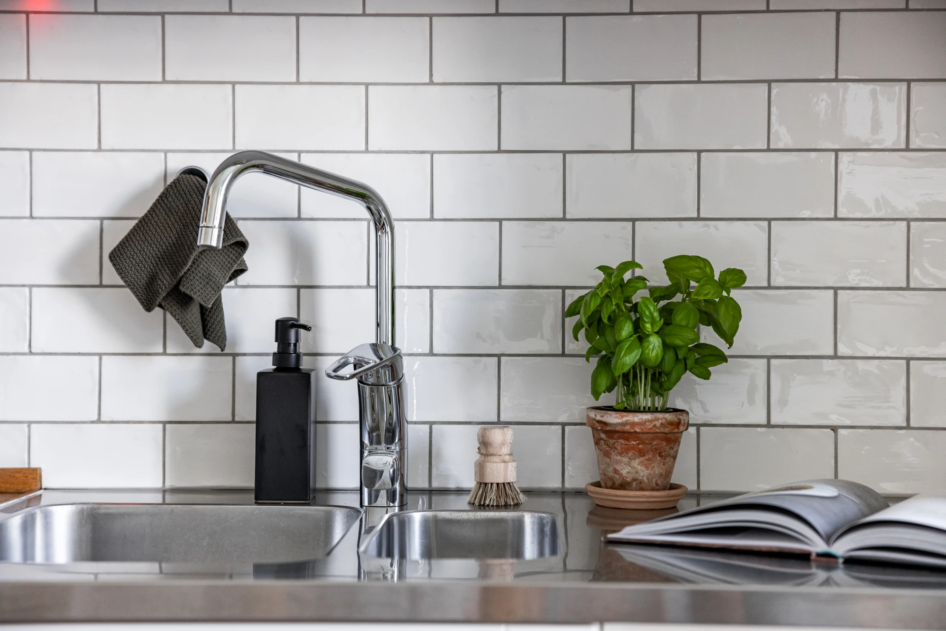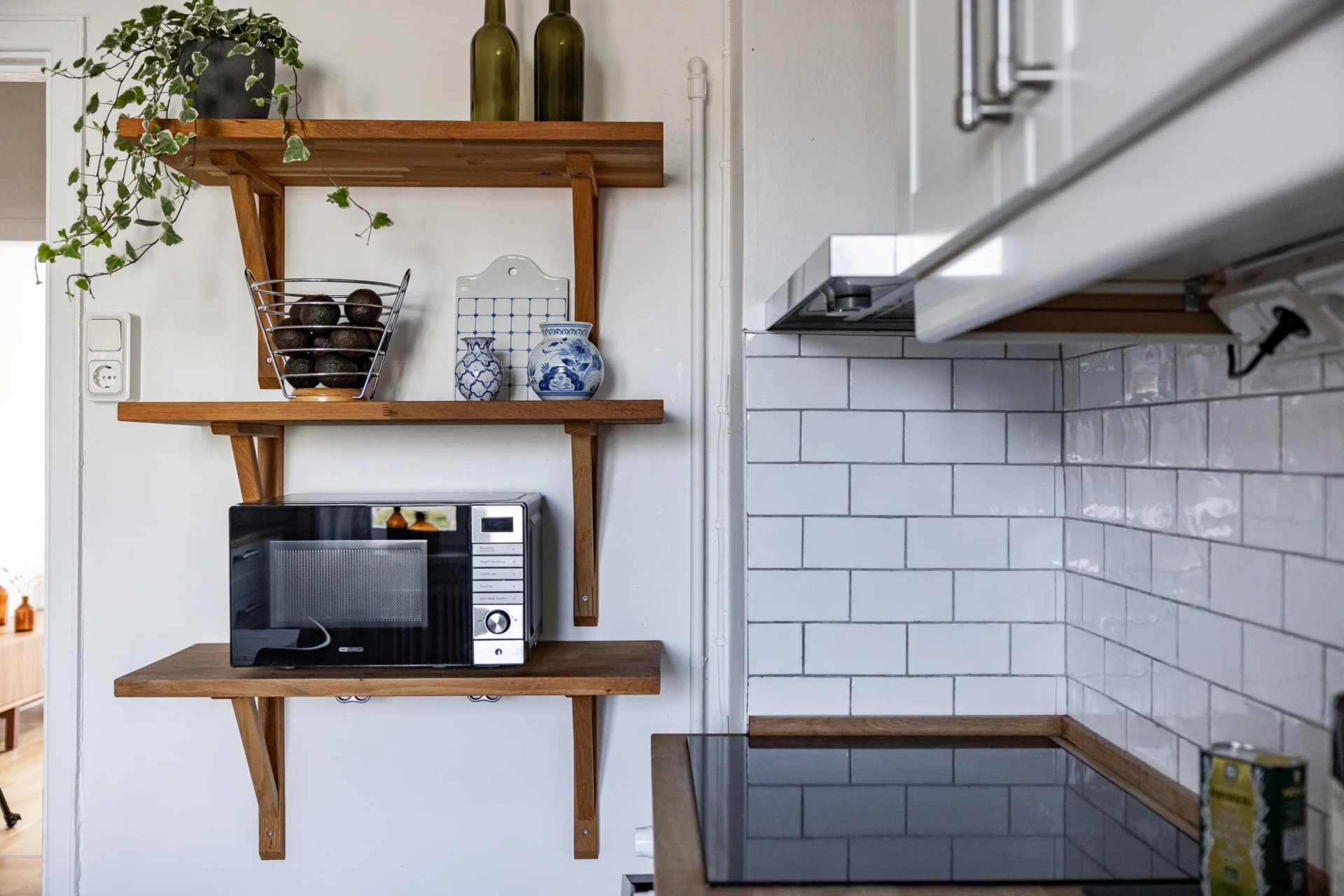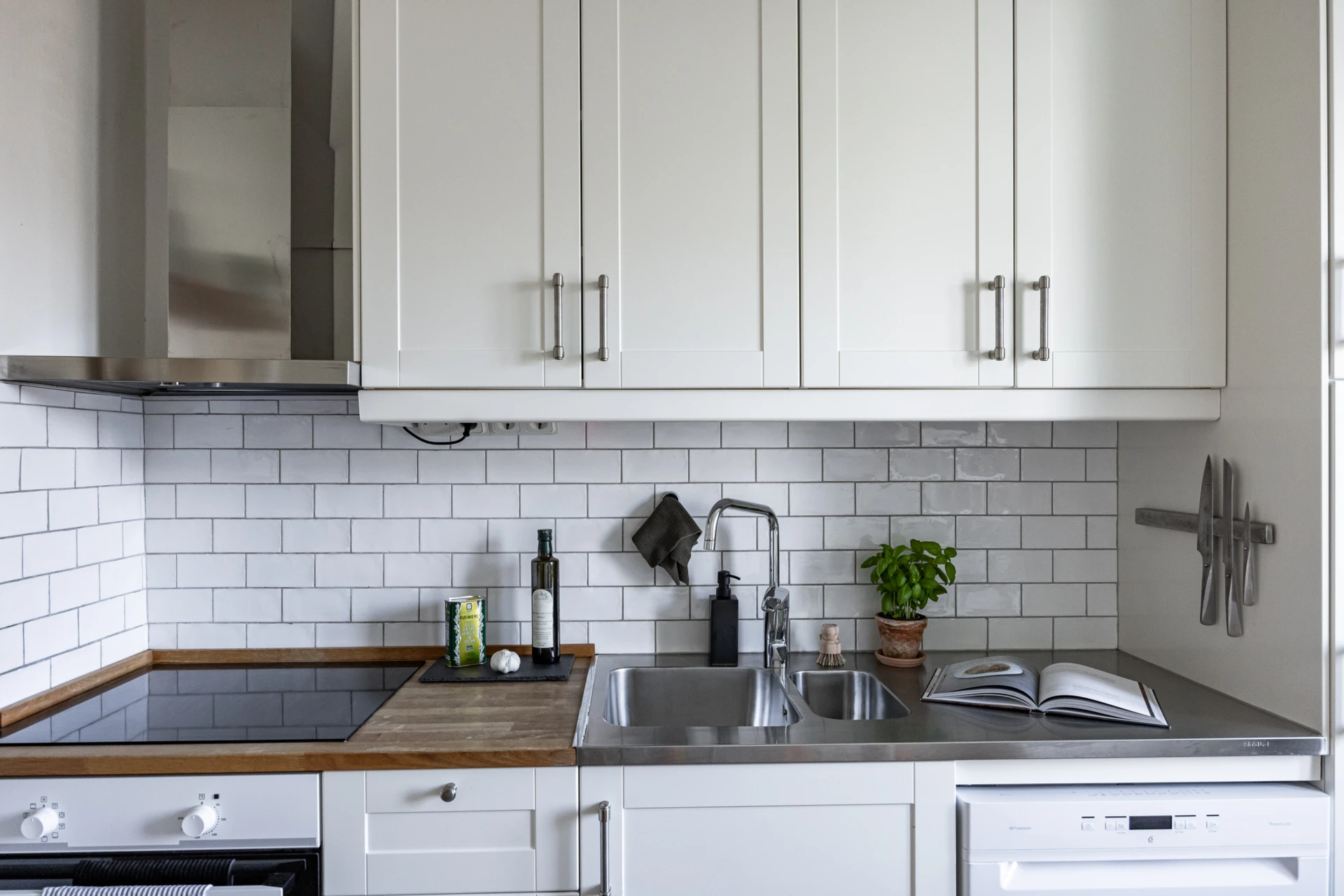 Parkettgolv och vita väggar. Köksinredning i ljust målat trä och ovanför arbetsbänken sitter vitt kakel. Köket är utrustat med kombinerad kyl/frys, induktionshäll, ugn, fläkt och diskmaskin. Matplats för cirka tre personer.
