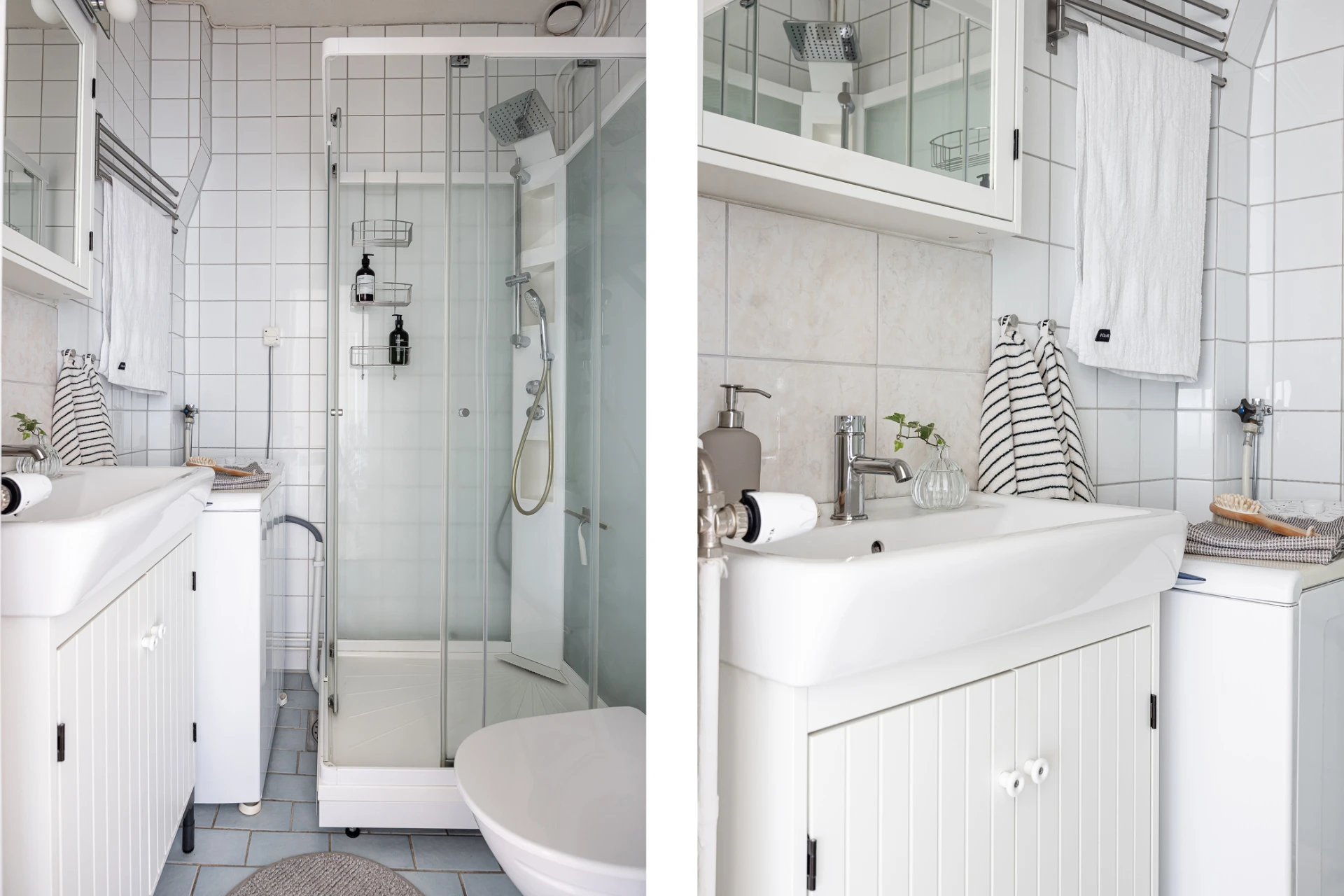 Klinkergolv och delvis kaklade väggar i kombination med vitmålade väggar. Badrummet är utrustat med WC, handfat, spegel, dusch och tvättmaskin.
