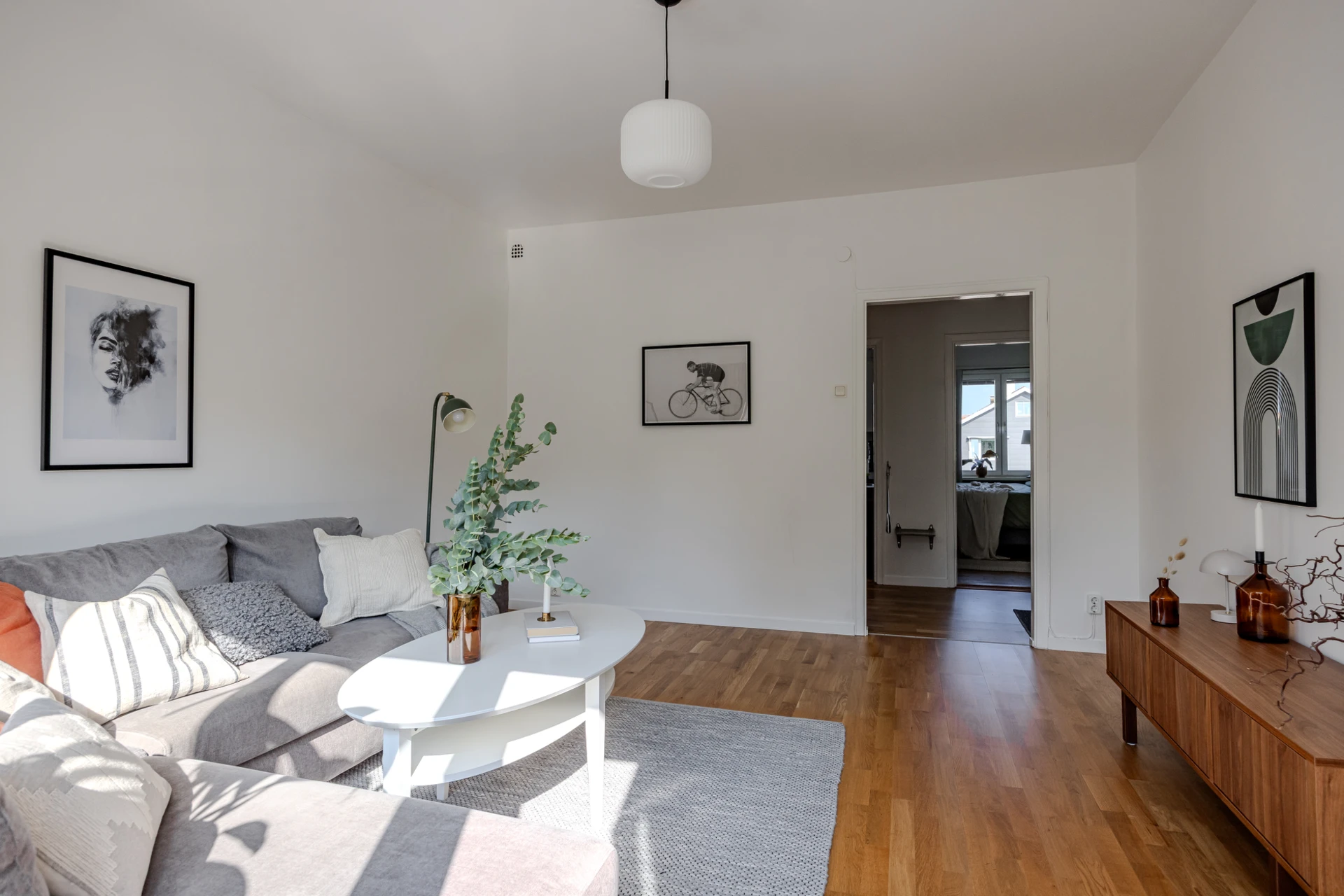 Parkettgolv och vita väggar. Här finns plats för soffa med tillhörande möblemang och förvaring i en rymlig garderob. Härifrån nås bostadens balkong i söderläge.