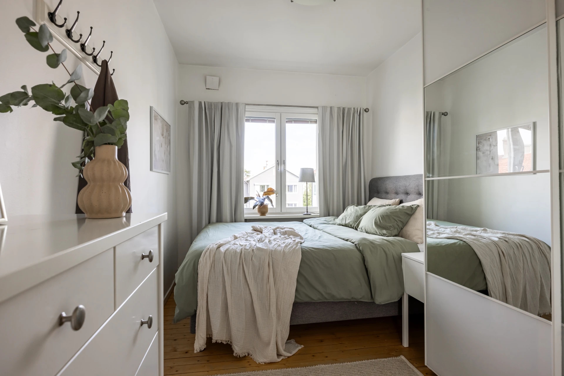 Brädgolv och vita väggar. Här finns plats för dubbelsäng med tillhörande möblemang. Förvaring sker i en stor skjutdörrsgarderob.