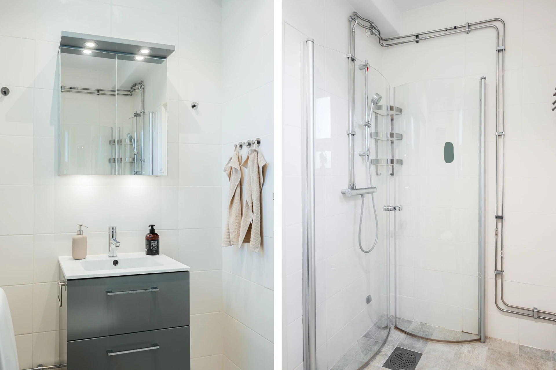 Fräscht och helkaklat badrum utrustat med dusch, wc, handfat och spegelskåp. Ljus och tidlös inredning som ger ett rent och modernt intryck.