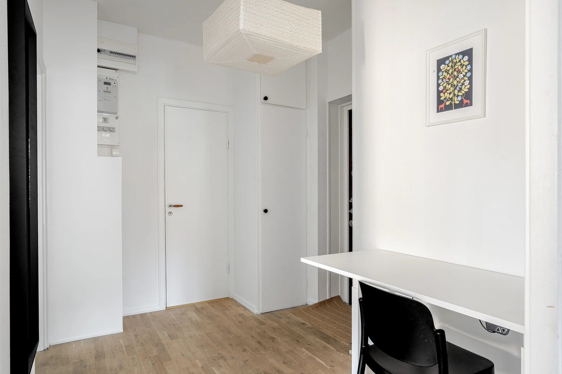 Funktionellt kök med bra arbetsytor och gott om förvaring i både över- och underskåp. Här finns plats för ett mindre matbord eller förvaring beroende på behov. Utrustat med spishäll, ugn, fläkt och kyl/frys.