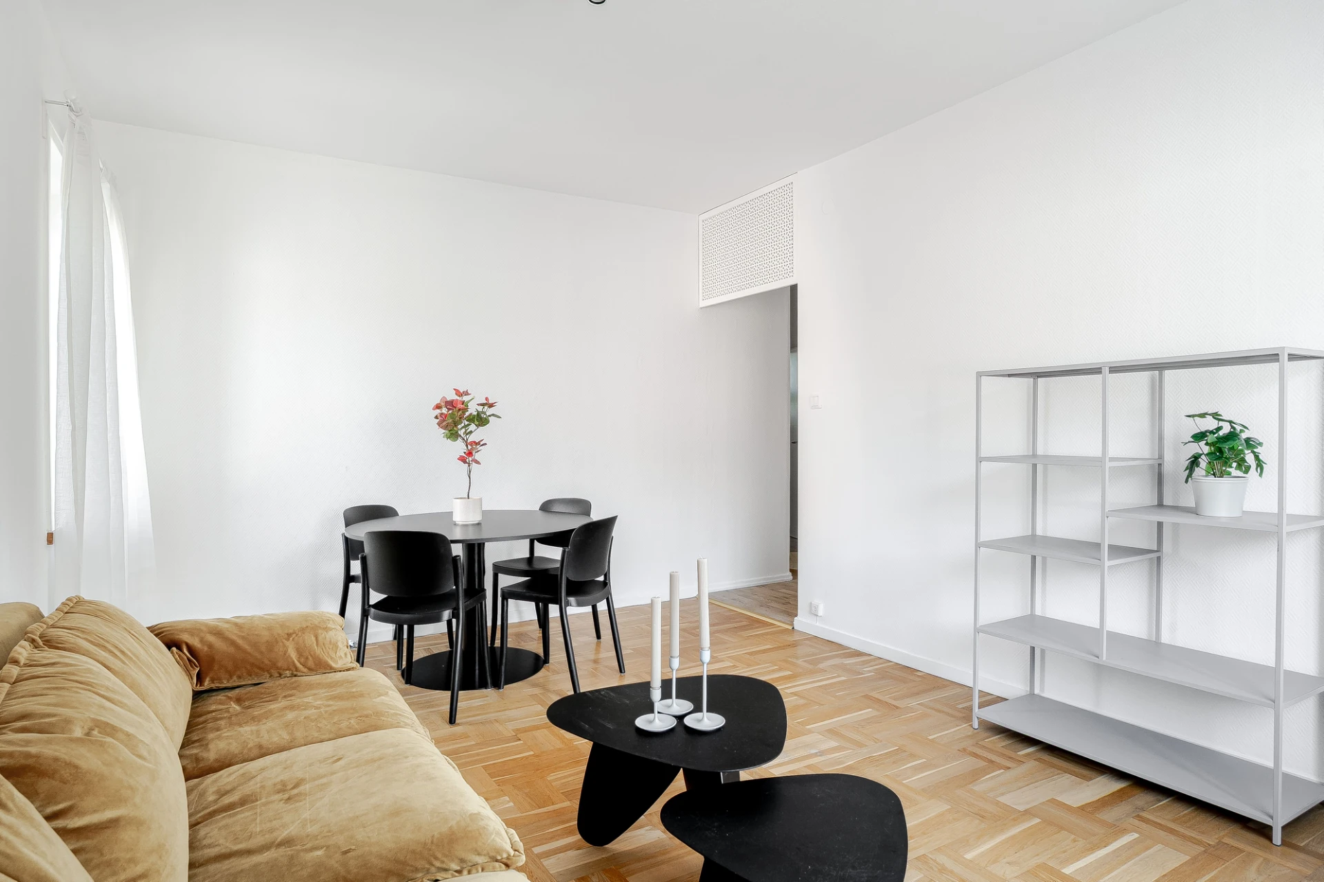 Rymligt och ljust vardagsrum med stora fönster som ger ett generöst ljusinsläpp. Här finns gott om plats för både soffgrupp och matbord. Från rummet nås bostadens balkong, en perfekt plats att njuta av soliga dagar och ljumma sommarkvällar.