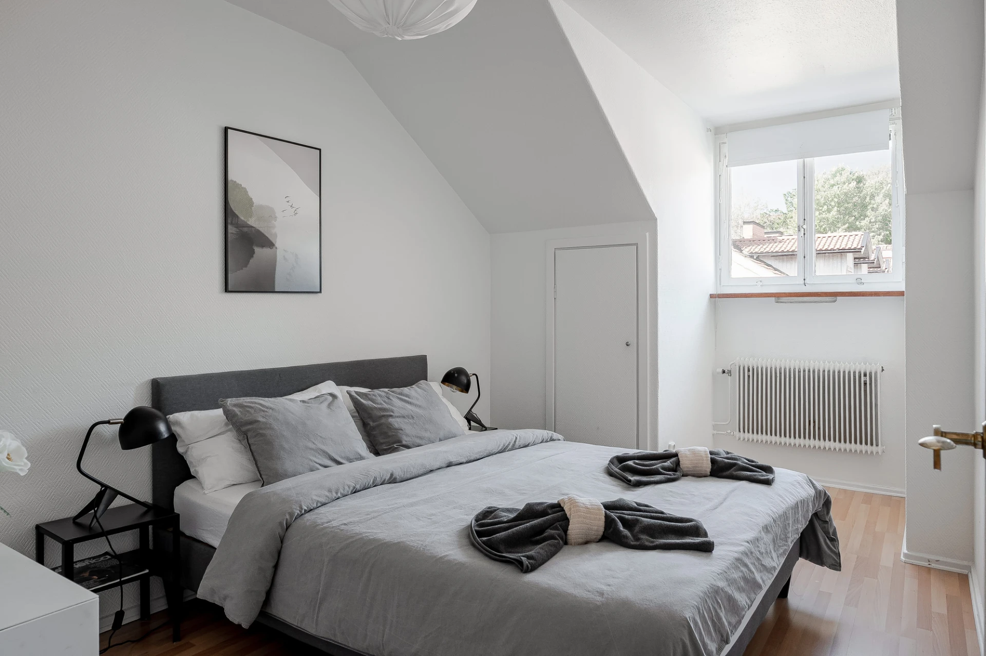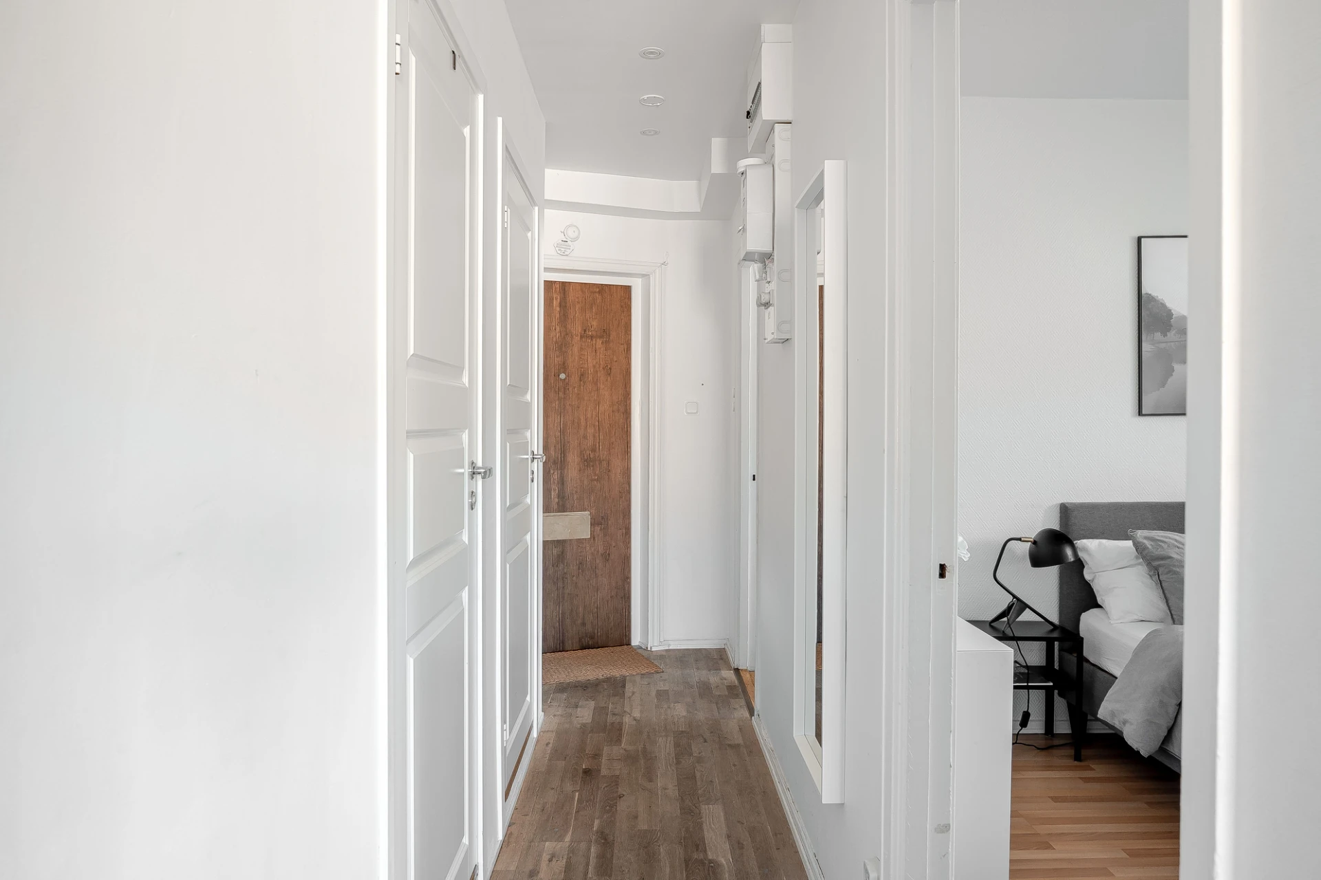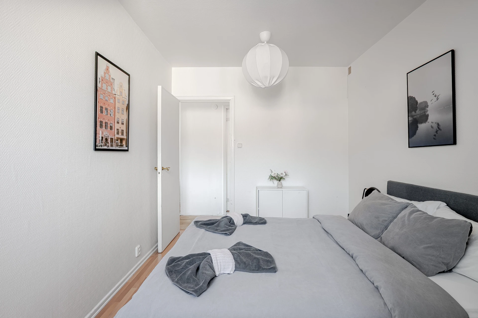 Rofyllt och generöst tilltaget sovrum med plats för dubbelsäng och nattduksbord. Här sover du ostört, och det höga läget gör rummet extra ljust och privat. Här finns även en platsbyggd garderob.