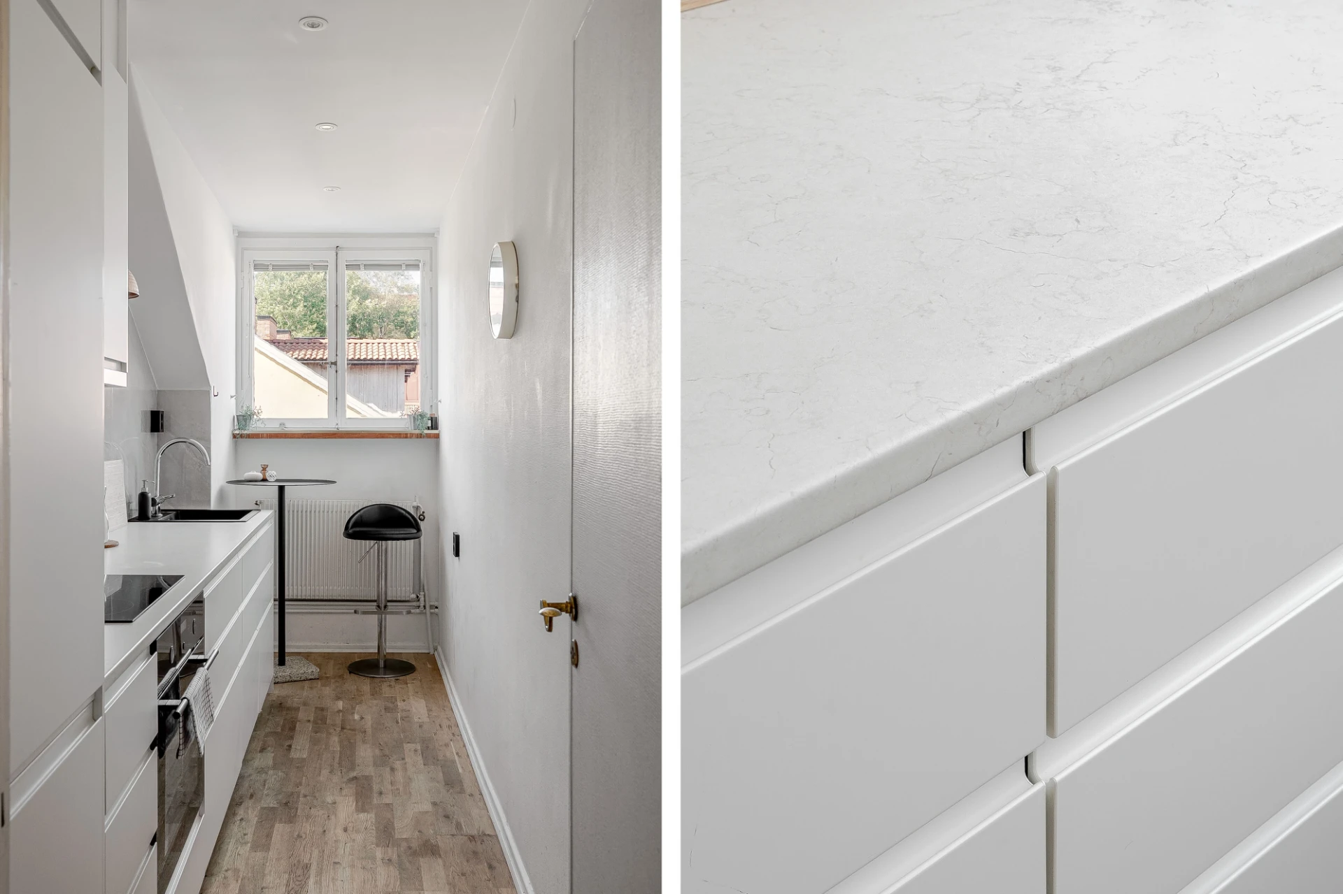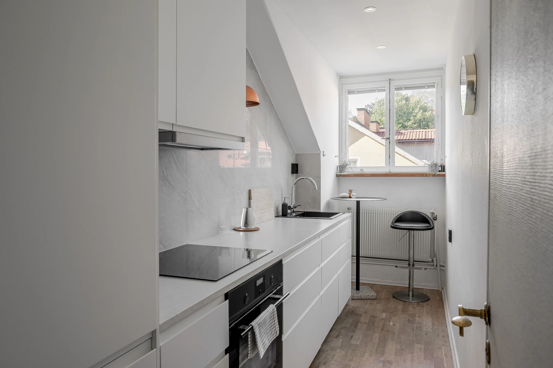 Vardagsrummet är bostadens naturliga samlingspunkt med gott om plats för både soffa, matgrupp och hemmakontor vid behov. Det höga läget ger en känsla av frihet och bjuder på vacker utsikt över omgivningarna, utan någon granne ovanför. Det funktionella köket är välutrustat med goda arbetsytor och förvaringsmöjligheter, och lämnar utrymme för en mindre matplats om så önskas. Sovrummet är rofyllt med plats för dubbelsäng, garderober och annan möblering. Badrummet är helkaklat med stilrena ytskikt. Bostaden erbjuder även en praktisk hall.
