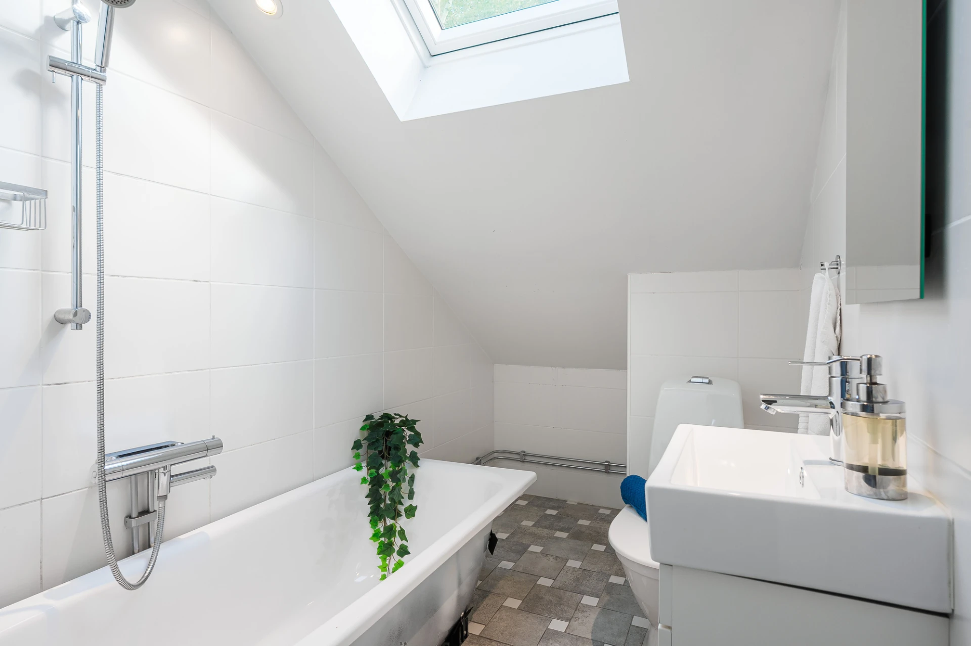 Stilrent helkaklat badrum utrustat med badkar, wc, tvättställskommod och spegel. Fräscha materialval och en lättskött yta gör det till ett bekvämt och praktiskt rum i vardagen.