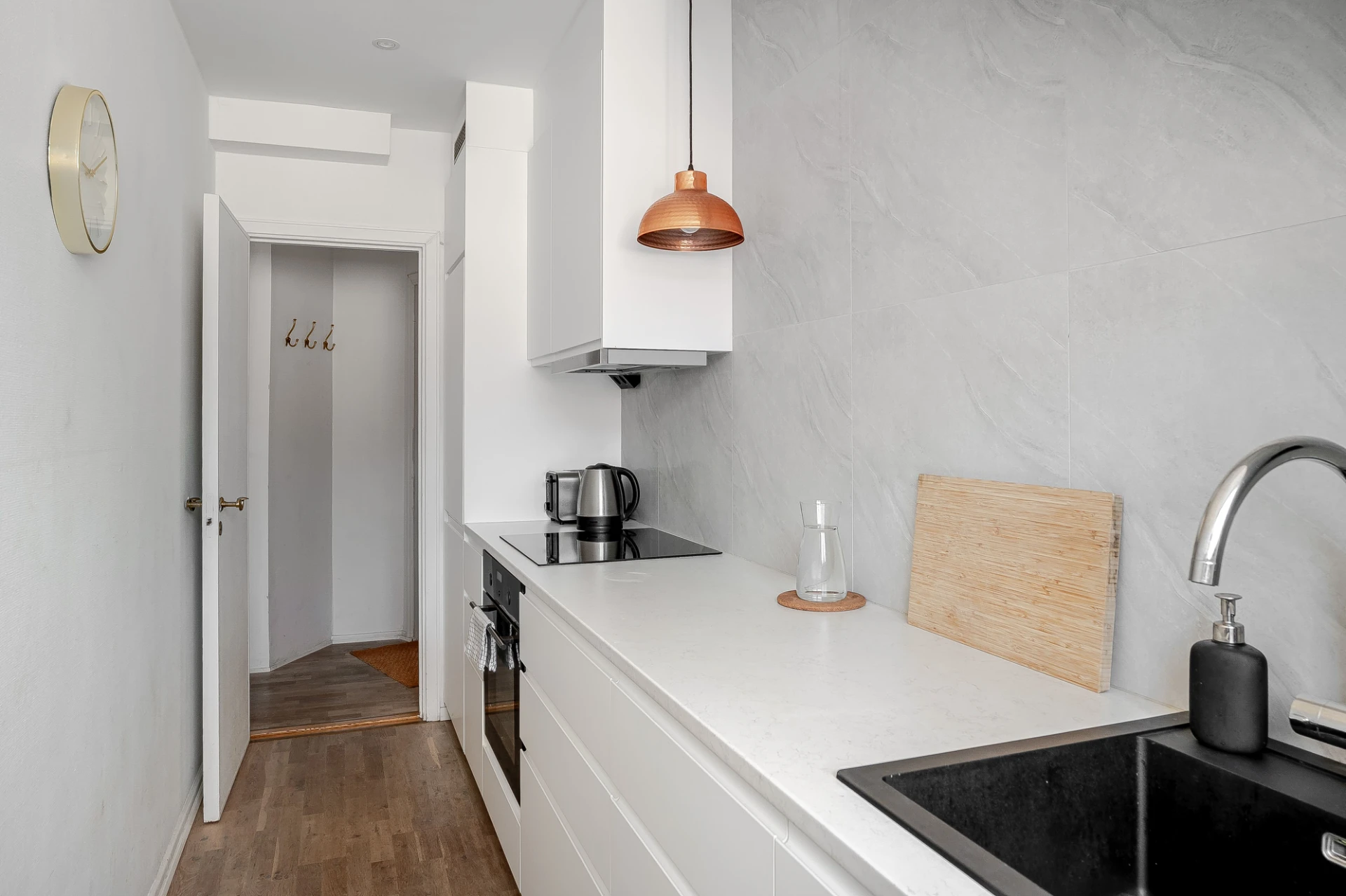 Välplanerat och funktionellt kök med god förvaring i skåp och lådor samt bra arbetsytor för matlagning. Köket erbjuder plats för mindre matbord och har en trivsam atmosfär. Utrustat med kyl/frys, spishäll, ugn och fläkt.