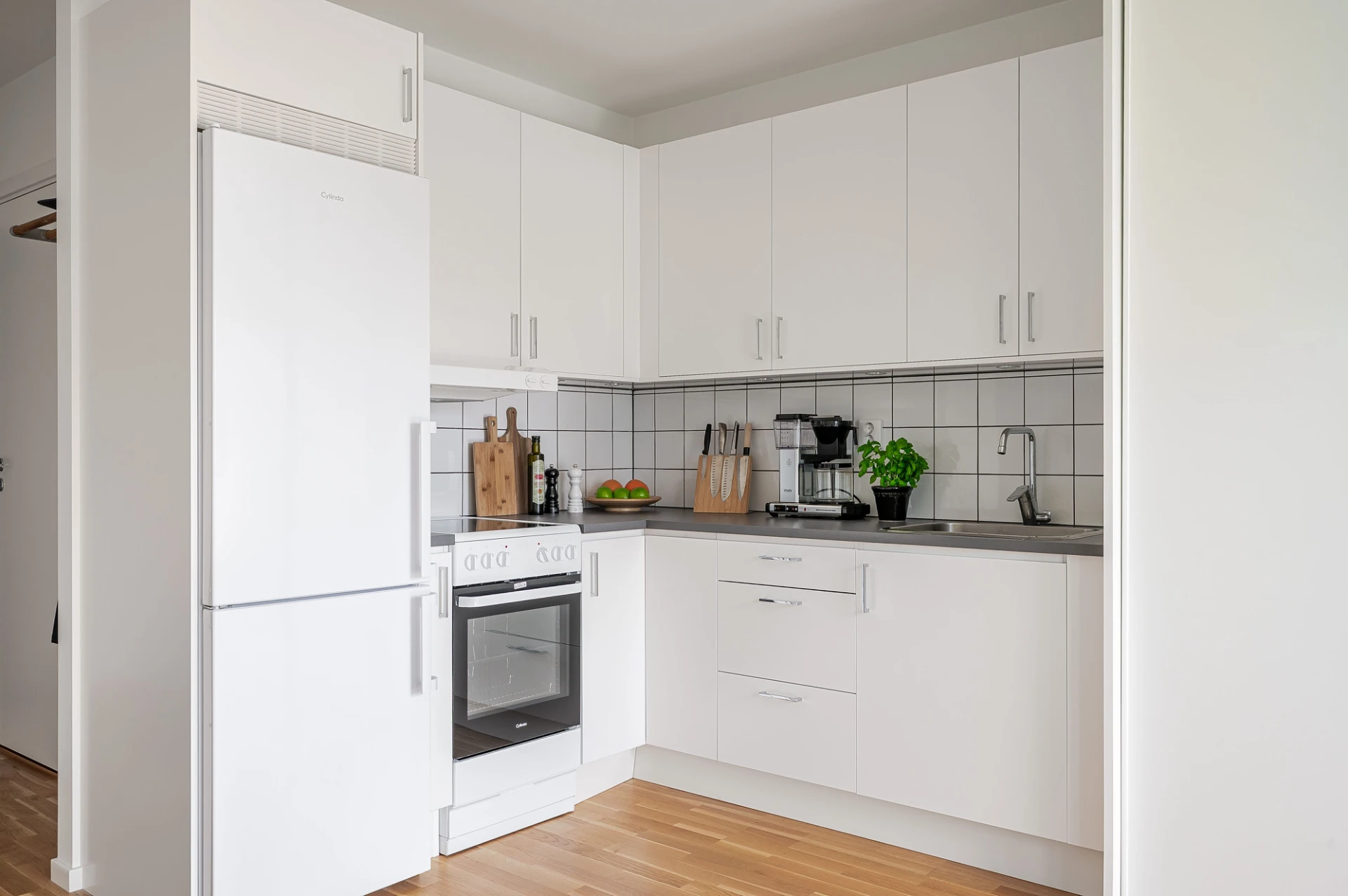 Modernt och stilrent kök med släta luckor, integrerade vitvaror och gott om arbetsyta. Här finns både design och funktion i fokus. Köket är utrustat med kyl/frys, ugn och fläkt.