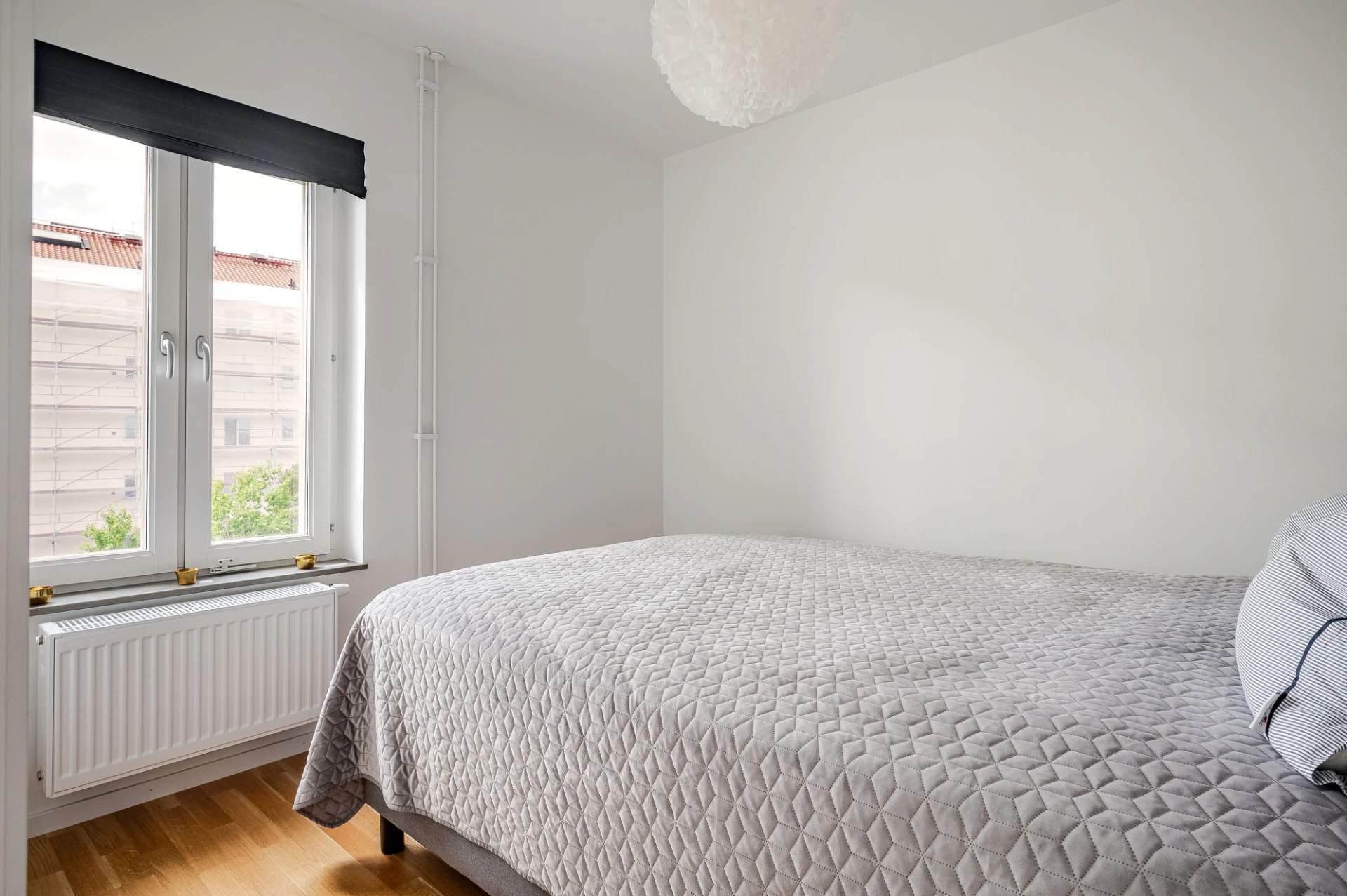 Rogivande sovrum i ljus färg med plats för bredare säng.