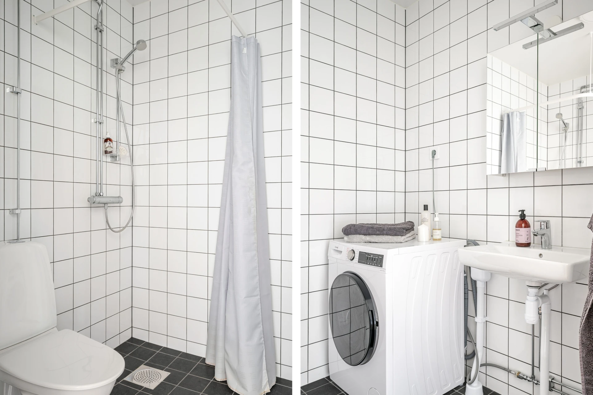 Helkaklat och fräscht badrum utrustat med wc, dusch, tvättställ, spegelskåp och tvättmaskin. Neutrala färger med grått klinkergolv och vitkaklade väggar.