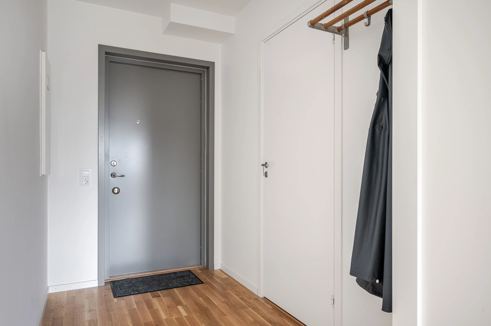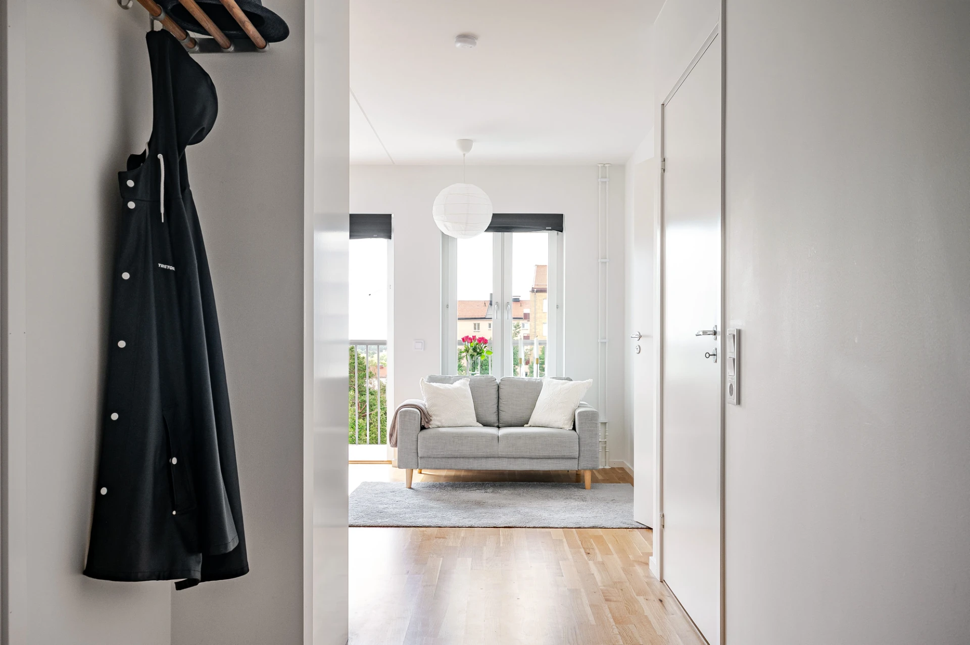 Praktisk hall med plats för ytterkläder vid hatthylla. Redan från hallen känns ljuset av som är bestående bostaden genomgående.