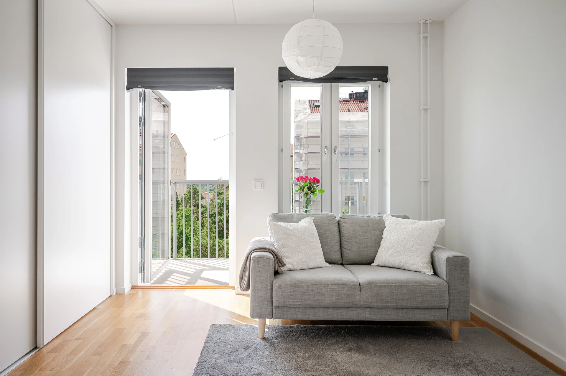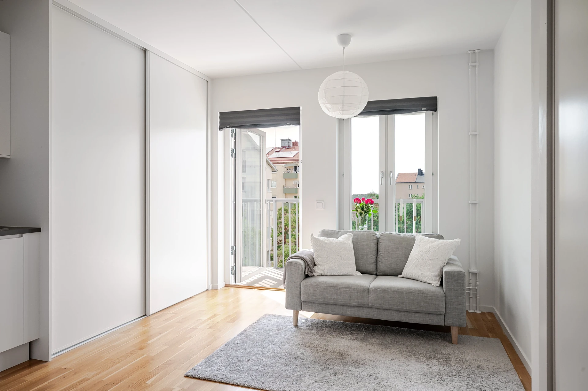 Ljust vardagsrum i öppen planlösning mot köket, perfekt för både vardagsliv och sociala tillställningar. De stora fönsterpartierna släpper in rikligt med ljus och bjuder på en hänförande utsikt som ger rummet en unik känsla av rymd. Från vardagsrumsdelen nås den härliga balkongen. I rummet finns bra förvaringslösning i garderob bakom skjutdörrar.