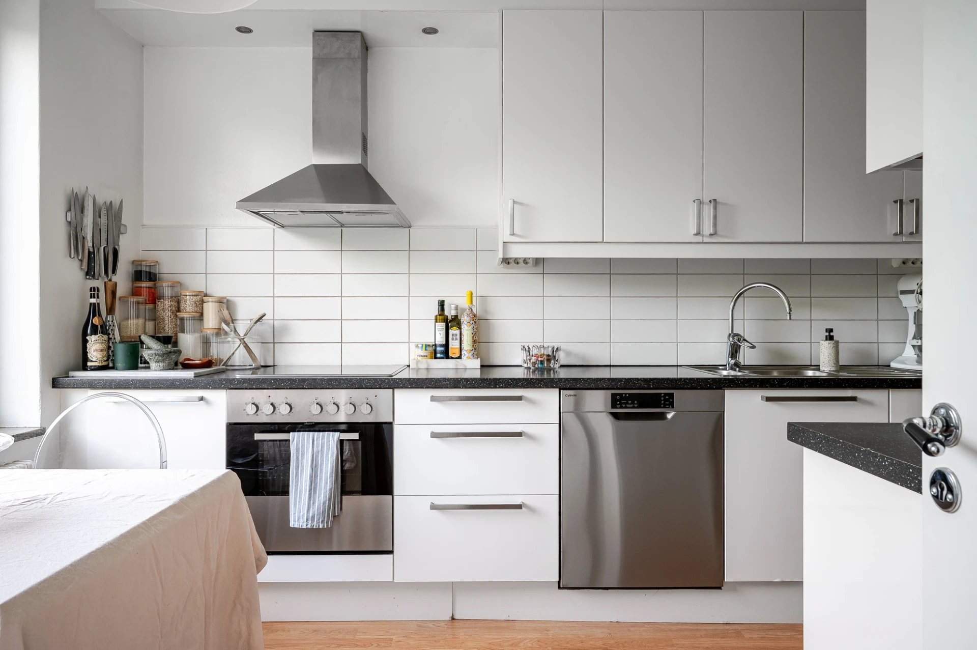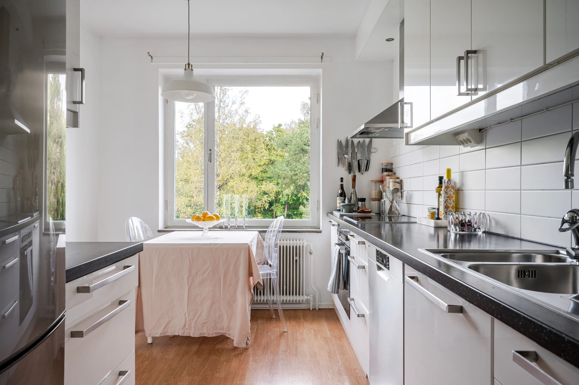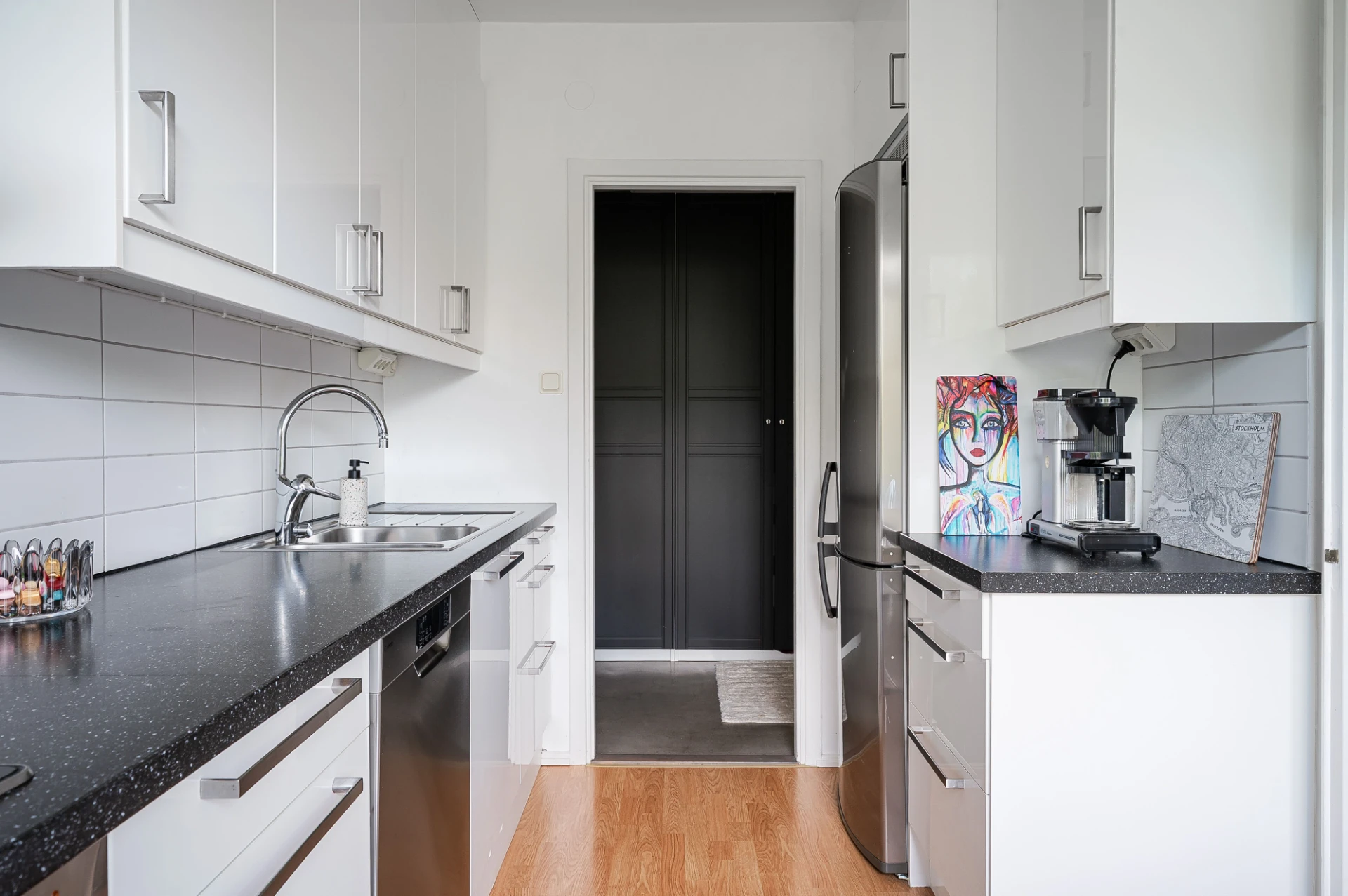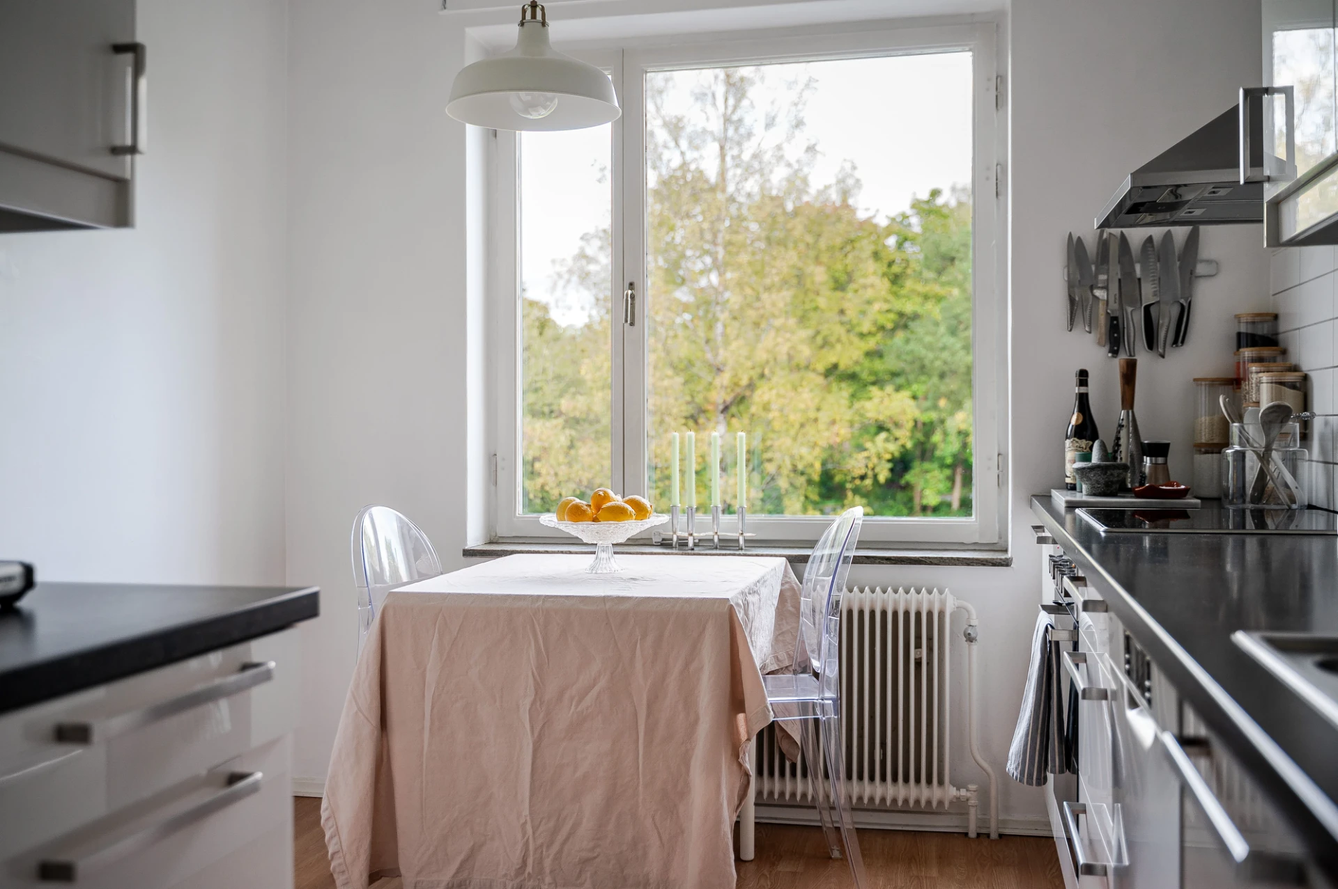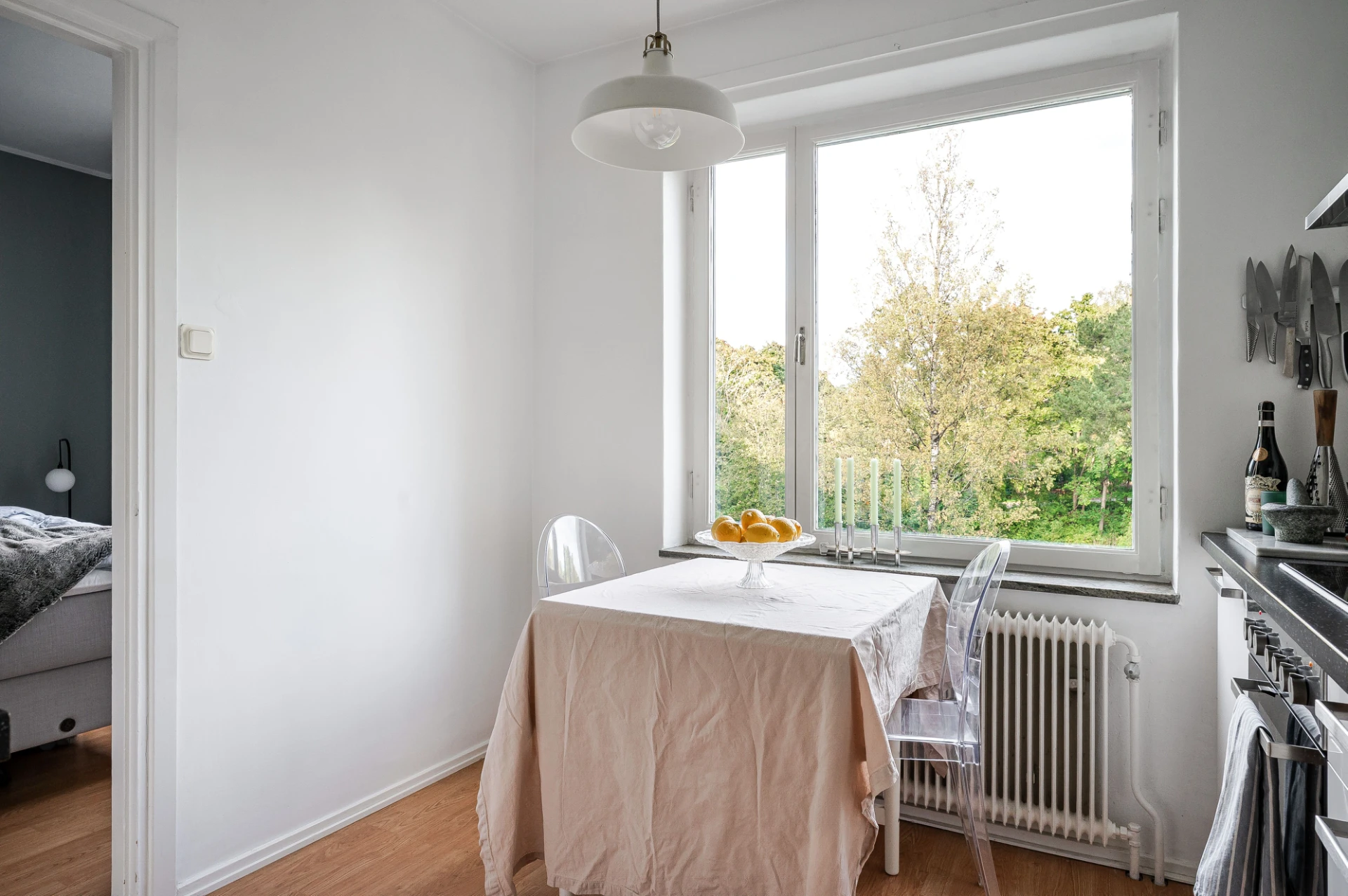 Praktiskt kök med bra arbetsytor och gott om skåpförvaring. Här finns plats för matbord för ca 4 personer vid fönstret. Fint ljusinsläpp och utsikt mot gården. Köket är utrustat med spis, ugn, diskmaskin, kyl/frys och diskho.