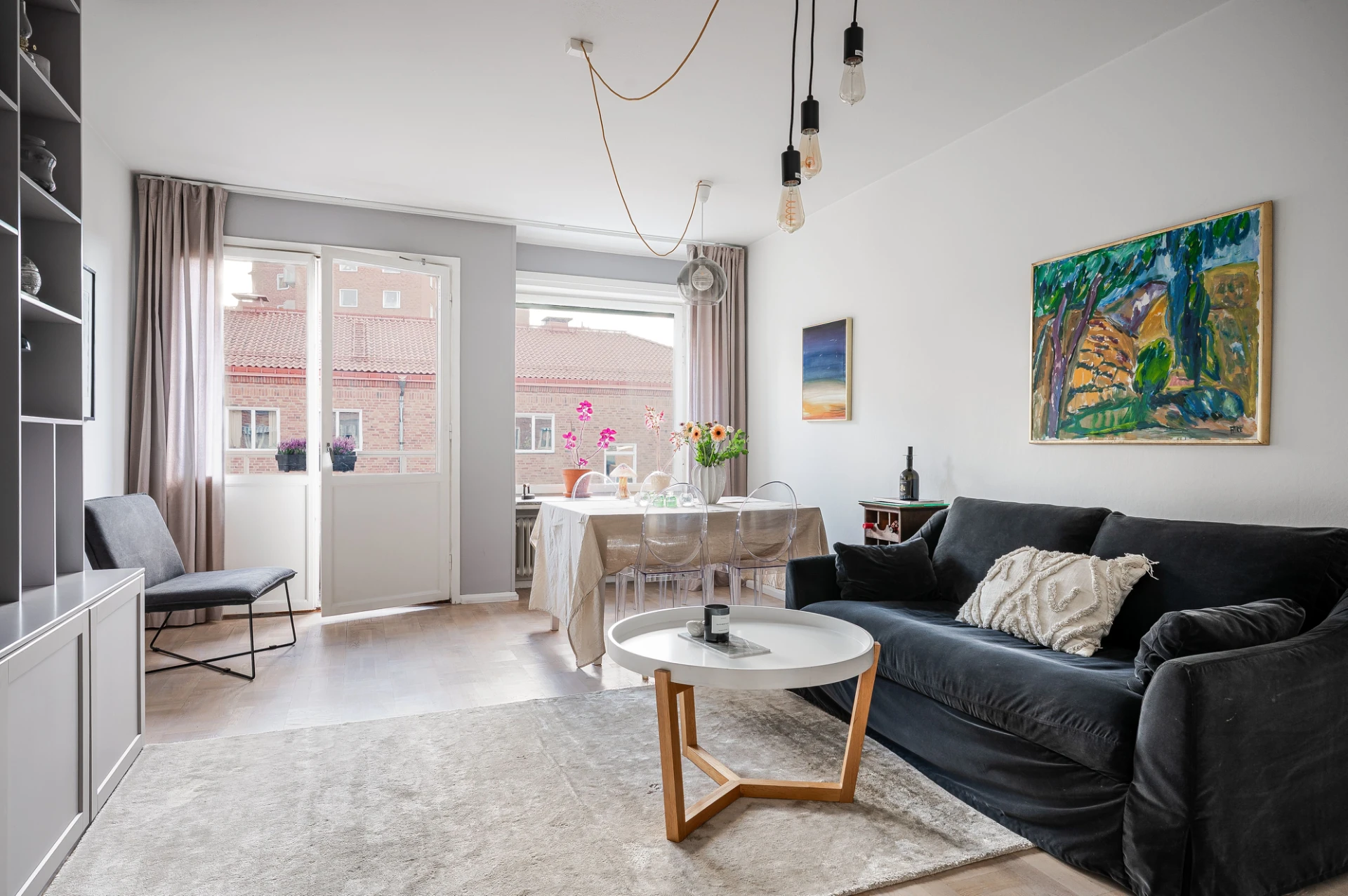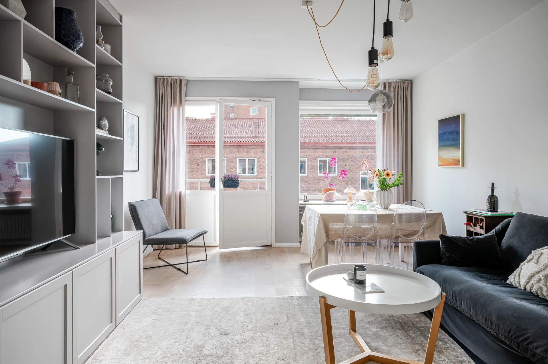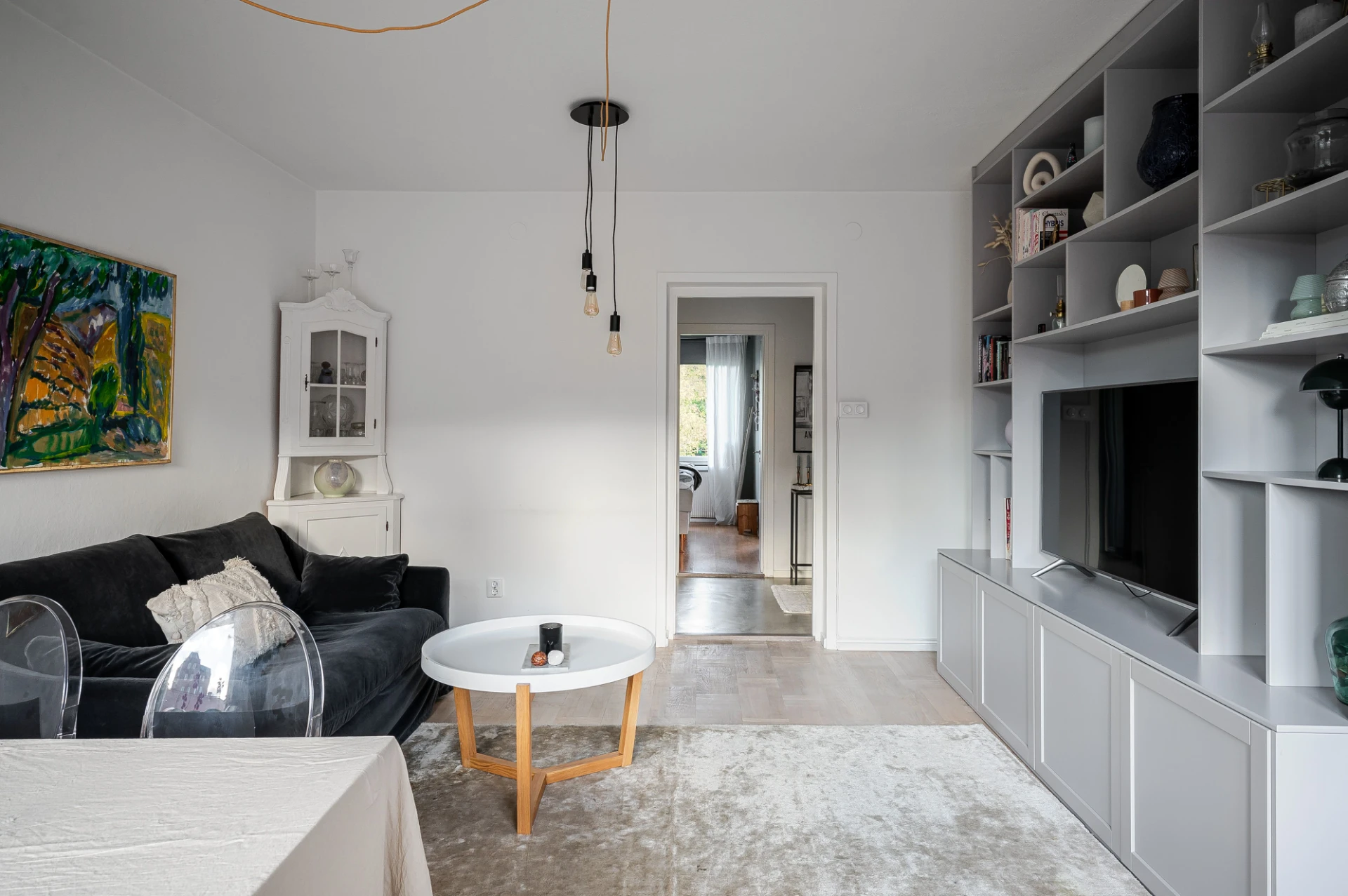 Ljust och luftigt vardagsrum med generösa ytor för soffgrupp, mediamöbel och annan önskad möblering. Från vardagsrummet nås den mysiga balkongen, en perfekt plats att njuta av morgonkaffet eller kvällshäng under sommarhalvåret. Här finns även en dekorativ platsbyggd bokhylla.