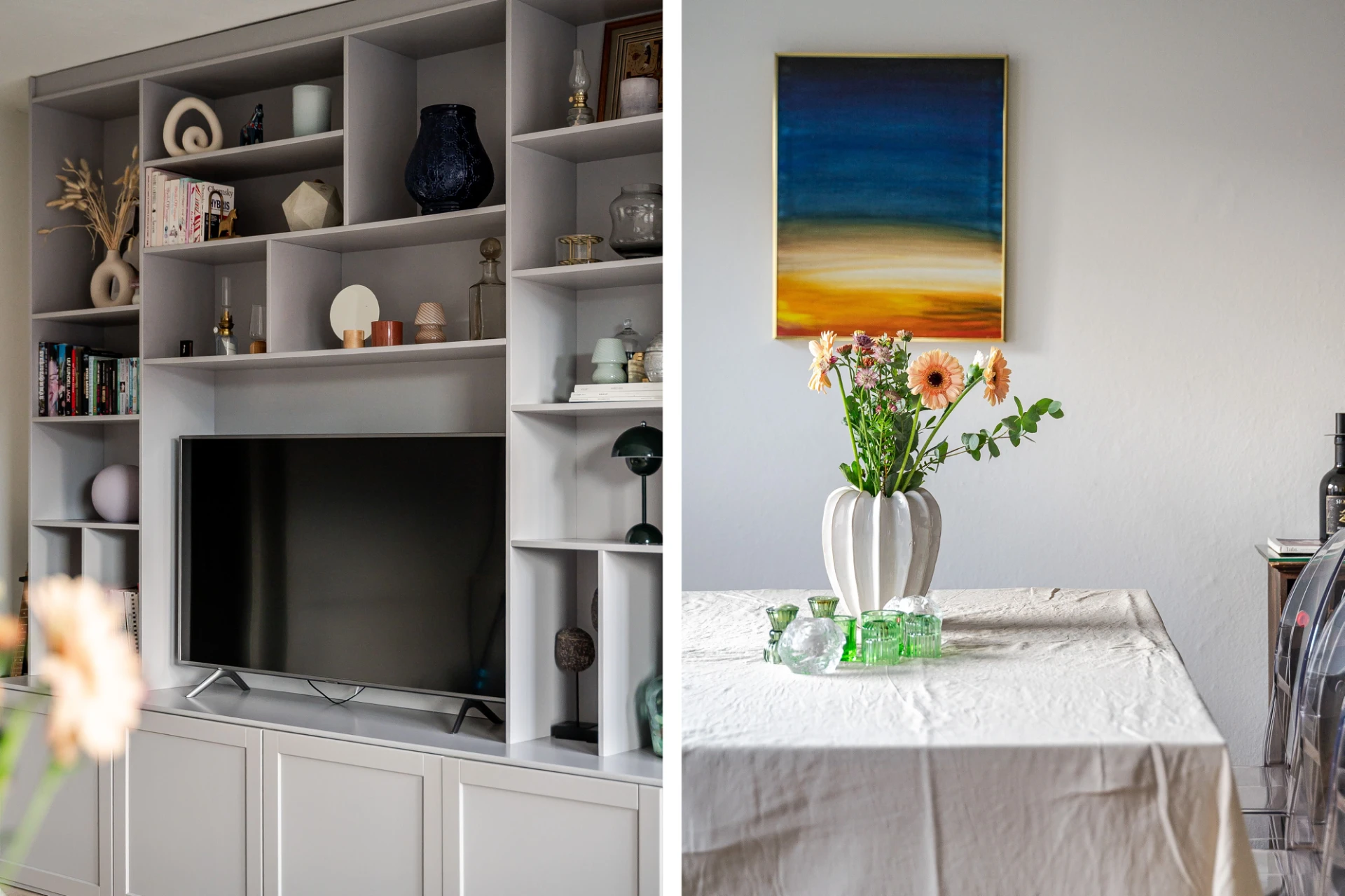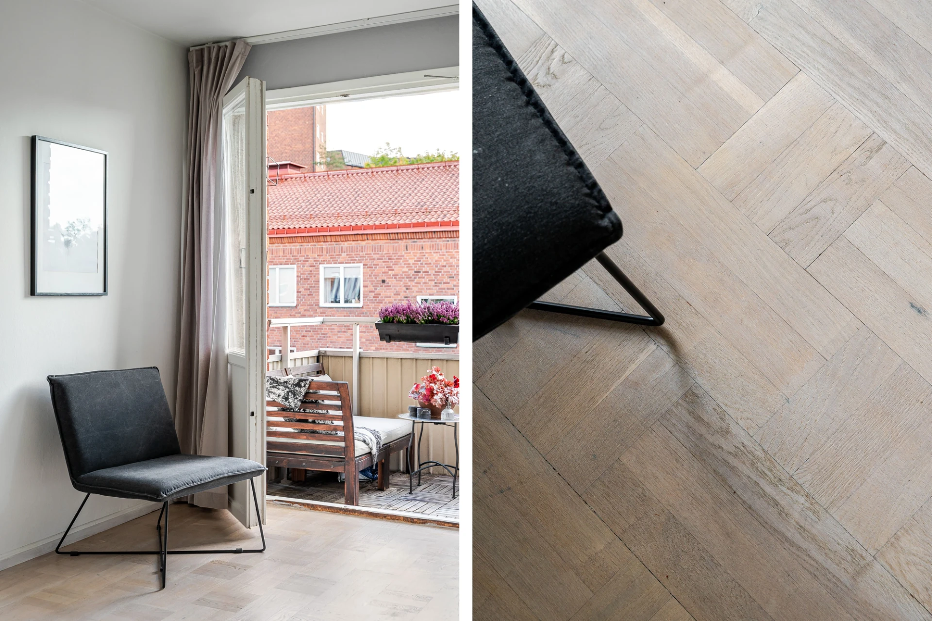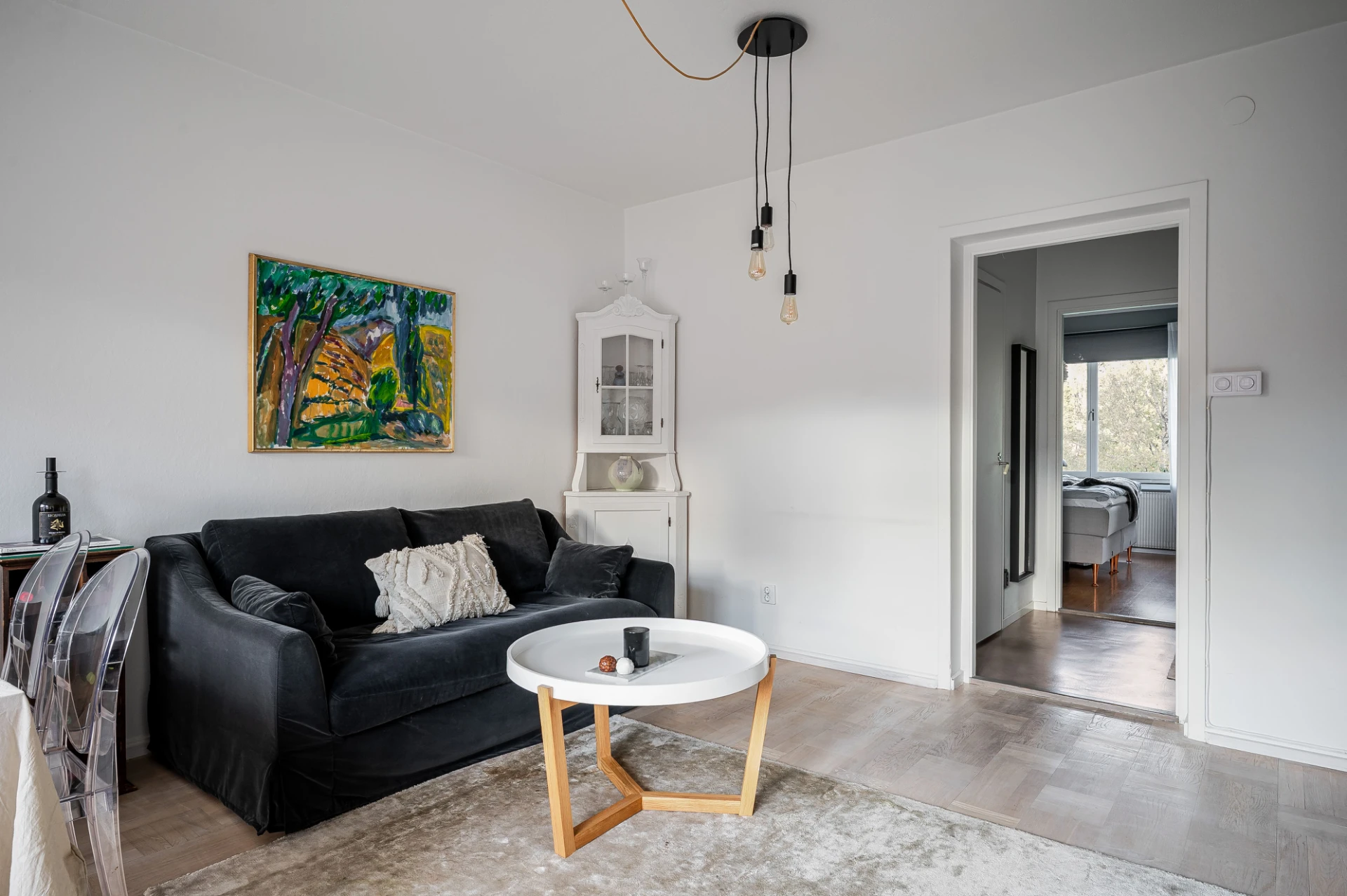 Ljust och luftigt vardagsrum med generösa ytor för soffgrupp, mediamöbel och annan önskad möblering. Från vardagsrummet nås den mysiga balkongen, en perfekt plats att njuta av morgonkaffet eller kvällshäng under sommarhalvåret. Här finns även en dekorativ platsbyggd bokhylla.