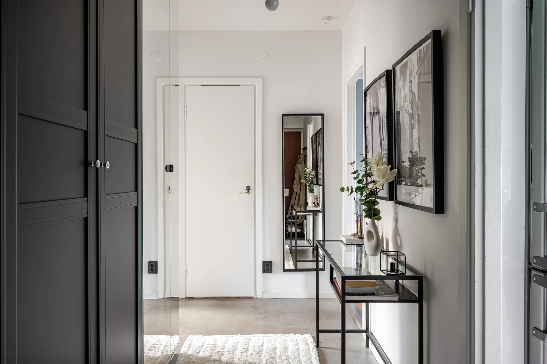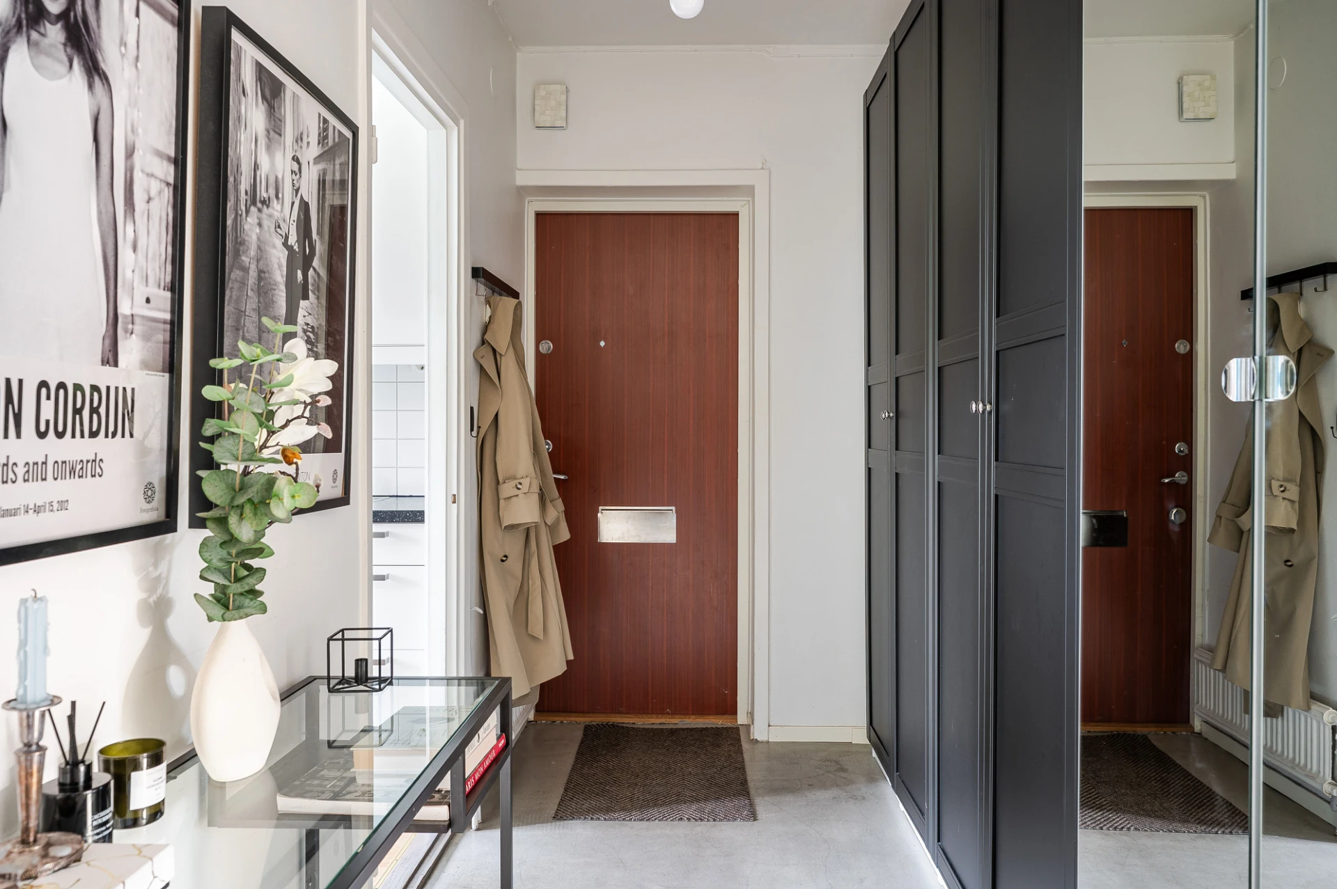 Välkomnande hall med plats för avhängning och ytterligare förvaring i garderob. Ljusa väggar och praktiskt golv gör entrén både stilren och lätt att hålla i ordning.