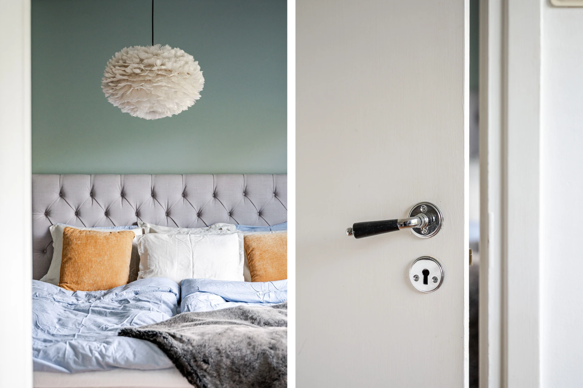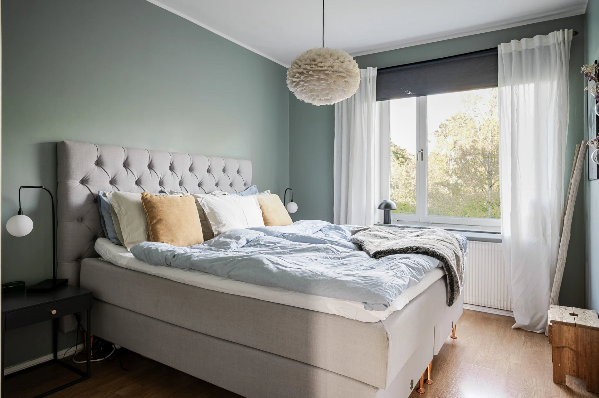 Rofyllt sovrum med plats för dubbelsäng, nattduksbord och arbetsplats eller byrå.