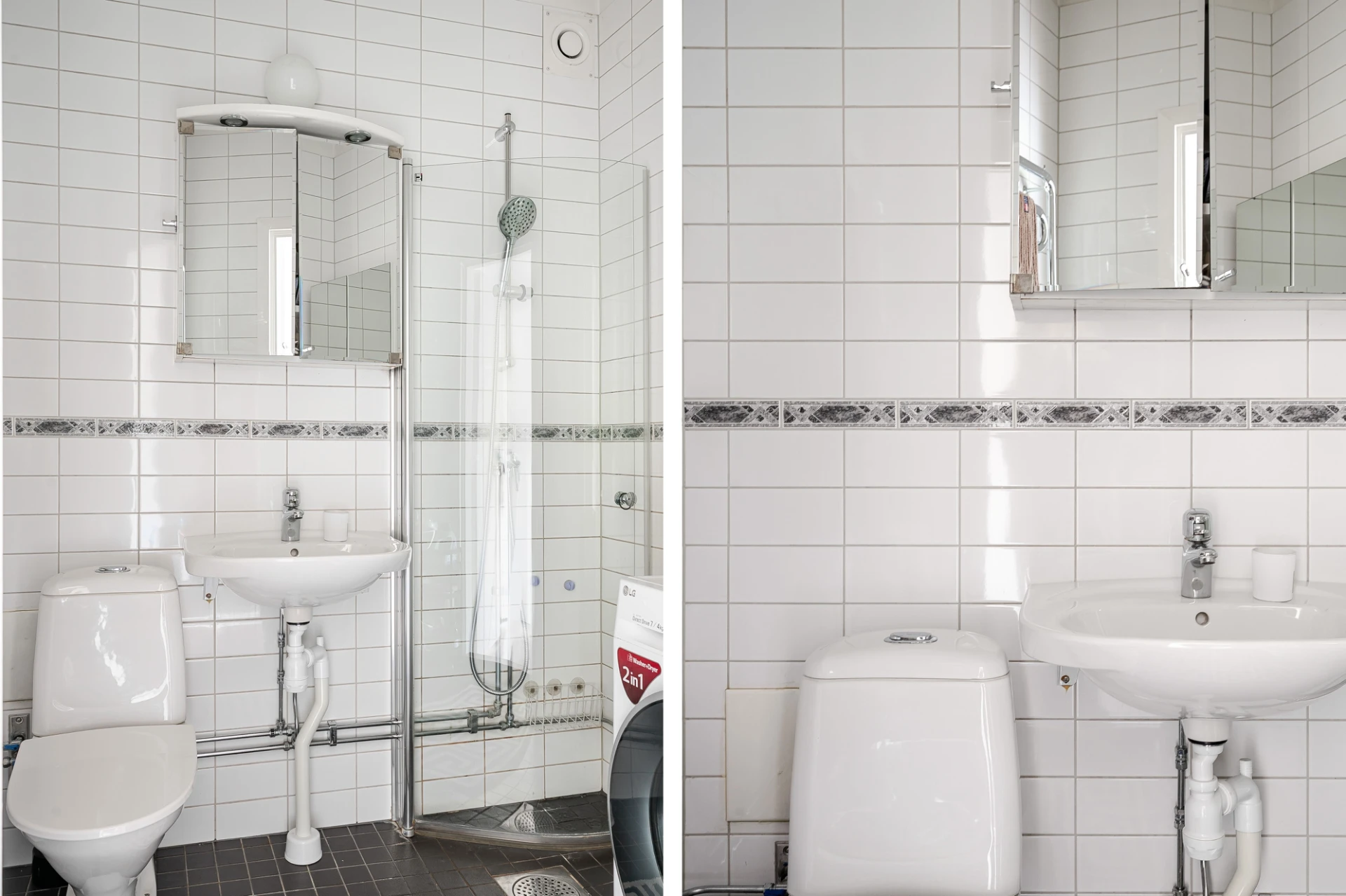 Stilrent helkaklat badrum med duschhörna, wc, handfat, kombimaskin och spegelskåp. Ljusa kakelväggar och mörk klinker på golvet skapar en modern och fräsch känsla.