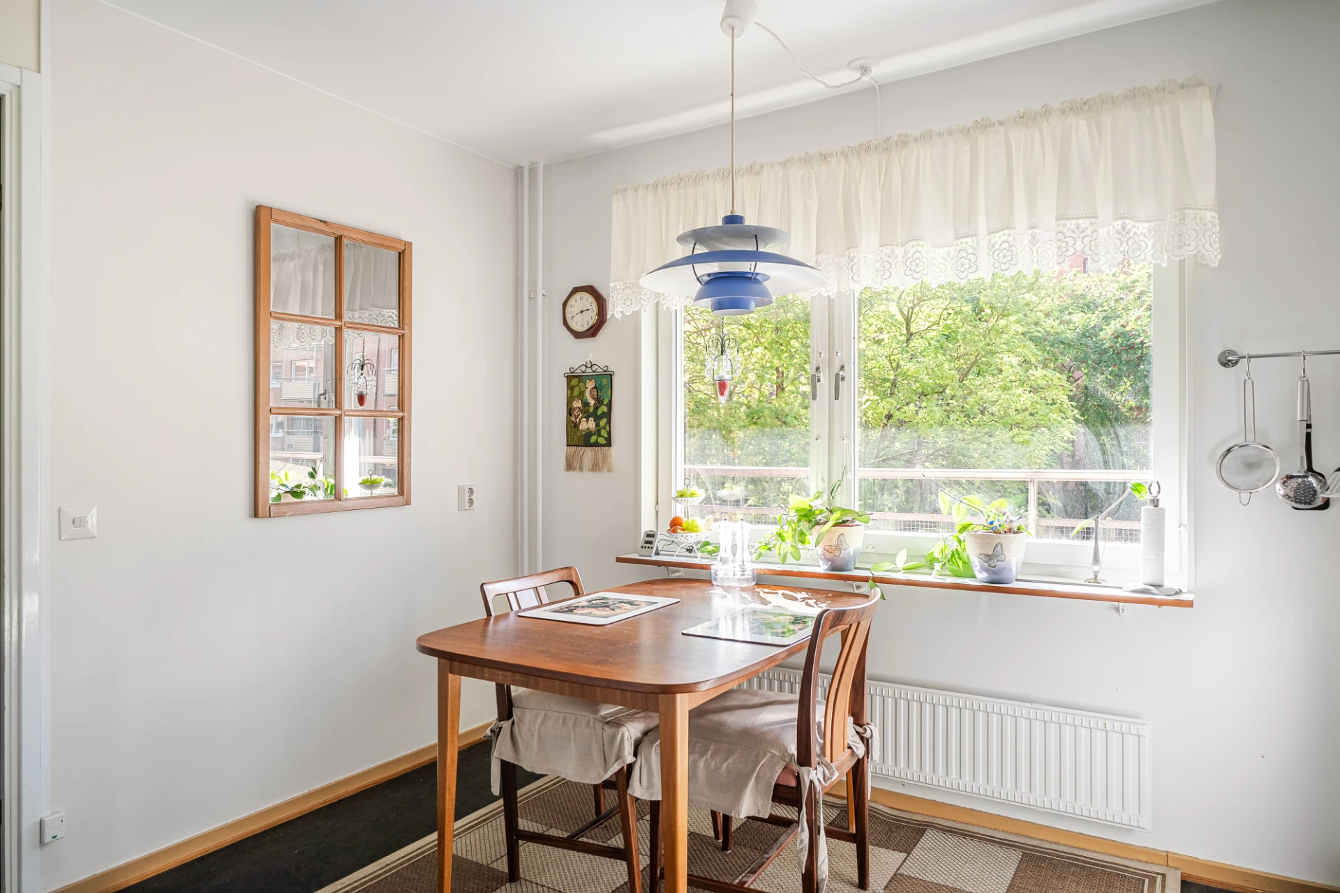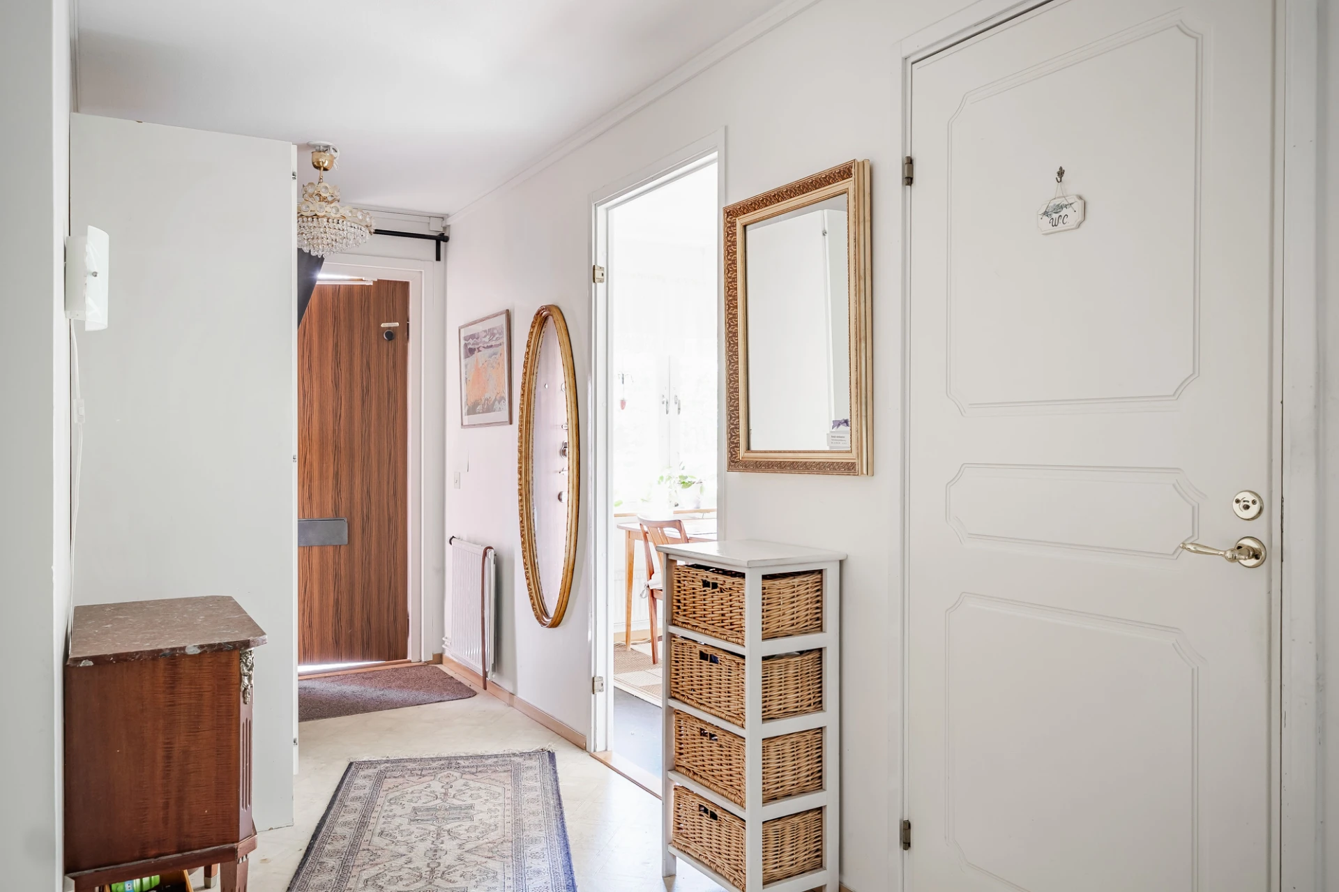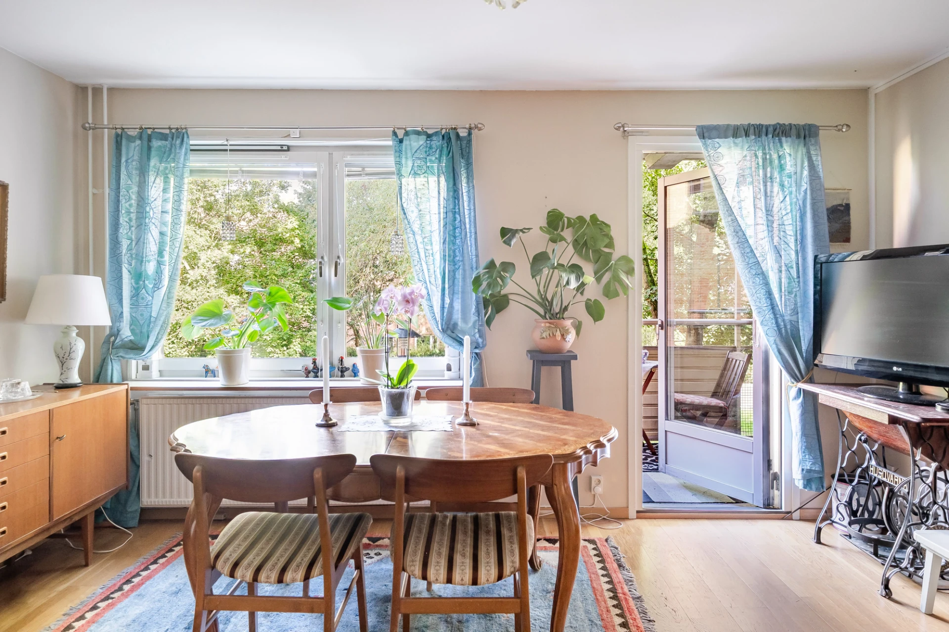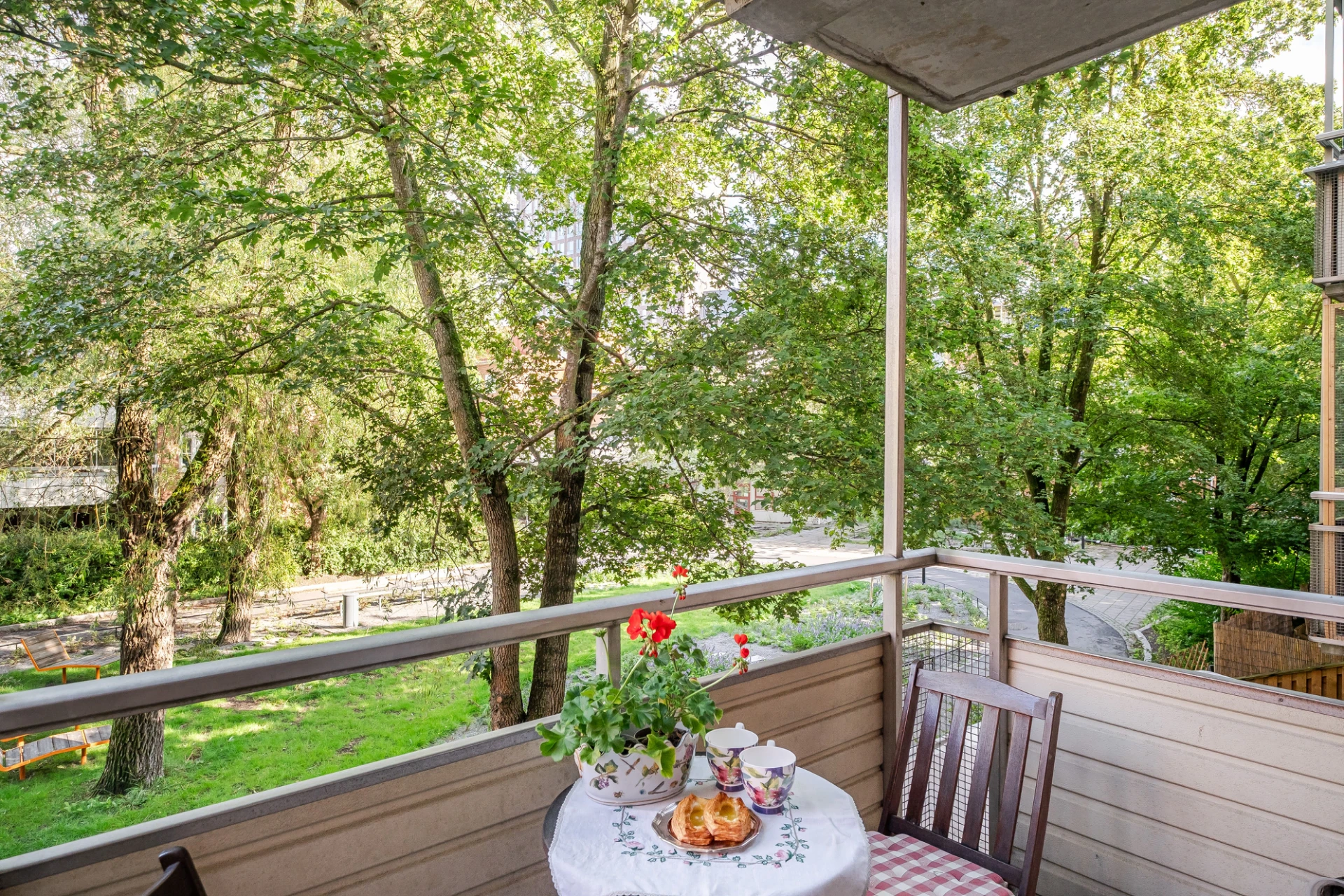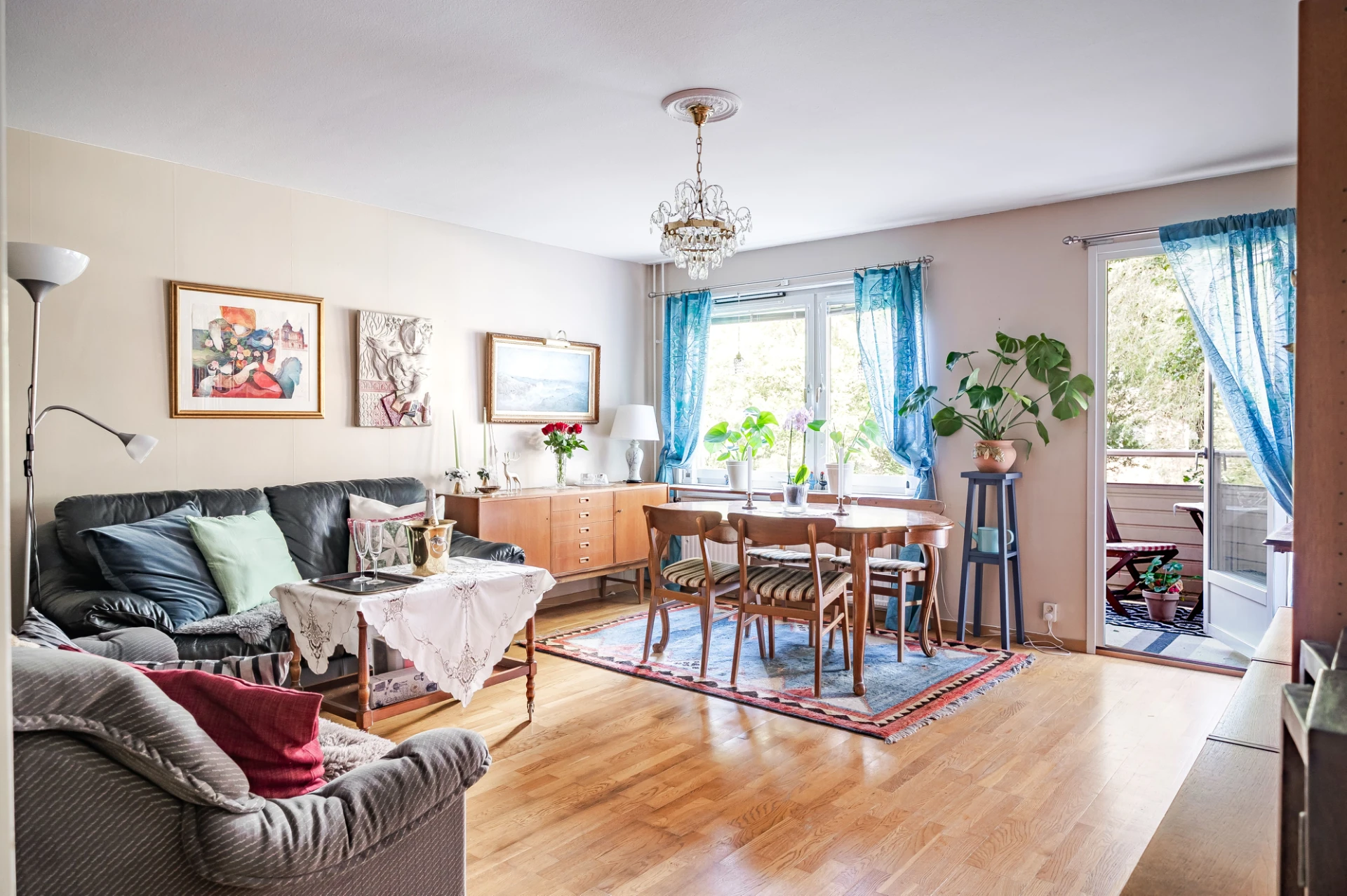 Här bor du i ett lugnt och grönt område med direkt närhet till kommunikationer, service och vacker natur. Bostaden erbjuder genomgående ljusinsläpp från två håll, tidstypiska detaljer och en härlig balkong med utsikt mot grönska – perfekt för morgonkaffet.