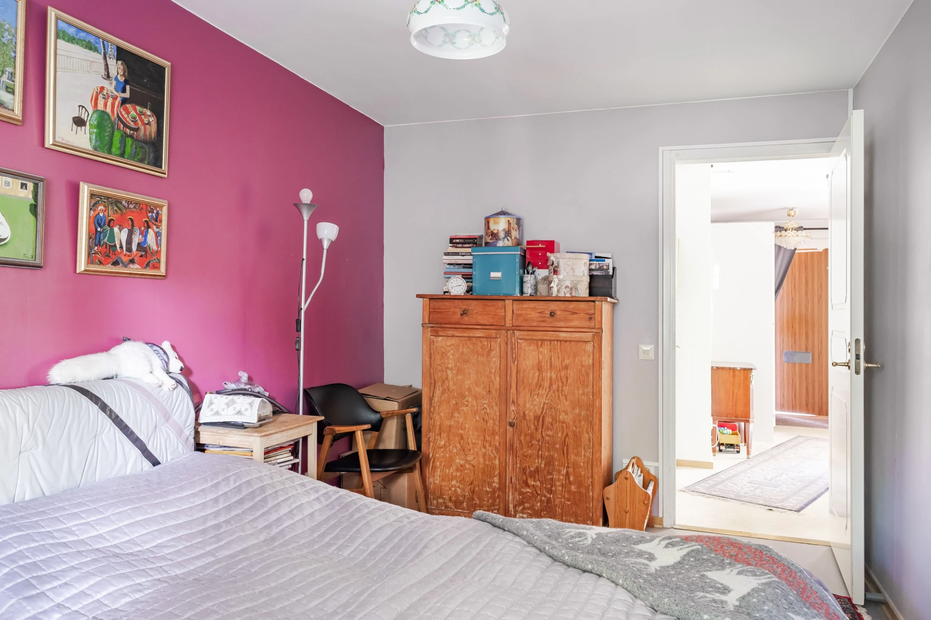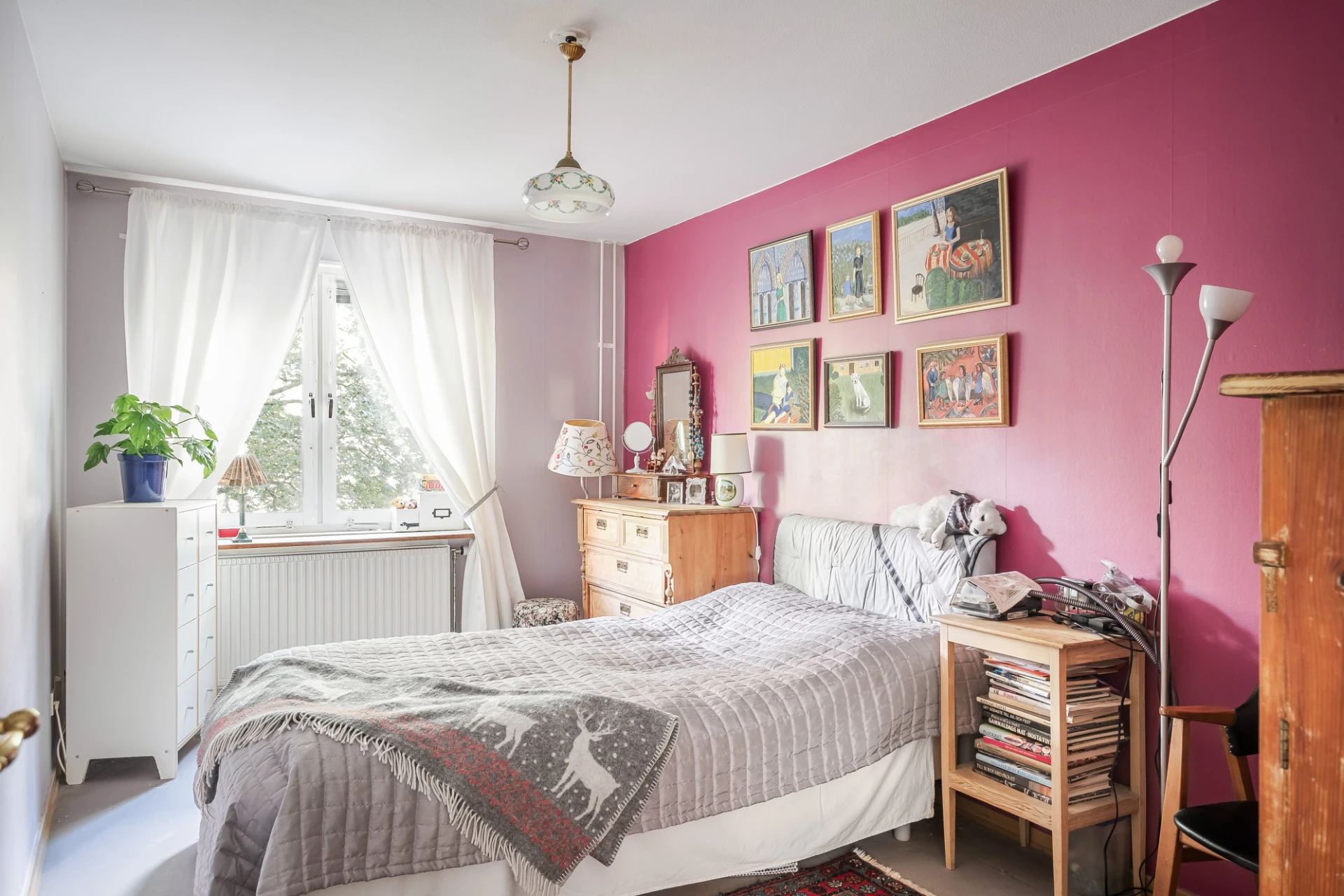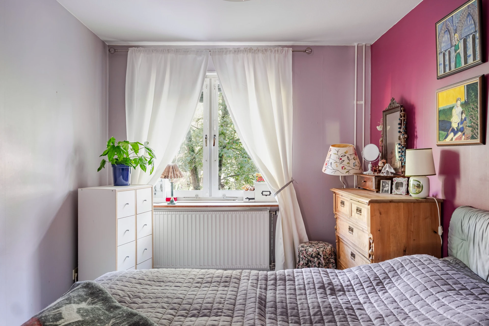 Rymligt sovrum med plats för dubbelsäng, nattduksbord och förvaringsmöbler. Fönster mot grönska ger ett rogivande intryck. Ljuslila och rosa toner på väggarna skapar en varm och personlig atmosfär.