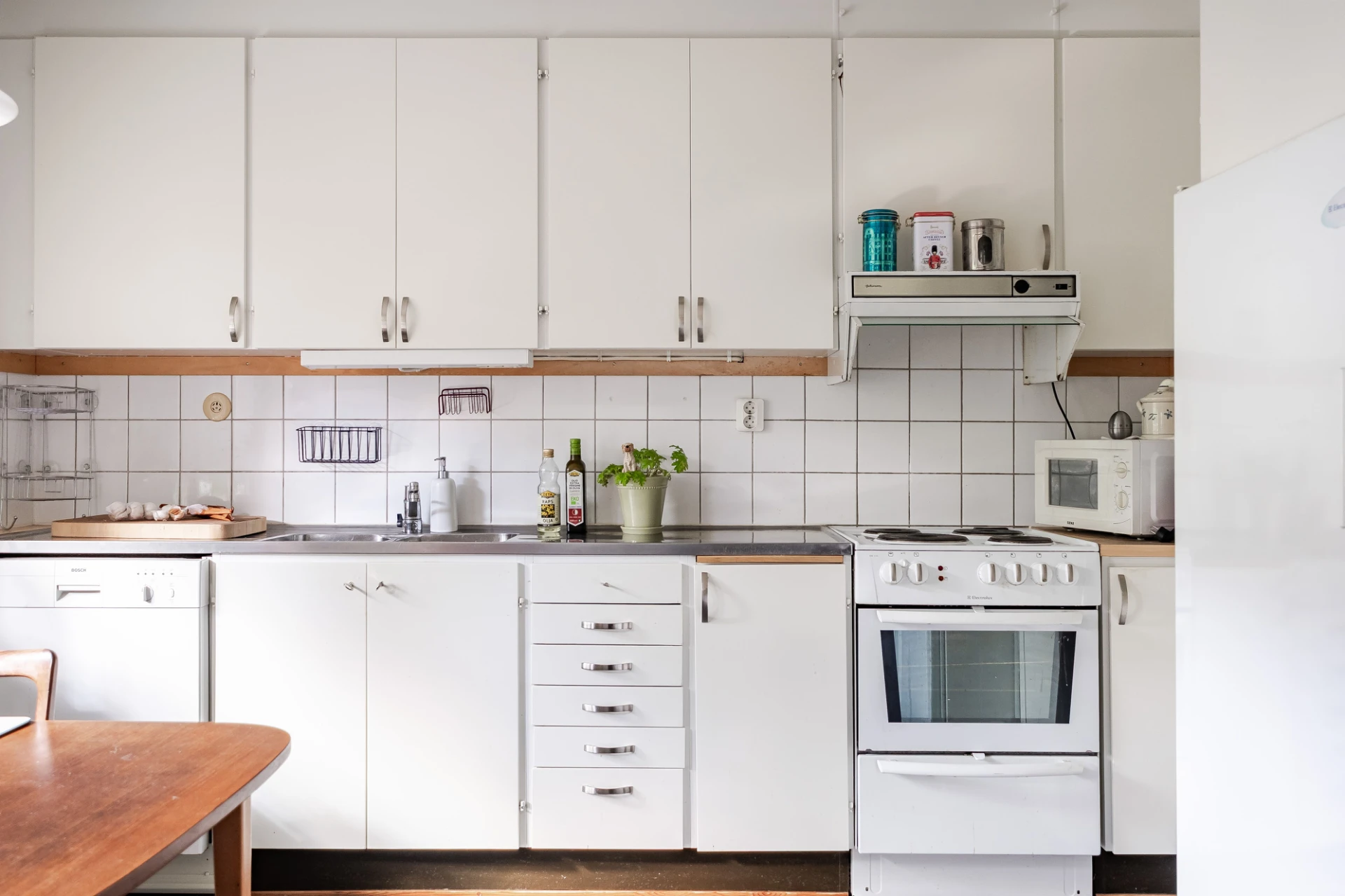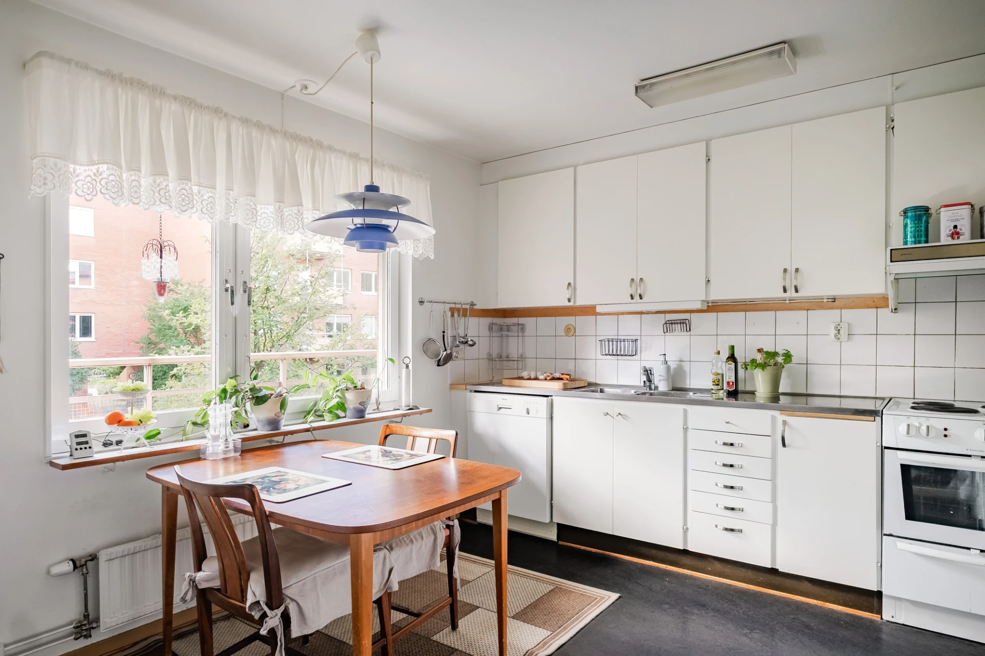 Klassiskt kök med vita skåpsluckor, goda arbetsytor. Maskinellt utrustad med hel kyl och frys, spis, diskmaskin, fläkt, diskho. Den naturliga matplatsen vid fönstret erbjuder utsikt mot gården och ger en hemtrevlig känsla.