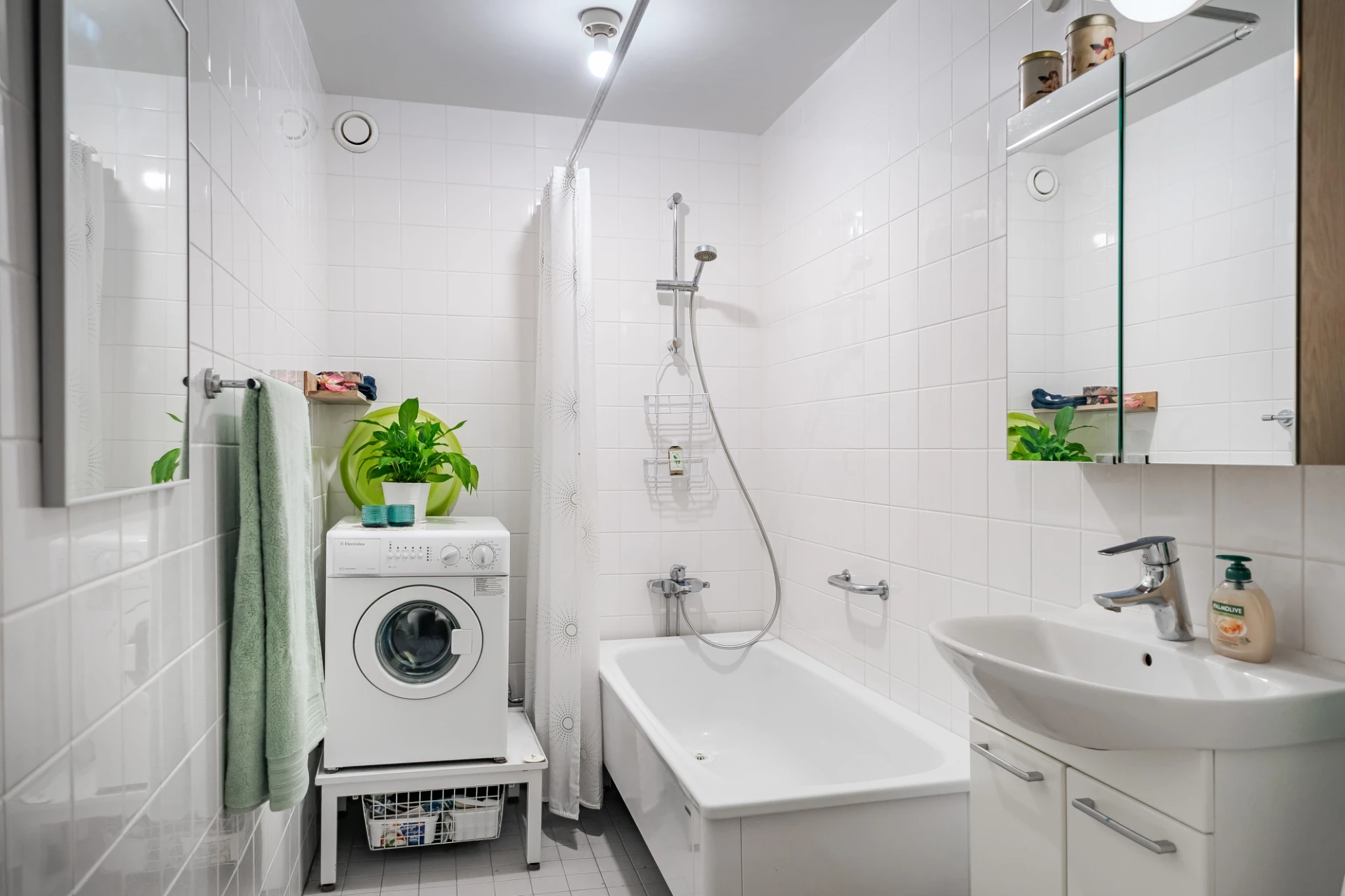 Helkaklat och stilrent badrum med badkar, dusch, handfat med kommod, spegelskåp – samt en praktisk tvättmaskin med förvaring under. Golvvärme Ett badrum med allt man behöver i vardagen. Renoverat 2020