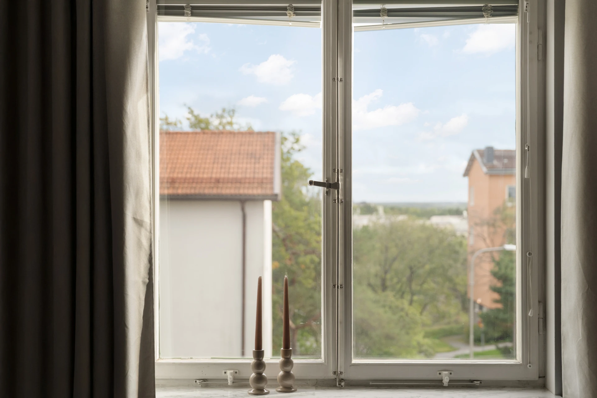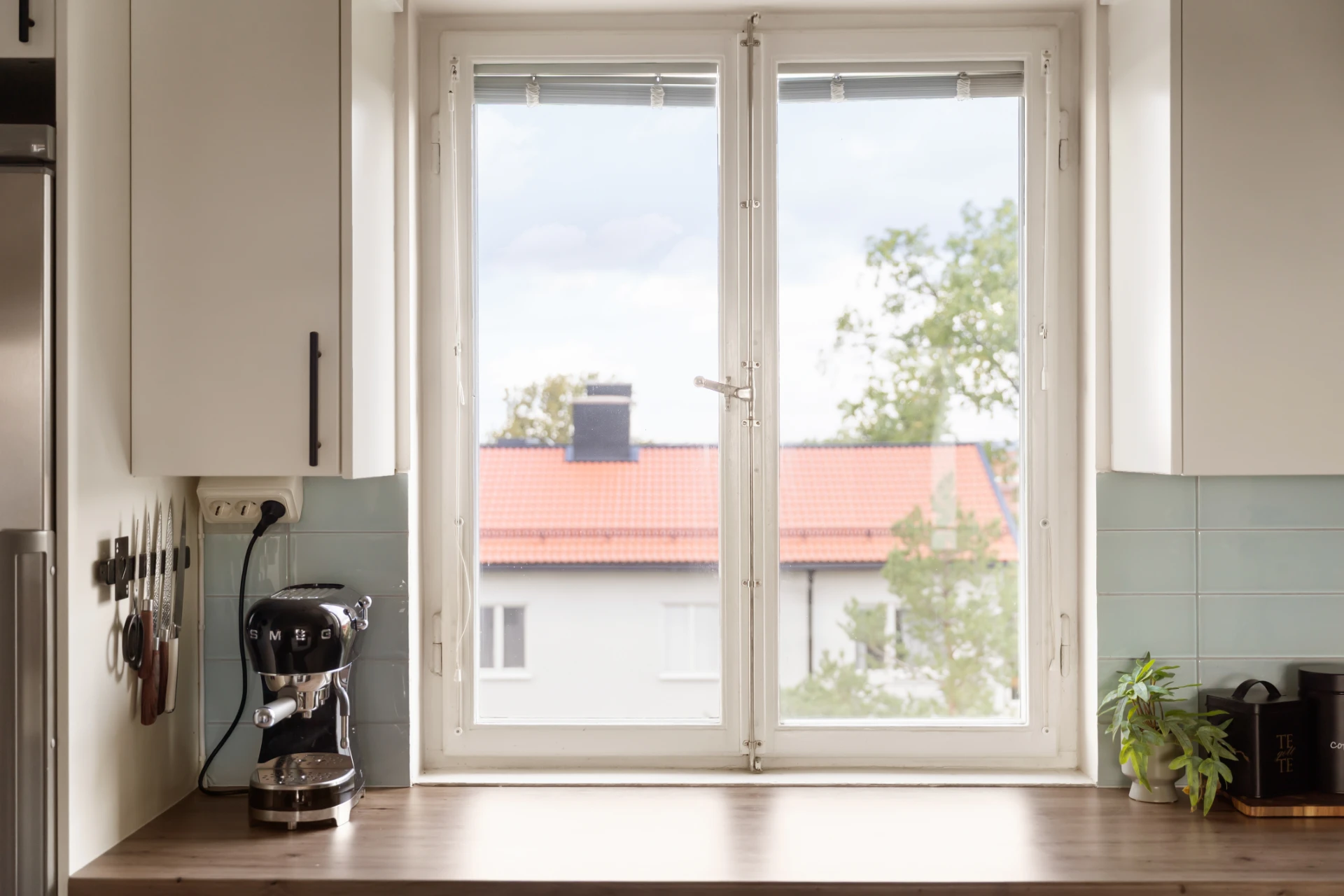 2023 Fönster och balkongdörrar på södra sidan av huset.